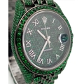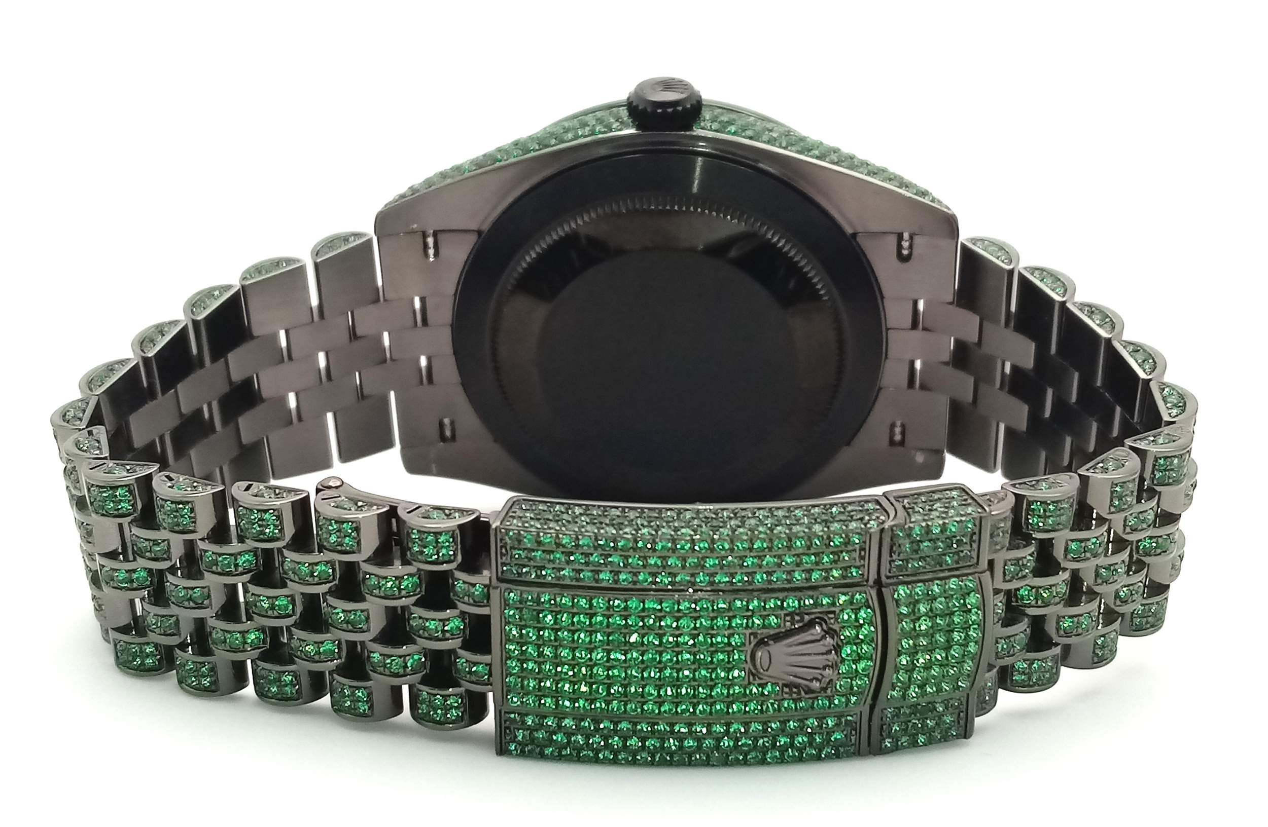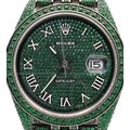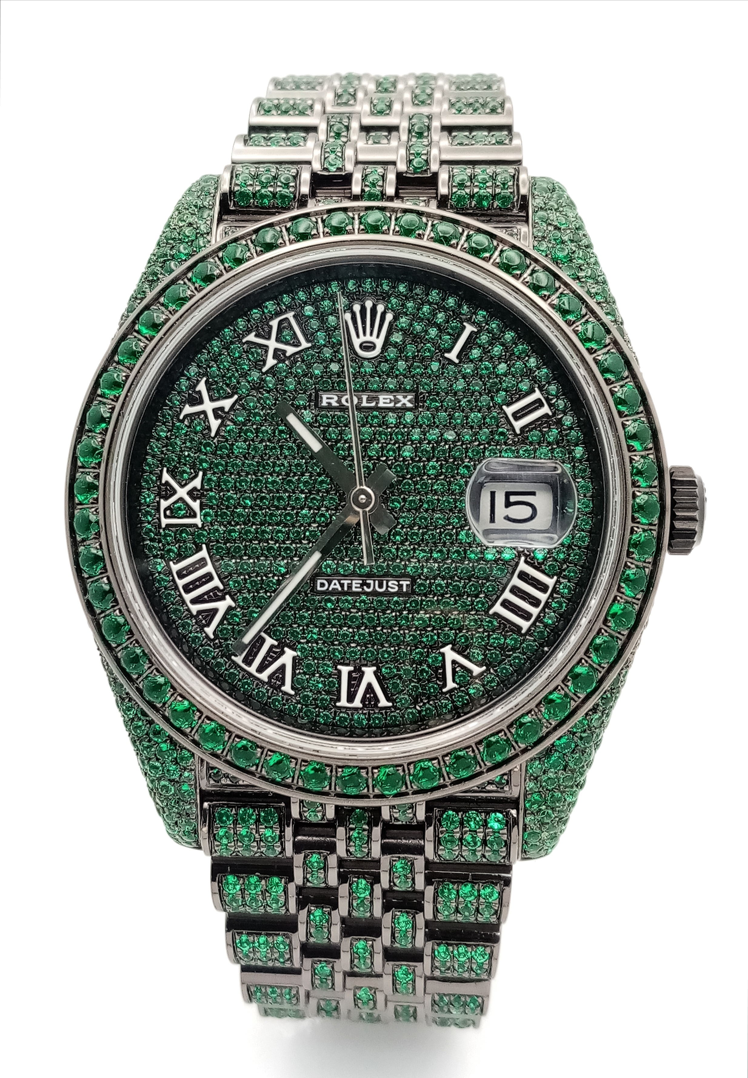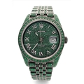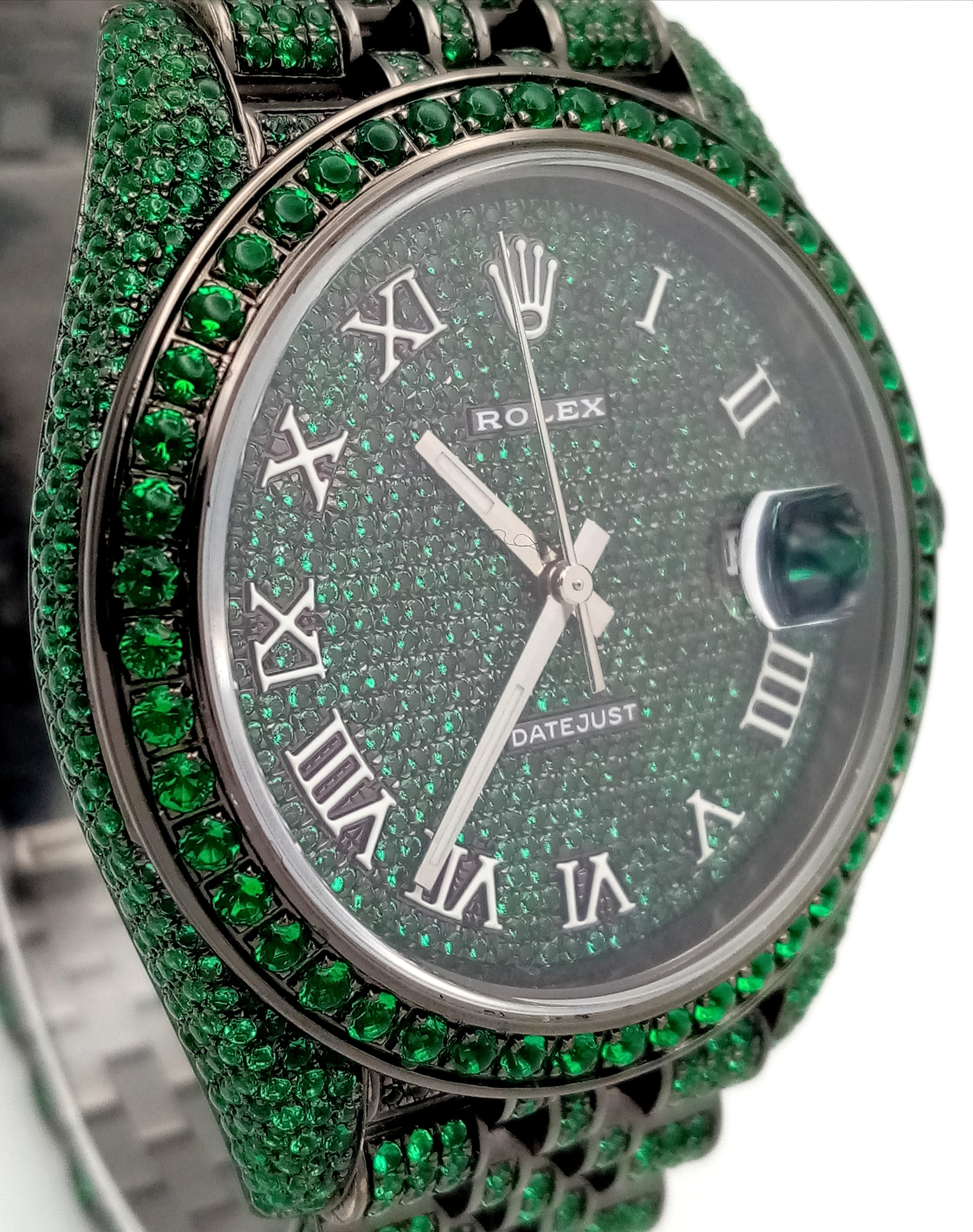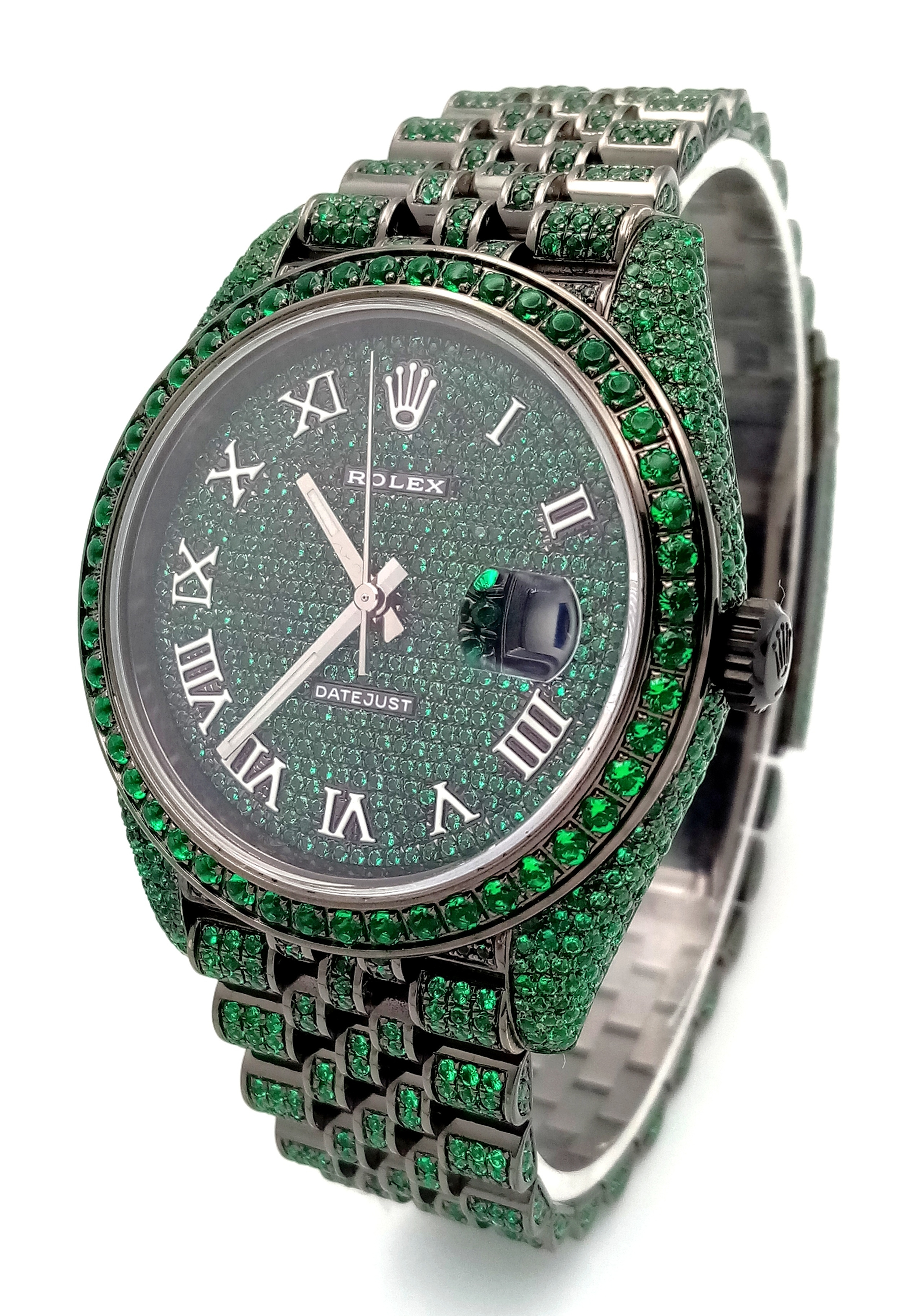 A Rolex Datejust Emerald 'Grinch' Automatic Gents Watch. Model 126300. Stainless steel bracelet and case - 41mm. Emerald set bracelet, bezel, case and dial. Roman numeral markers. In good condition and working order. Comes with a Rolex guarantee card. Note: Emeralds have been professionally custom fitted.