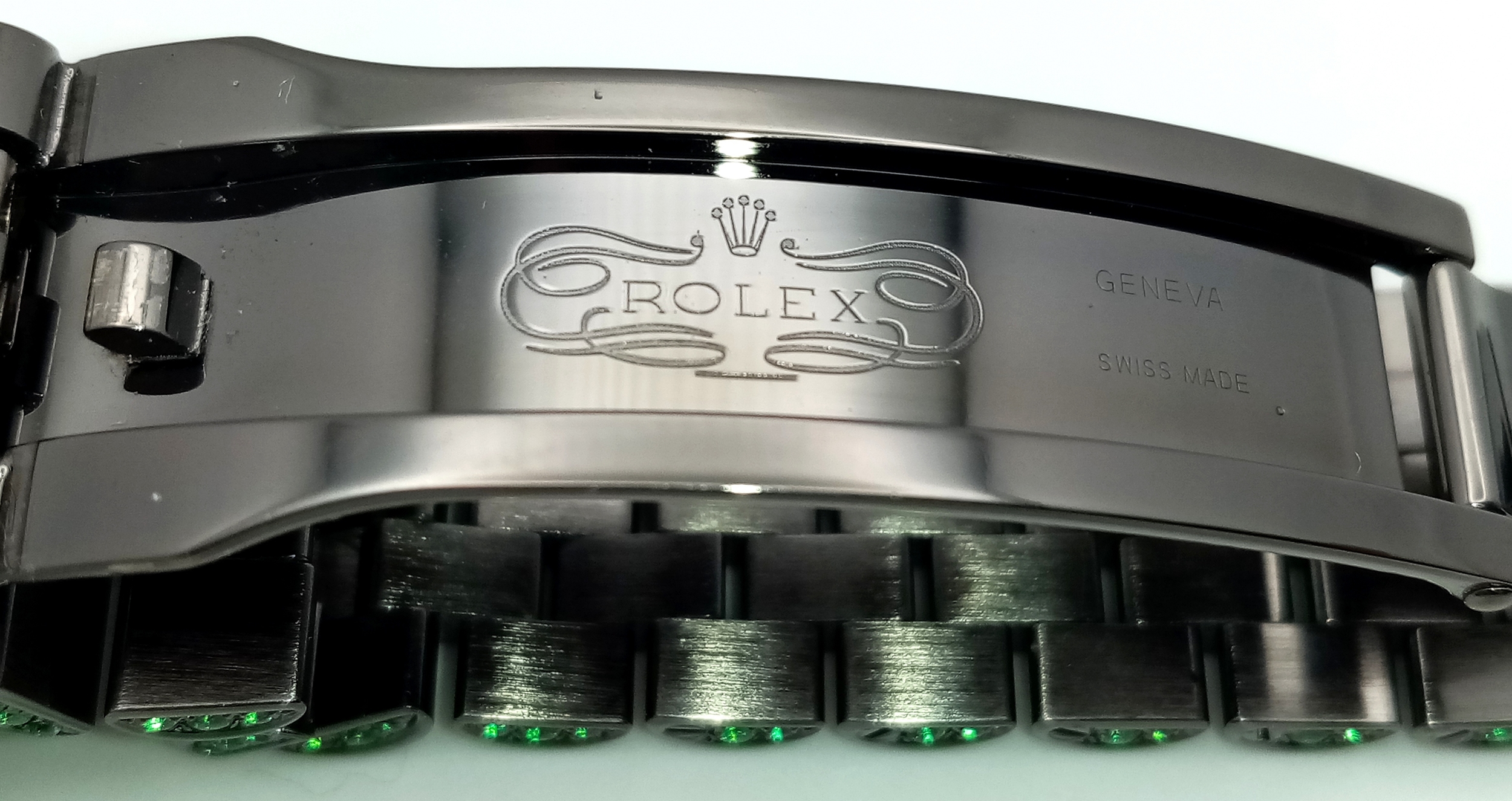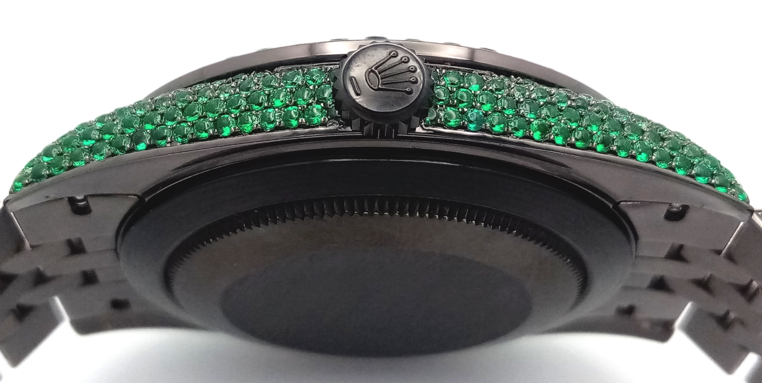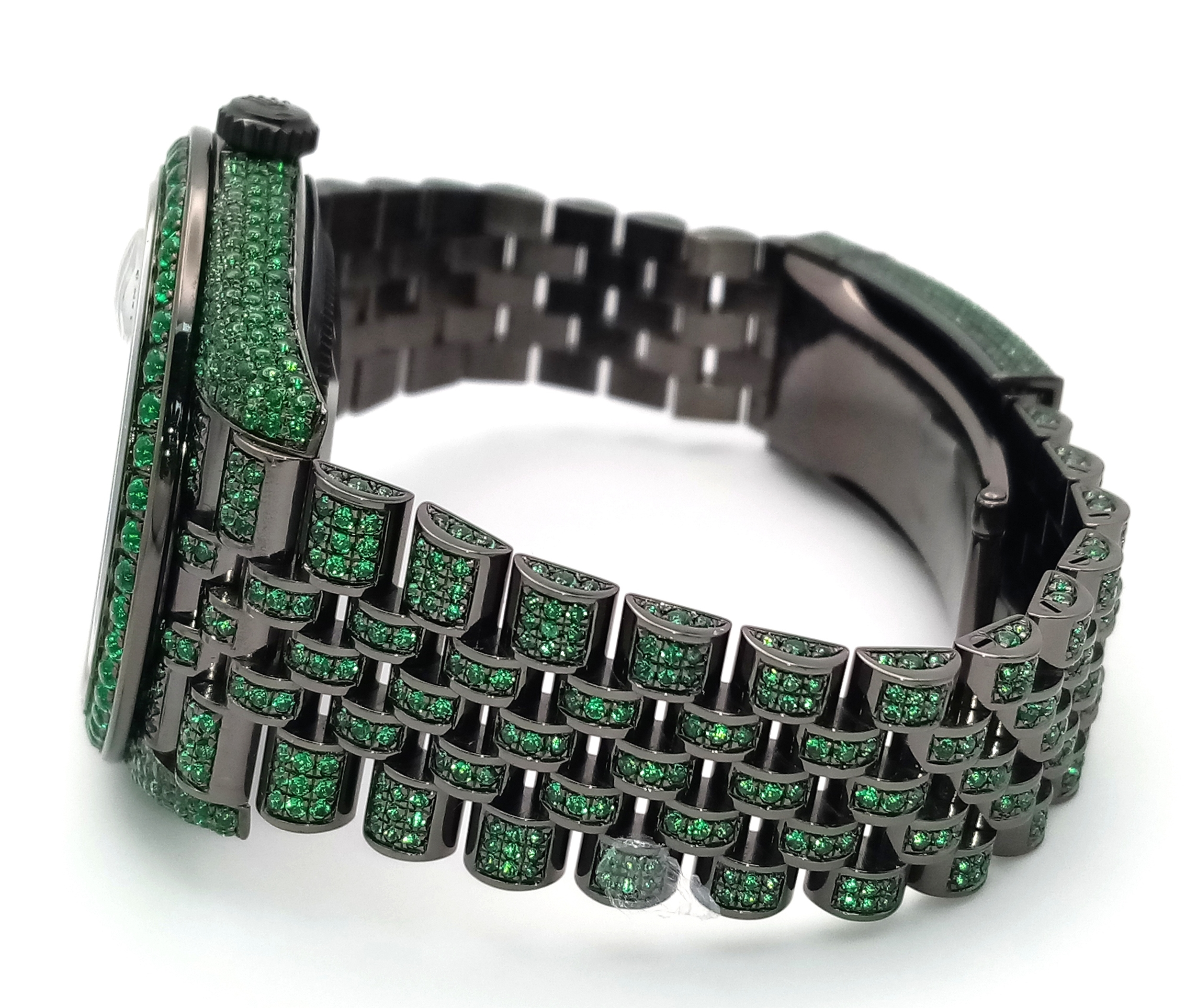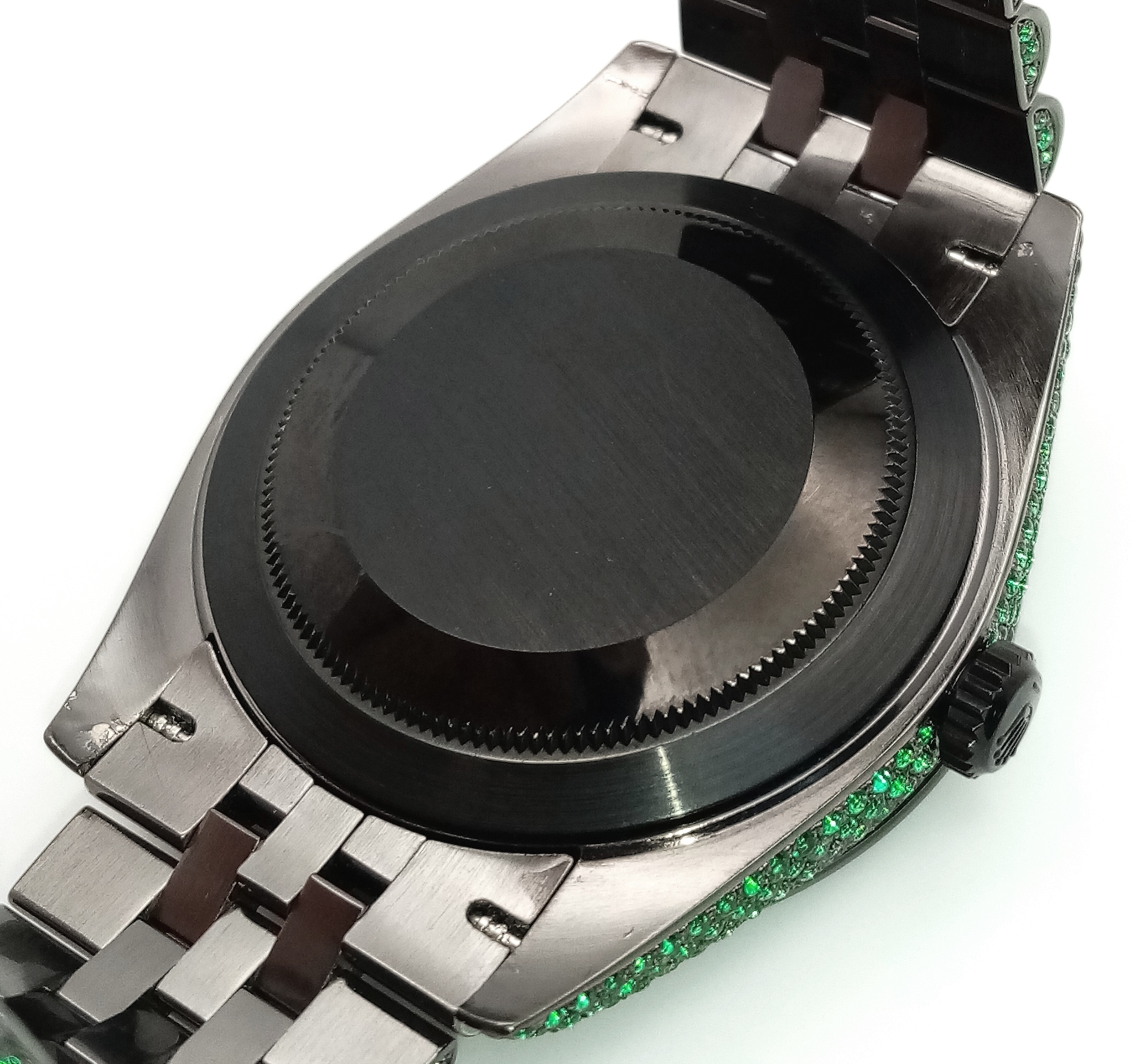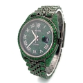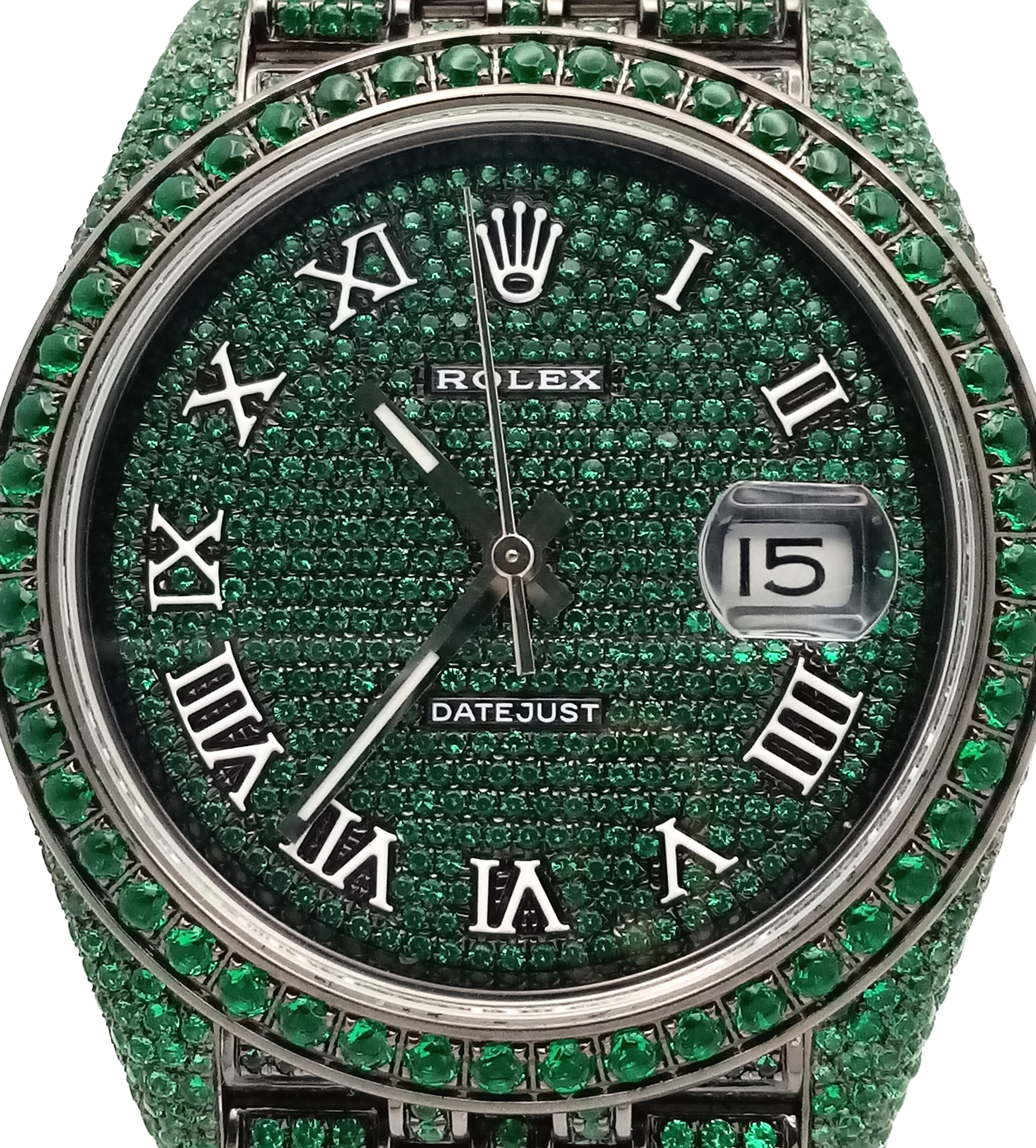 A Rolex Datejust Emerald 'Grinch' Automatic Gents Watch. Model 126300. Stainless steel bracelet and case - 41mm. Emerald set bracelet, bezel, case and dial. Roman numeral markers. In good condition and working order. Comes with a Rolex guarantee card. Note: Emeralds have been professionally custom fitted.