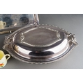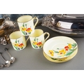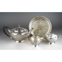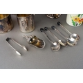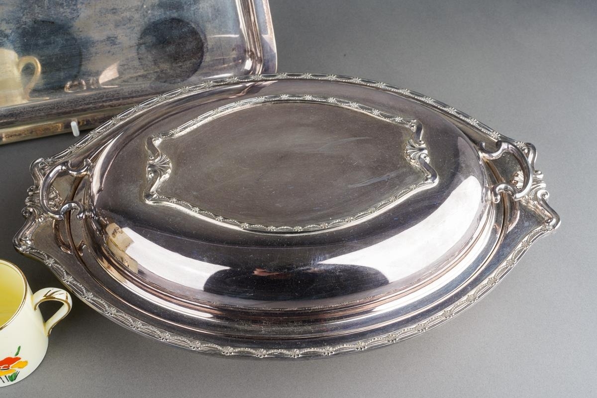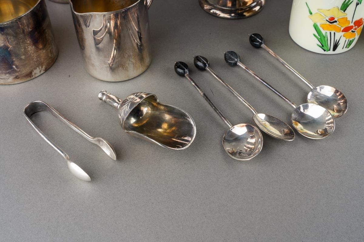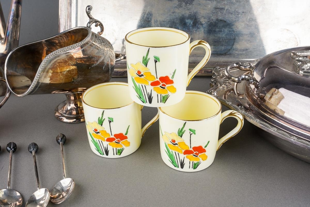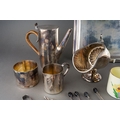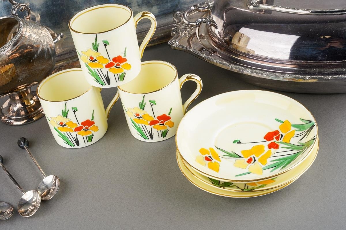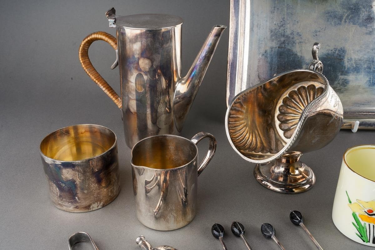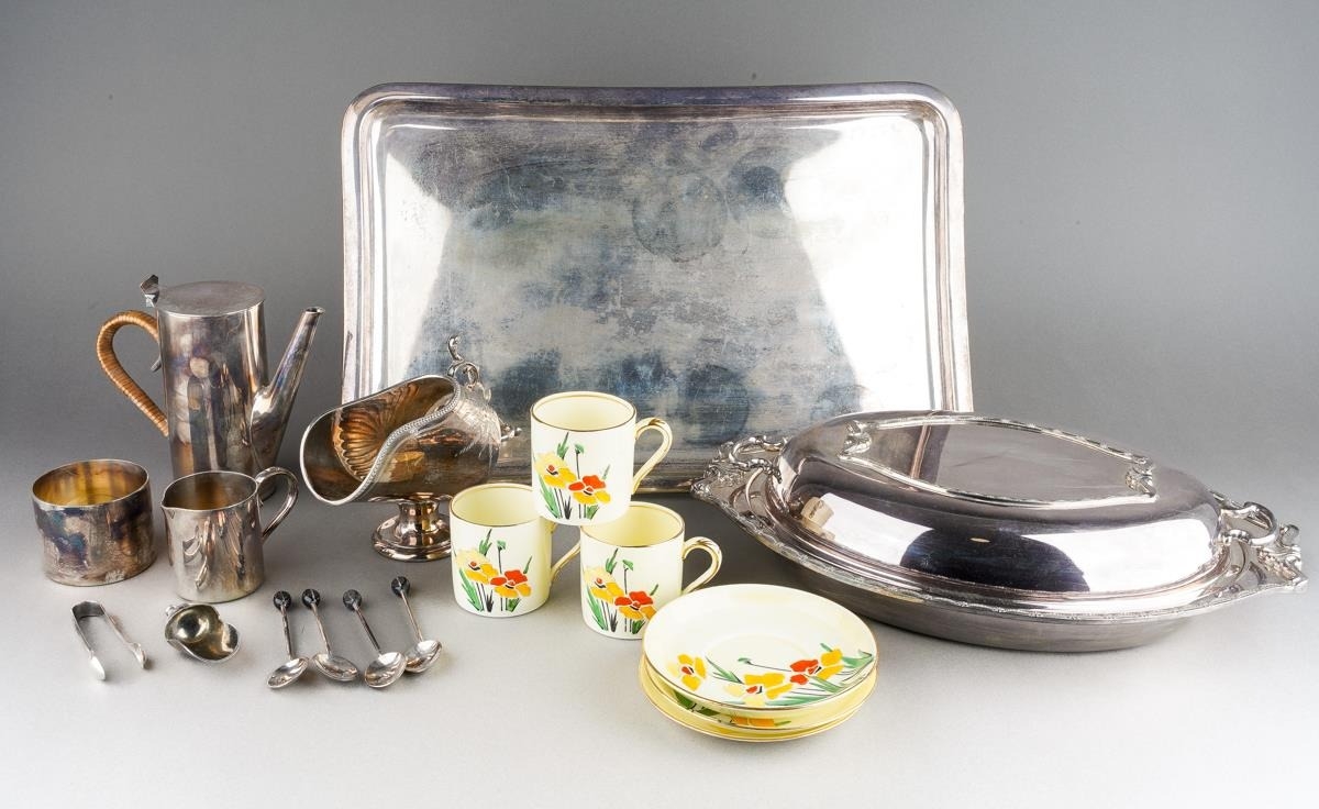 An Art Deco EPNS three piece coffee set including small coffee pot [4 cup/can] with ratan handle, sugar bowl and milk jug, pattern no 3111, by William Suckling & Sons complete sugar nippers, four coffee spoons and three Crown Staffordshire ceramic coffee cans together with miscellaneous plate entrée dish, trays, sugar skuttle etc [1 box]