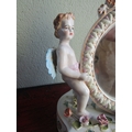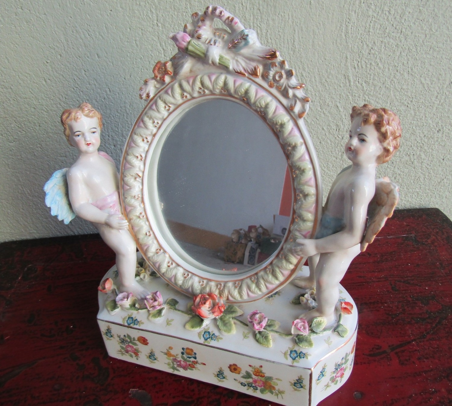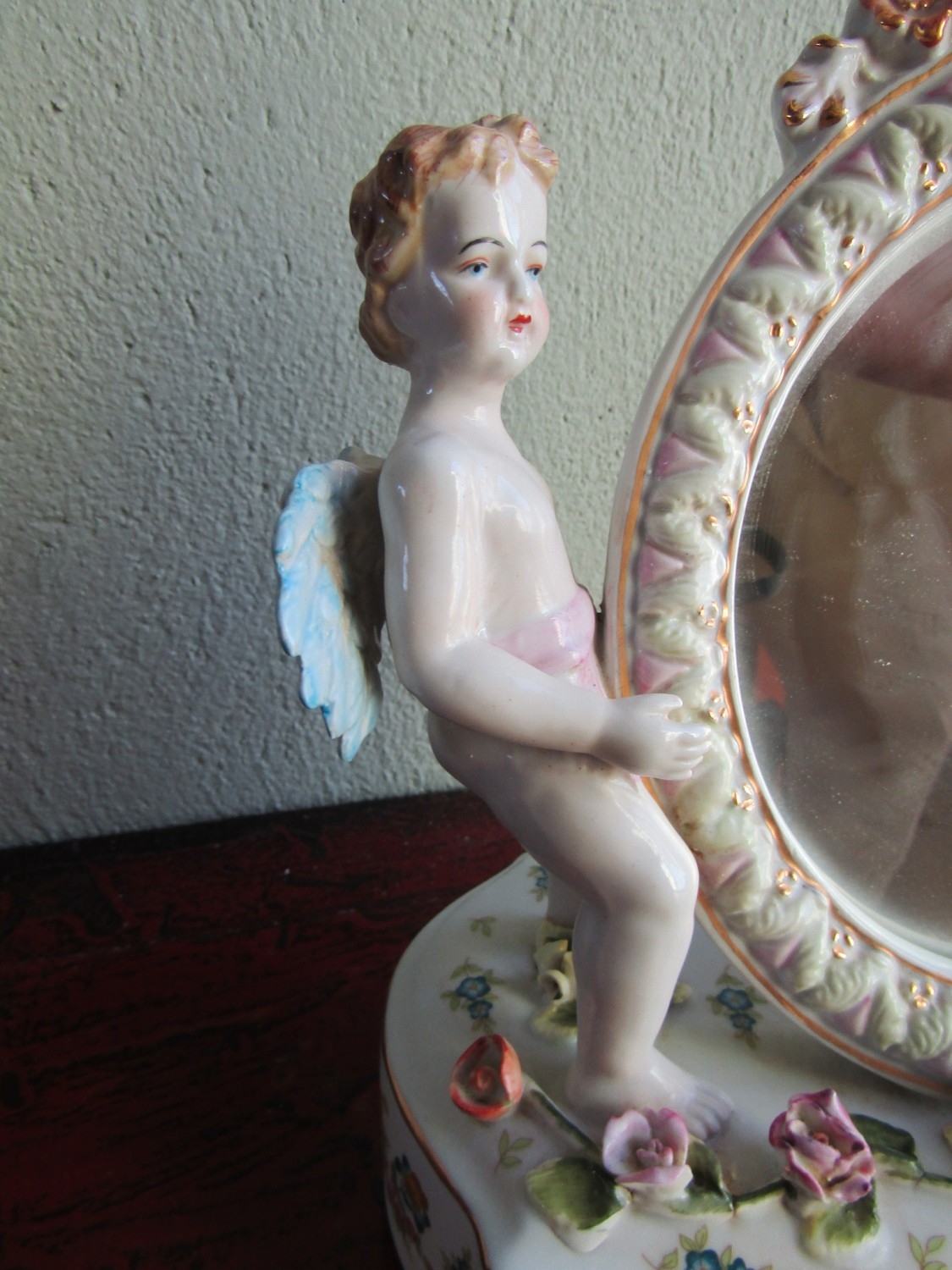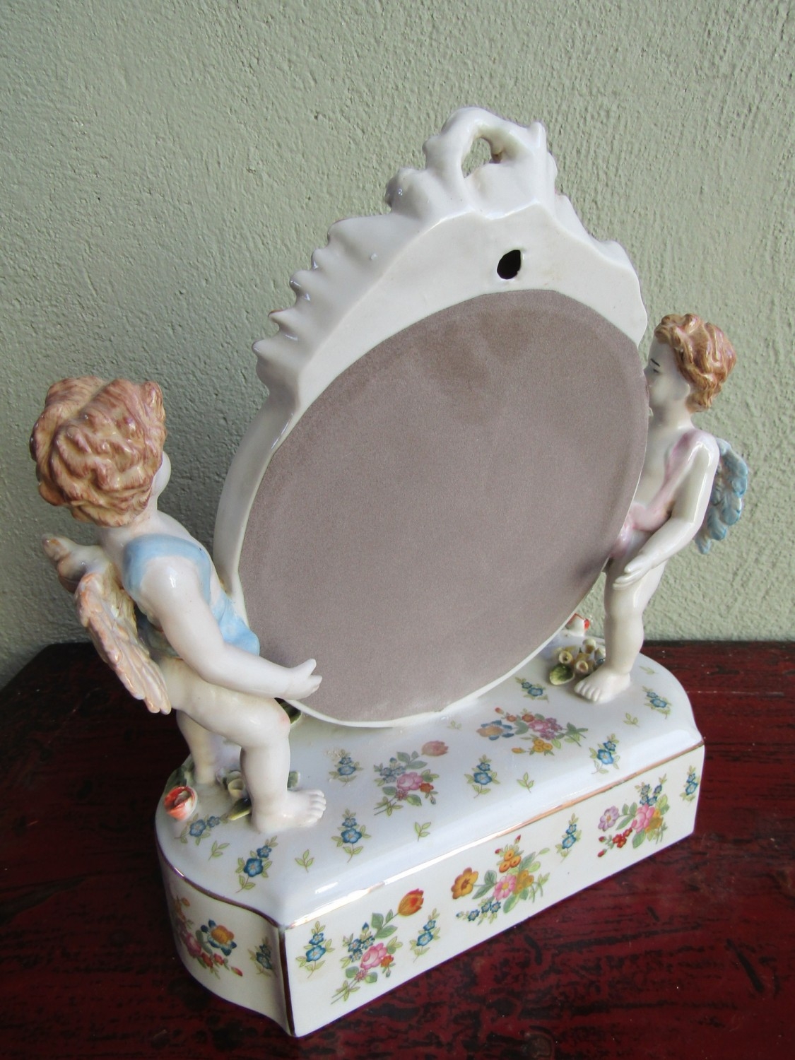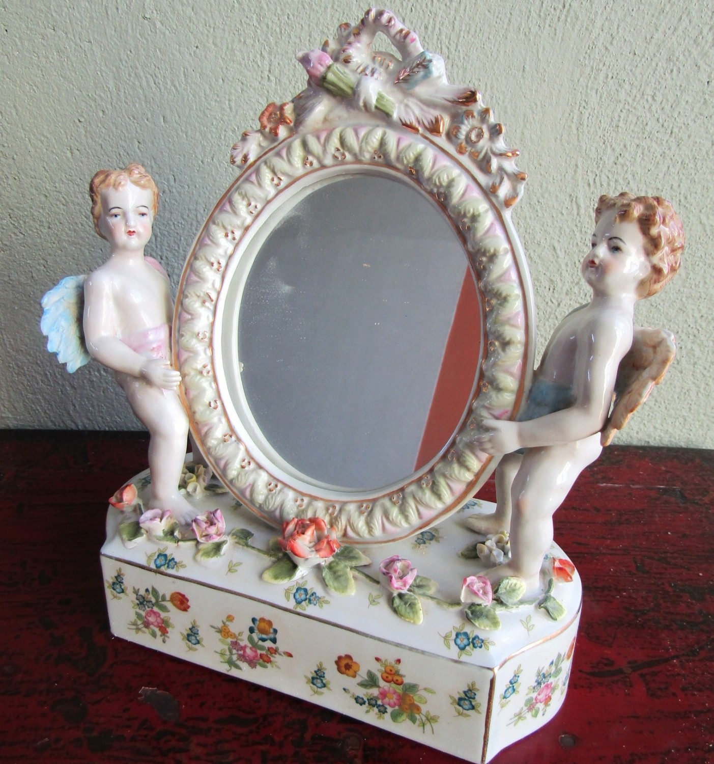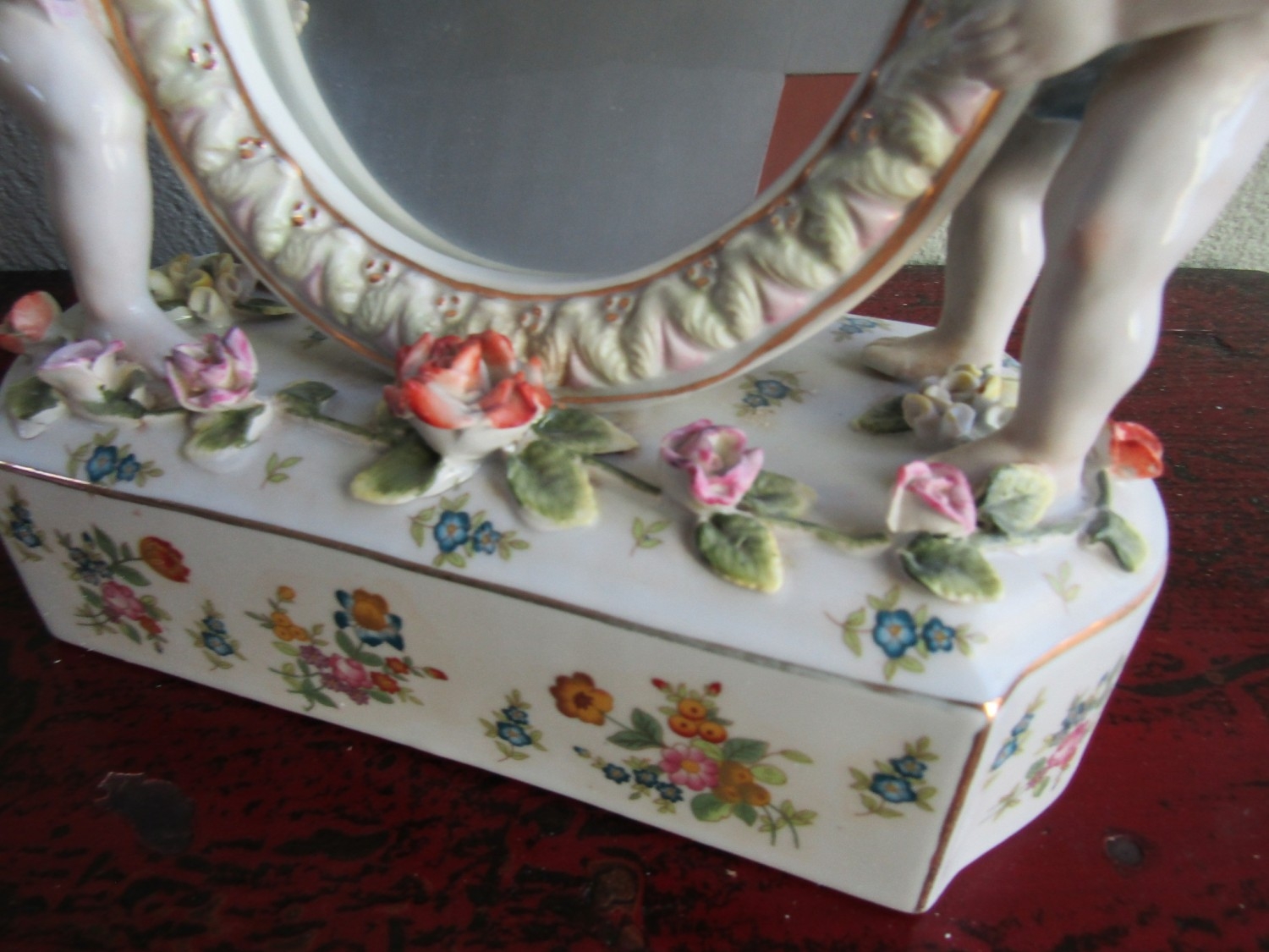 Continental Porcelain Dressing Table Mirror with Cherub Side Supports Approximately 14 Inches Wide x 12 Inches High Good Original Condition