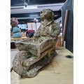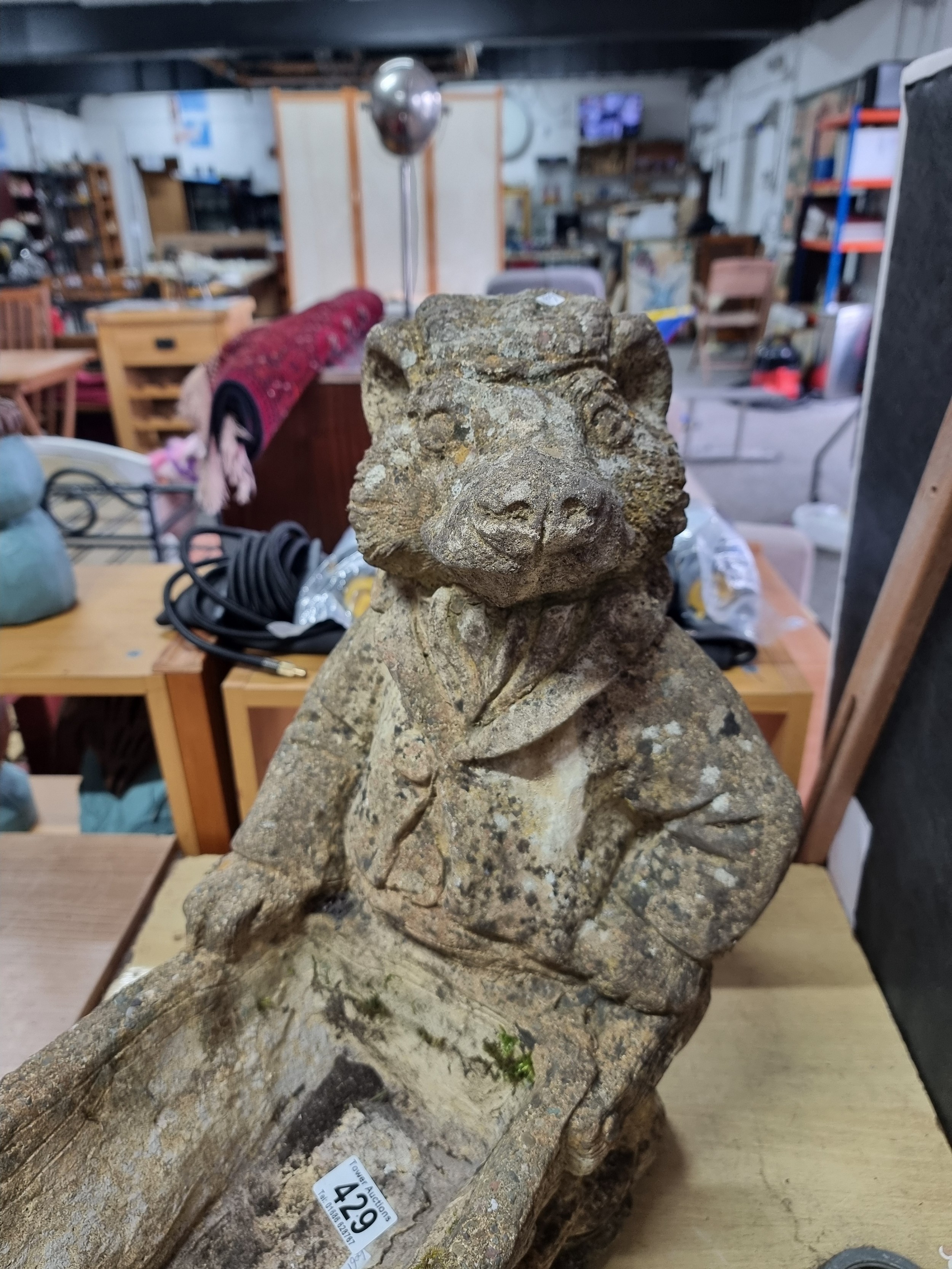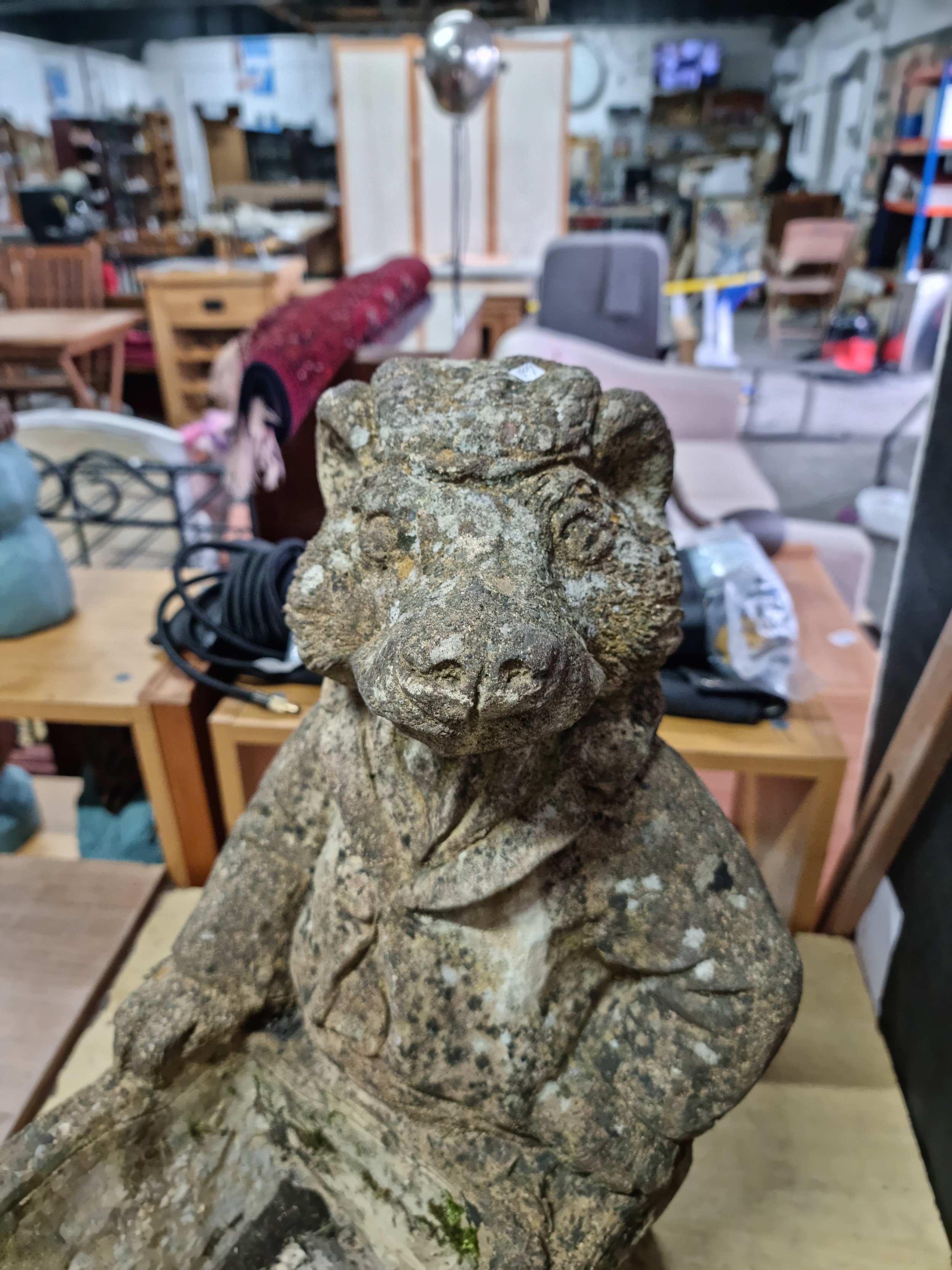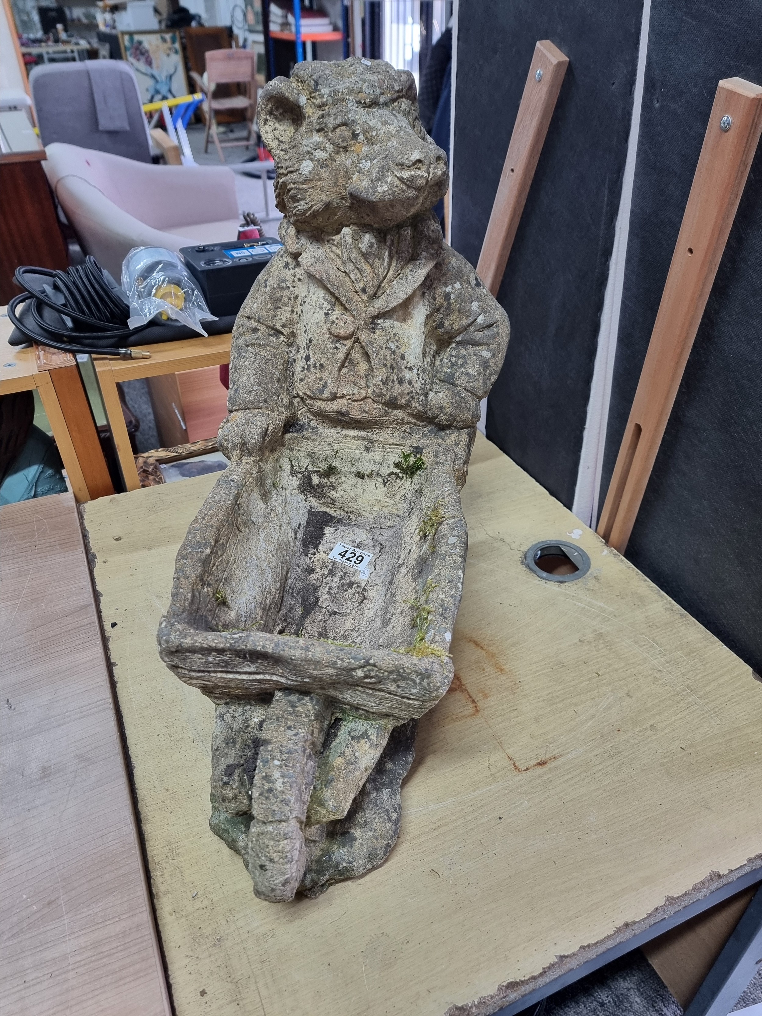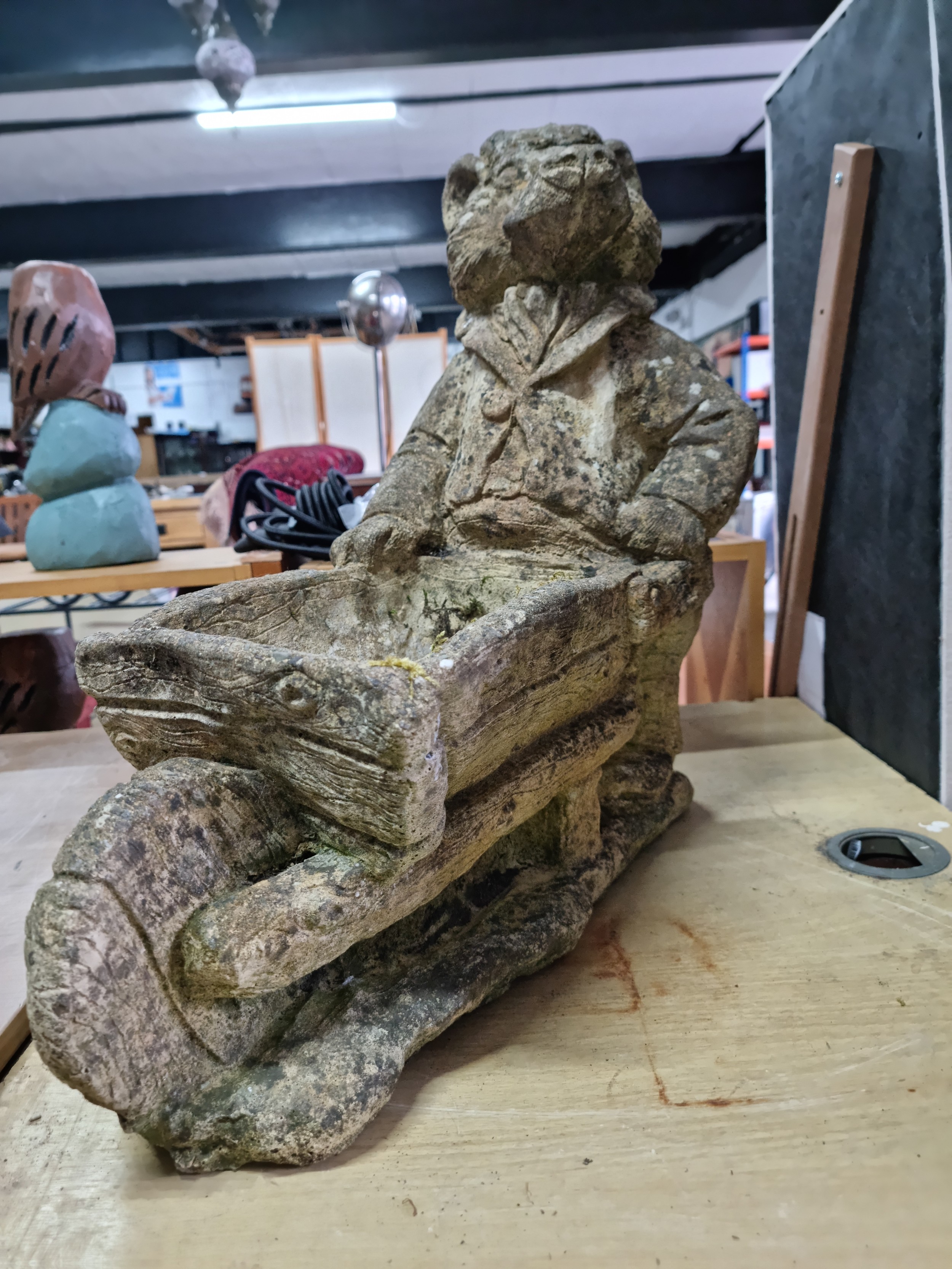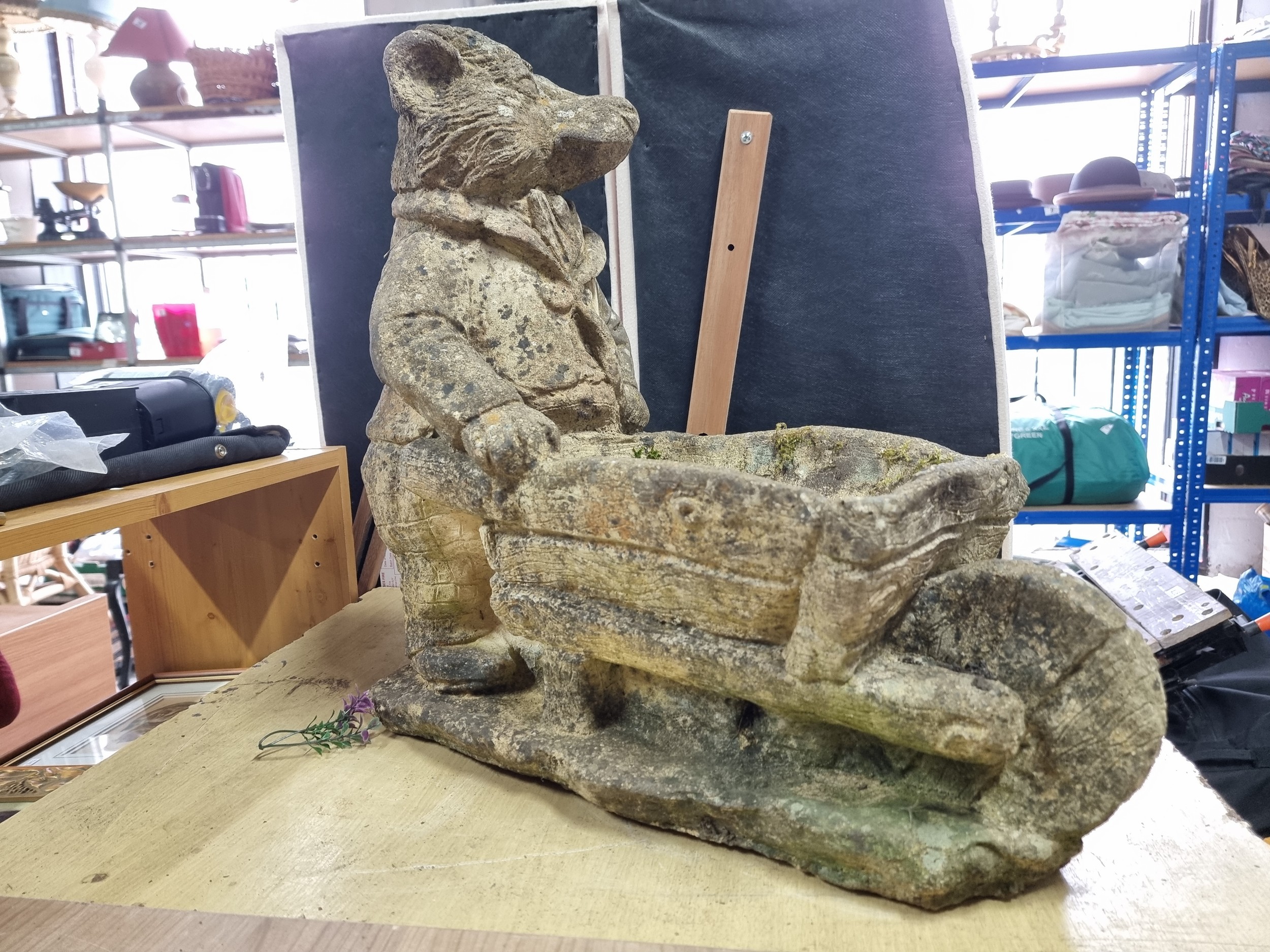 Large Mr Badger (Wind in the Willows) holding a wheelbarrow formed stoneware planter in good looked after condition with no damage having lots of charm, has a good weathered patina stands at 53cm high 55cm long and 27cm wide. The planter part dimensions are 27cm by 18cm