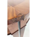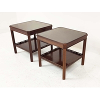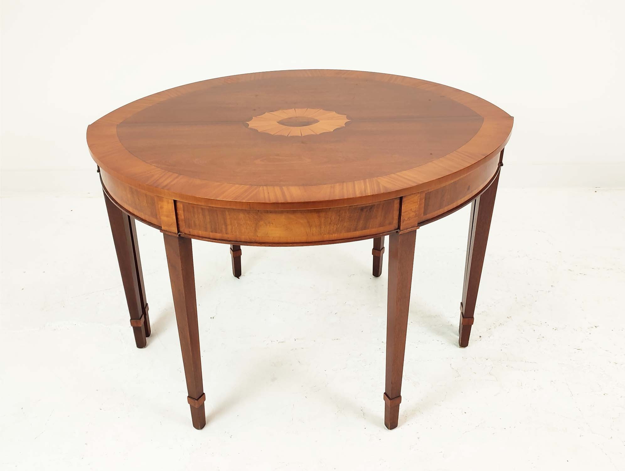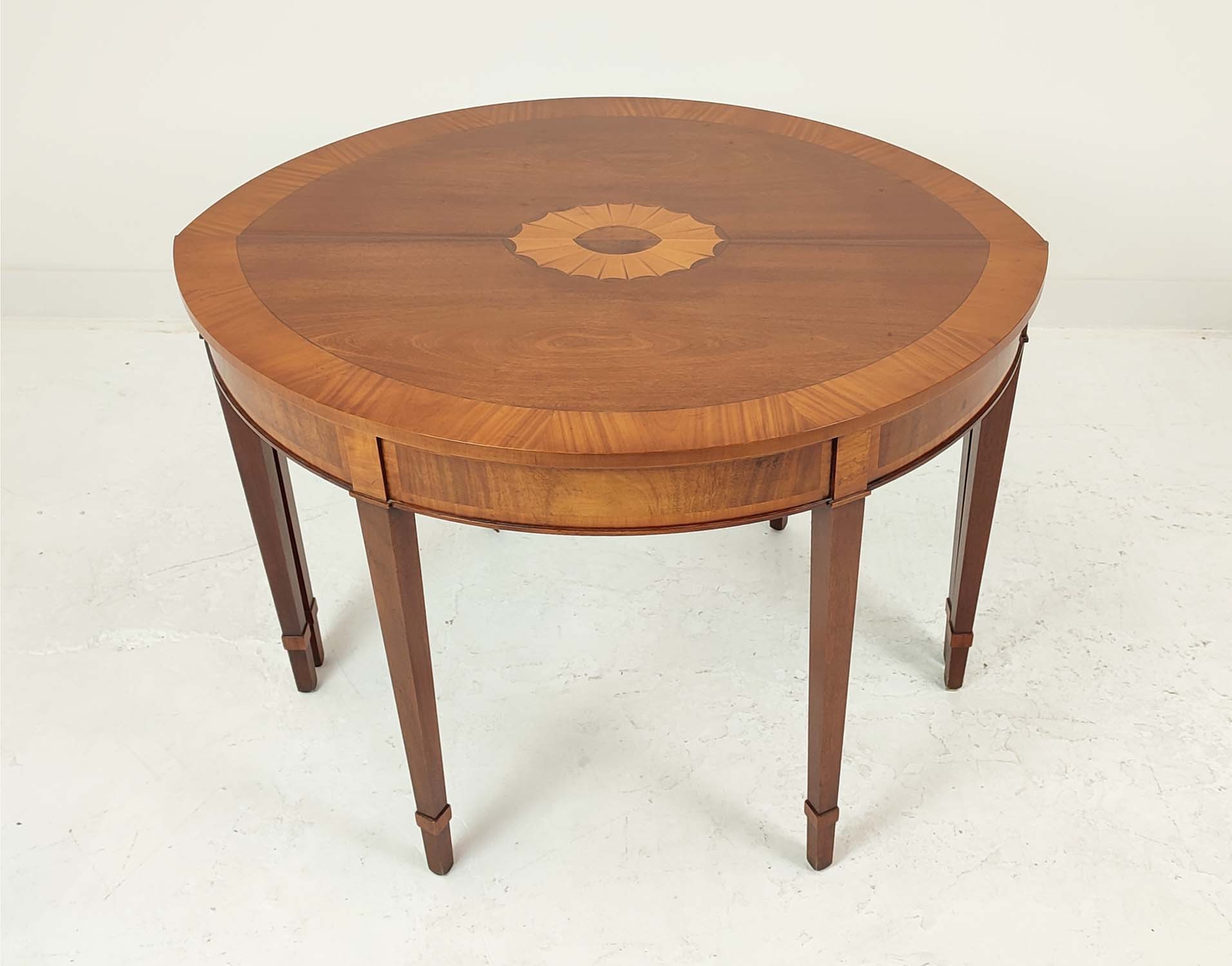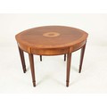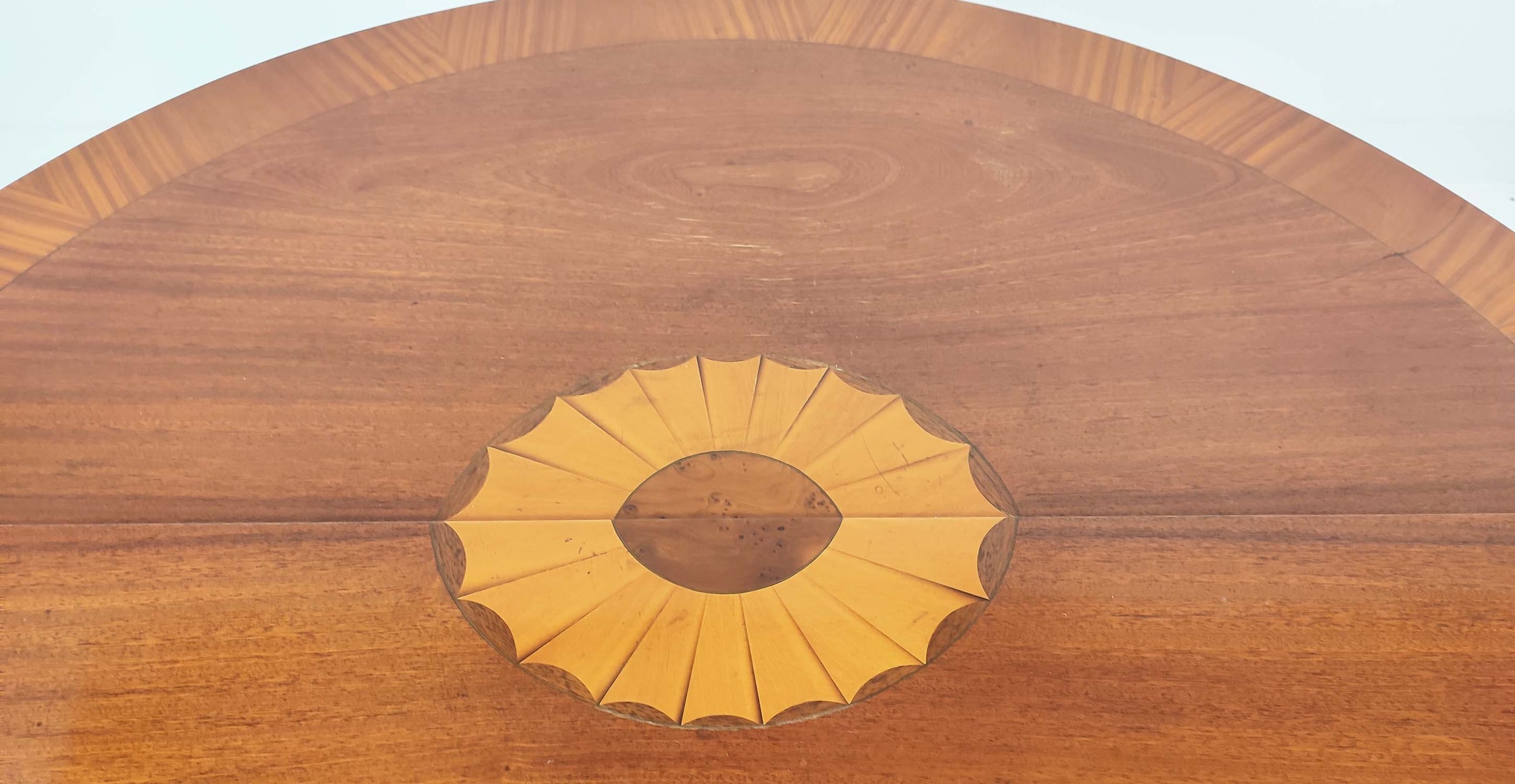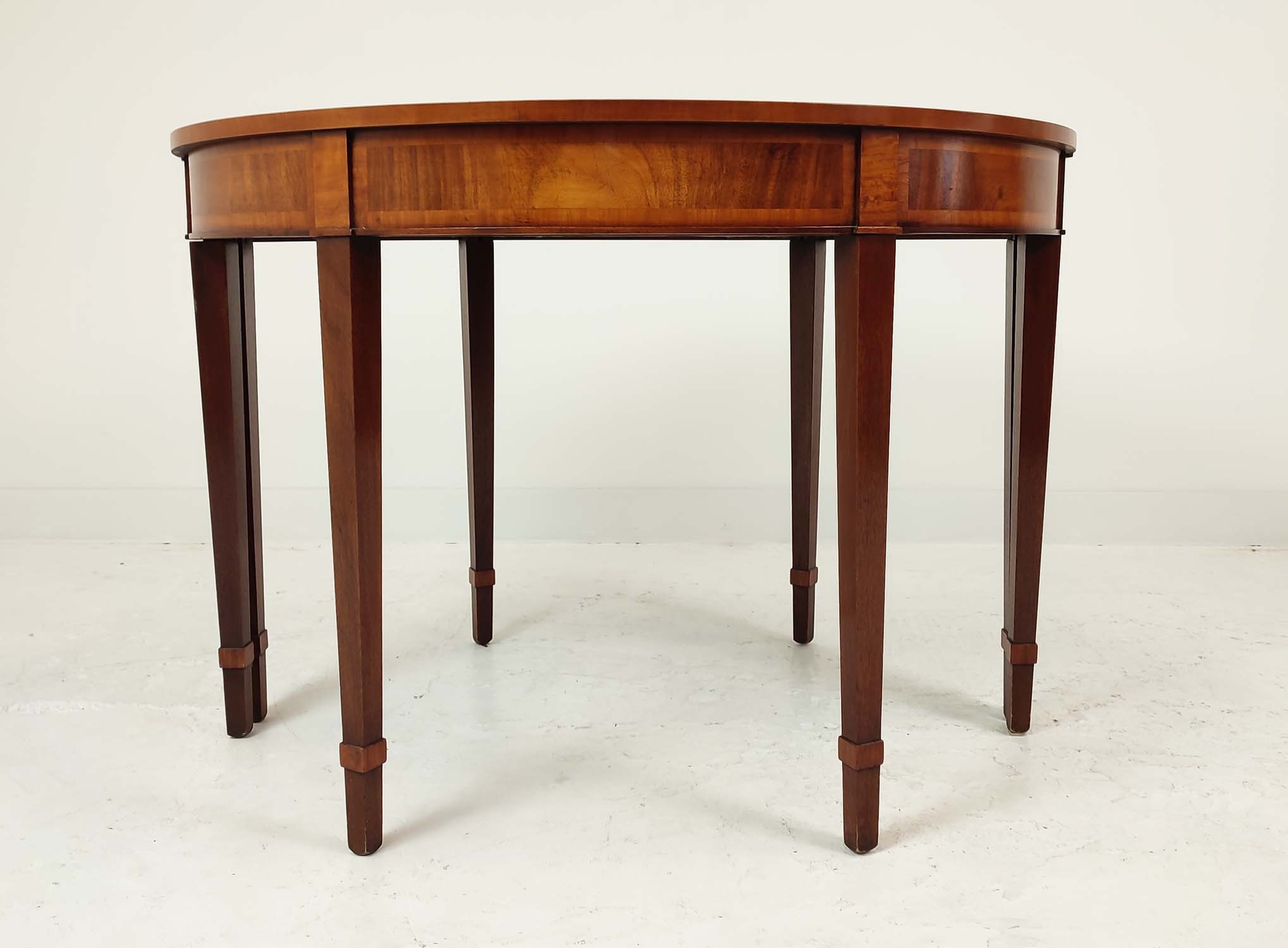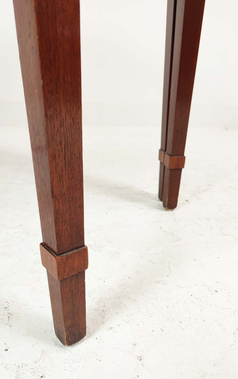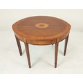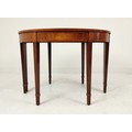 DEMI LUNE TABLES, a pair, George III design mahogany and satinwood inlaid, 77cm H x 112cm x 47cm. (2)