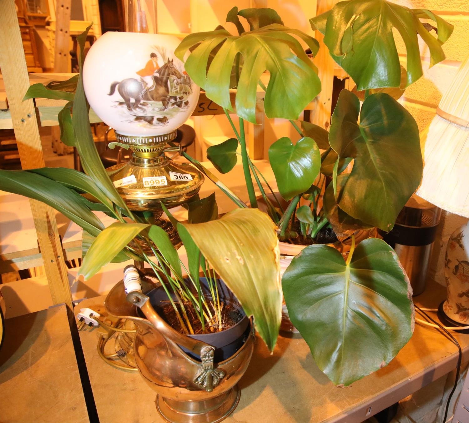 Converted brass oil lamp to light, plants in copper scuttle and a ceramic pot. Not available for in-house P&P, contact Paul O'Hea at Mailboxes on 01925 659133