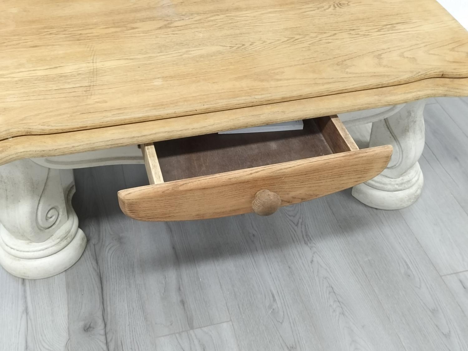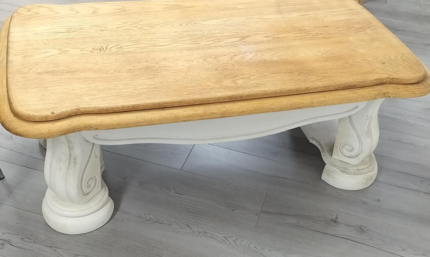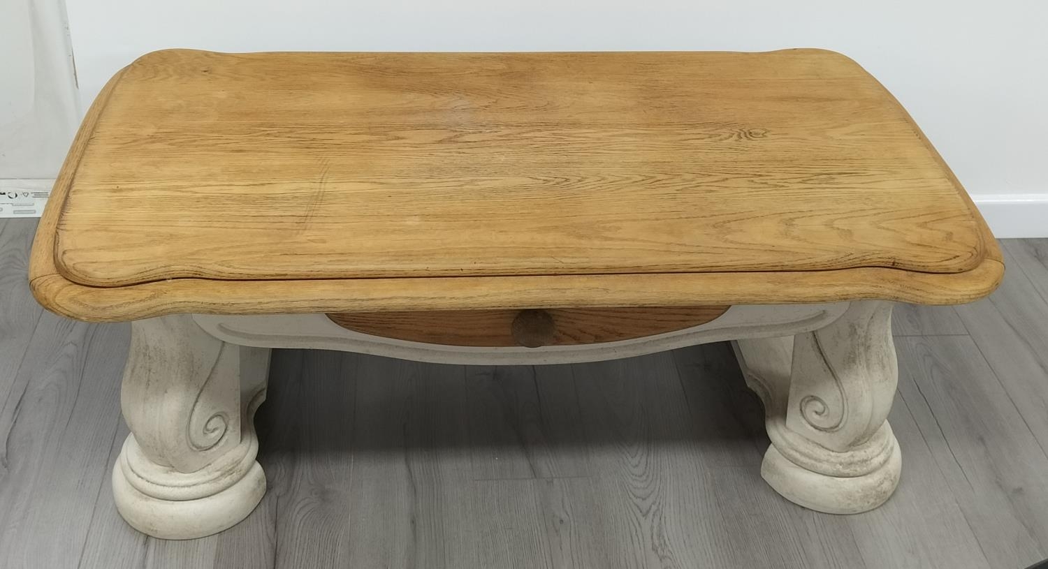 Oak French Style Large Coffee Table with Painted Base. 51cm High, 136cm x 76cm. Collection Only.