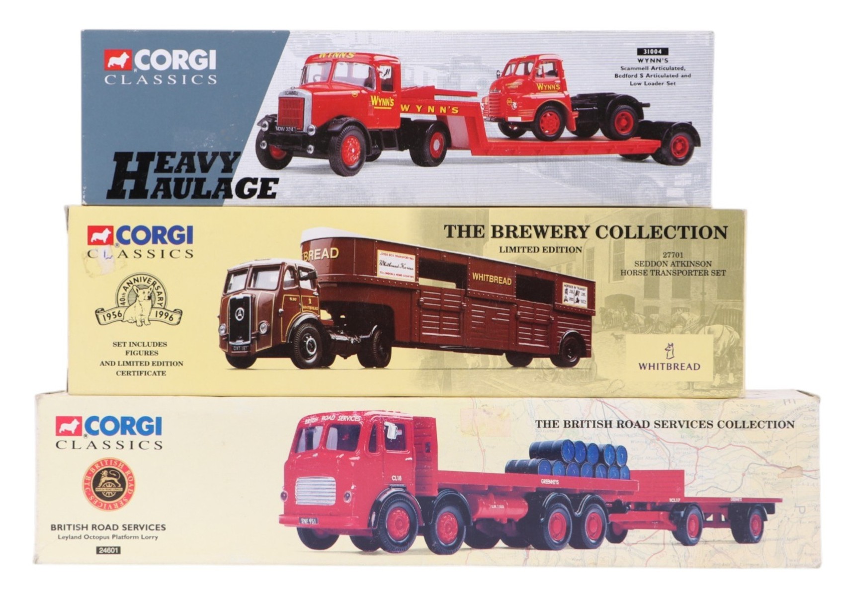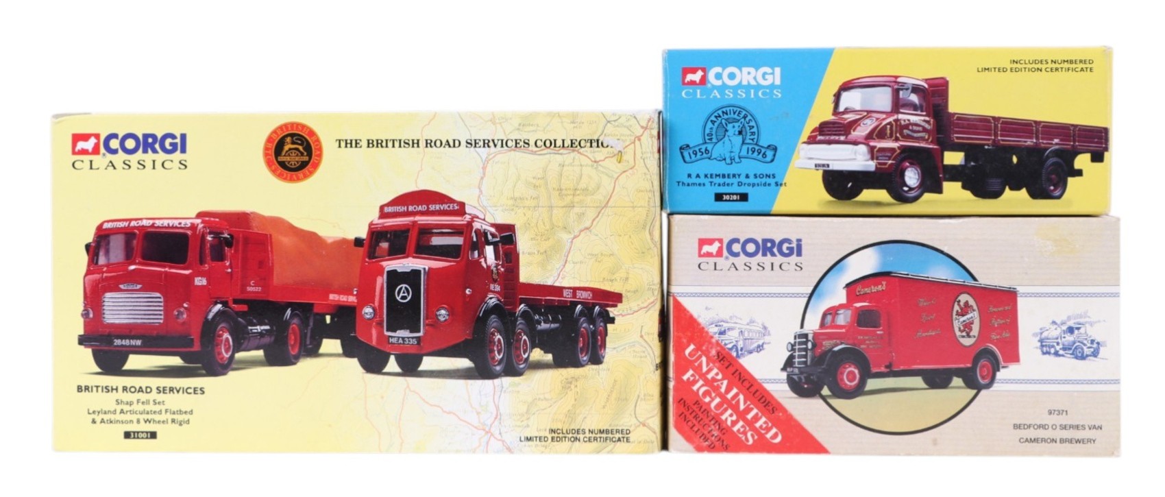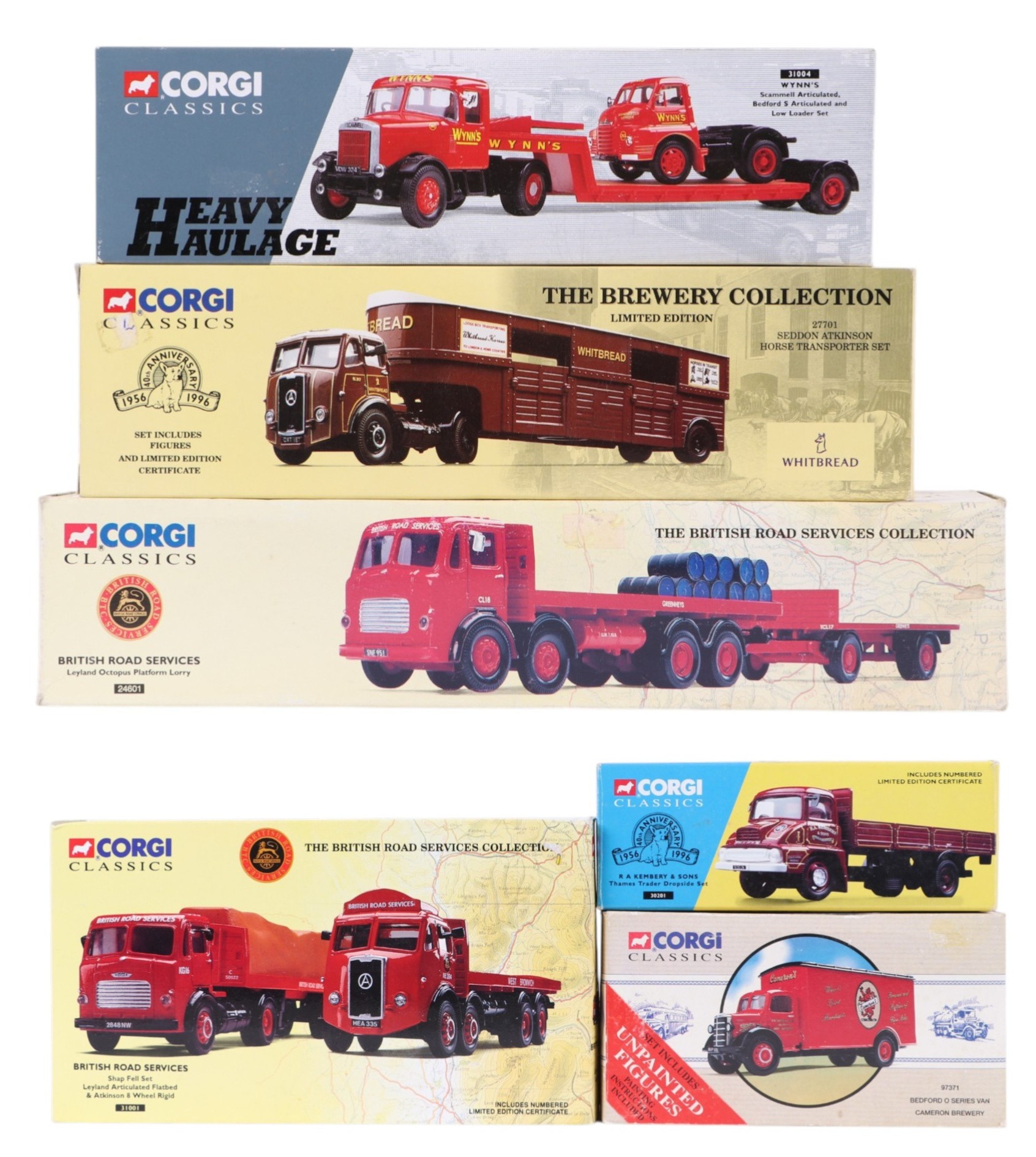 Six Corgi Classic diecast commercial vehicles, comprising Sedan Atkinson horse transporter set, 27701, British Road Services Leyland Octopus platform lorry, 24601, Wyns's Scammal articulated Bedford S type and low loader set, 31004, Bedford 0 series van ( Cameron Brewery ), 97371, R A Kembery & Sons Thames trader drop side set, 30201, and Shap Fell set Leyland articulated flat bed & Atkinson eight wheel ridged, 31001, all boxed (6).