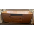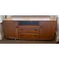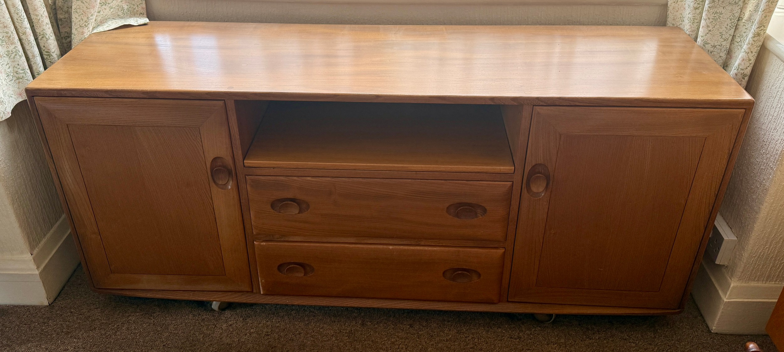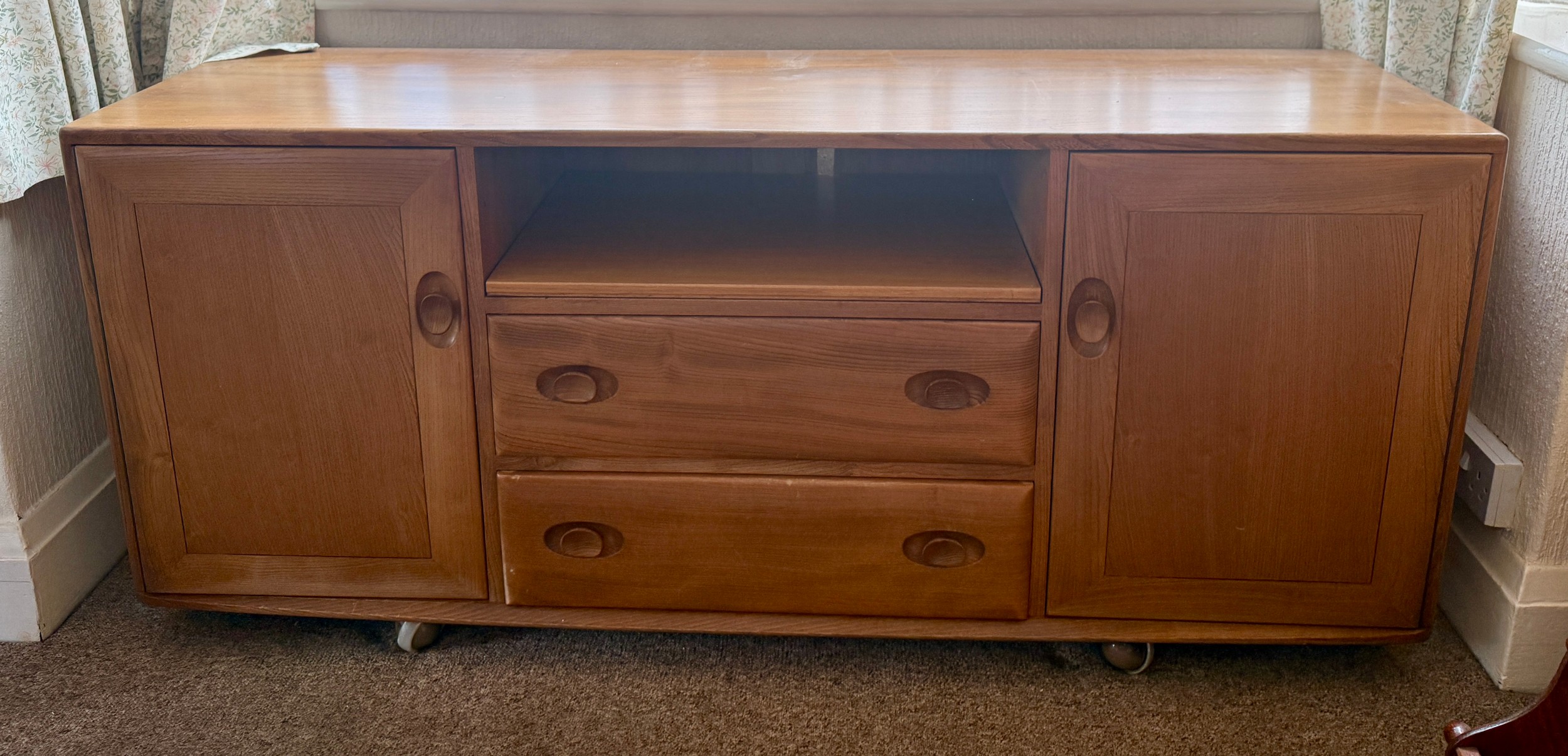 A mid 20thC Ercol sideboard with two cupboards and two drawers. 155cm w x 43cm d x 69cm h.
