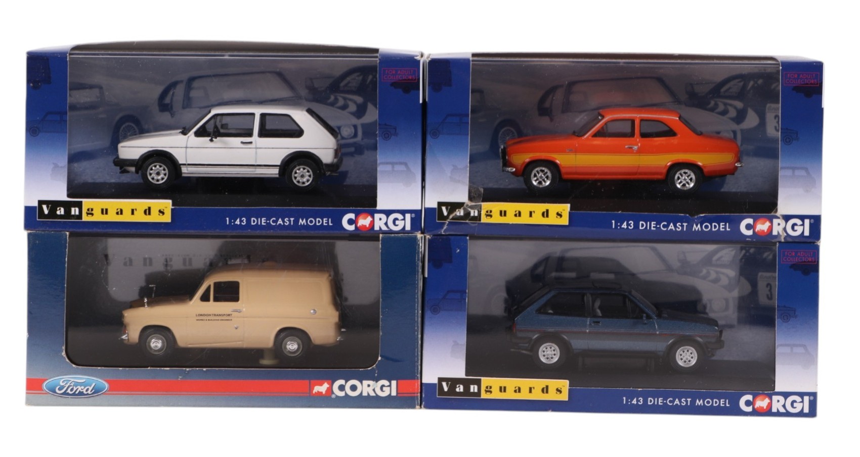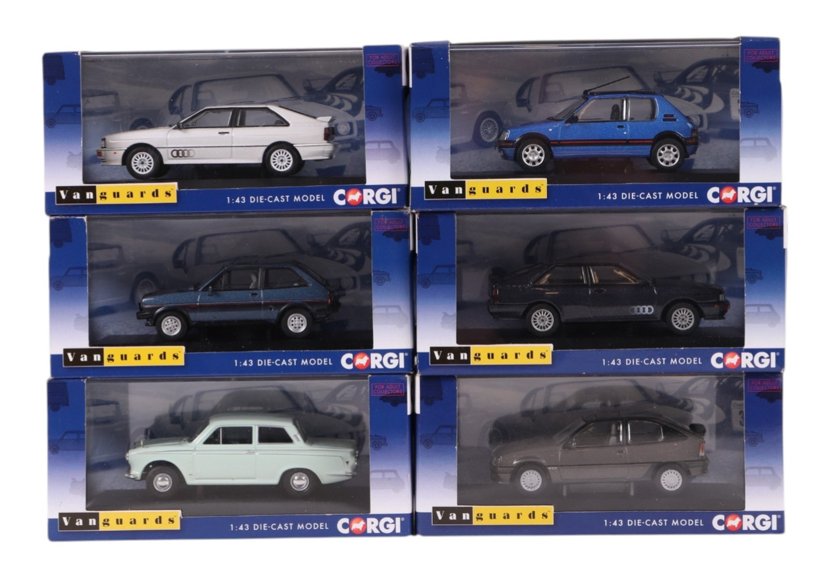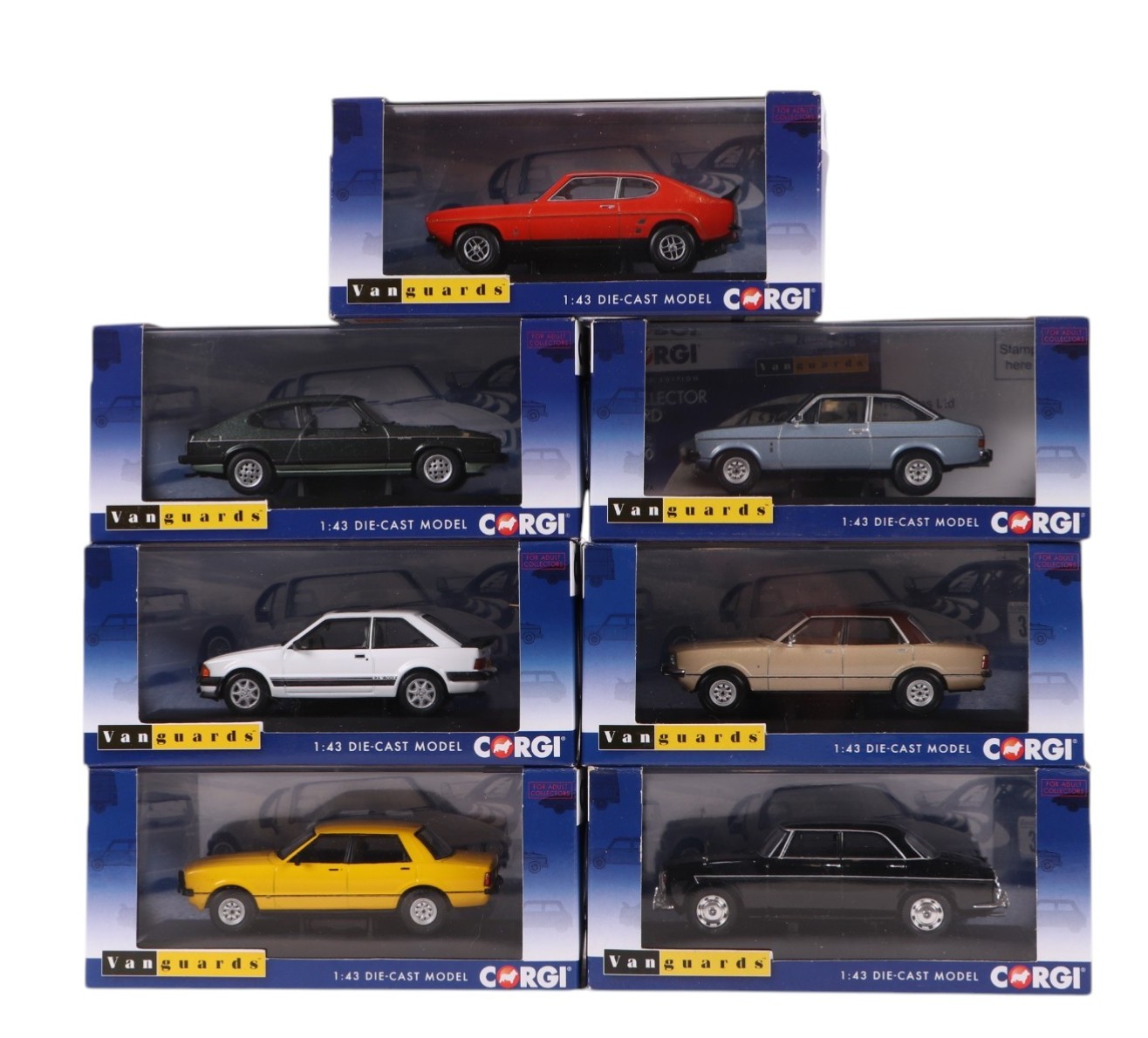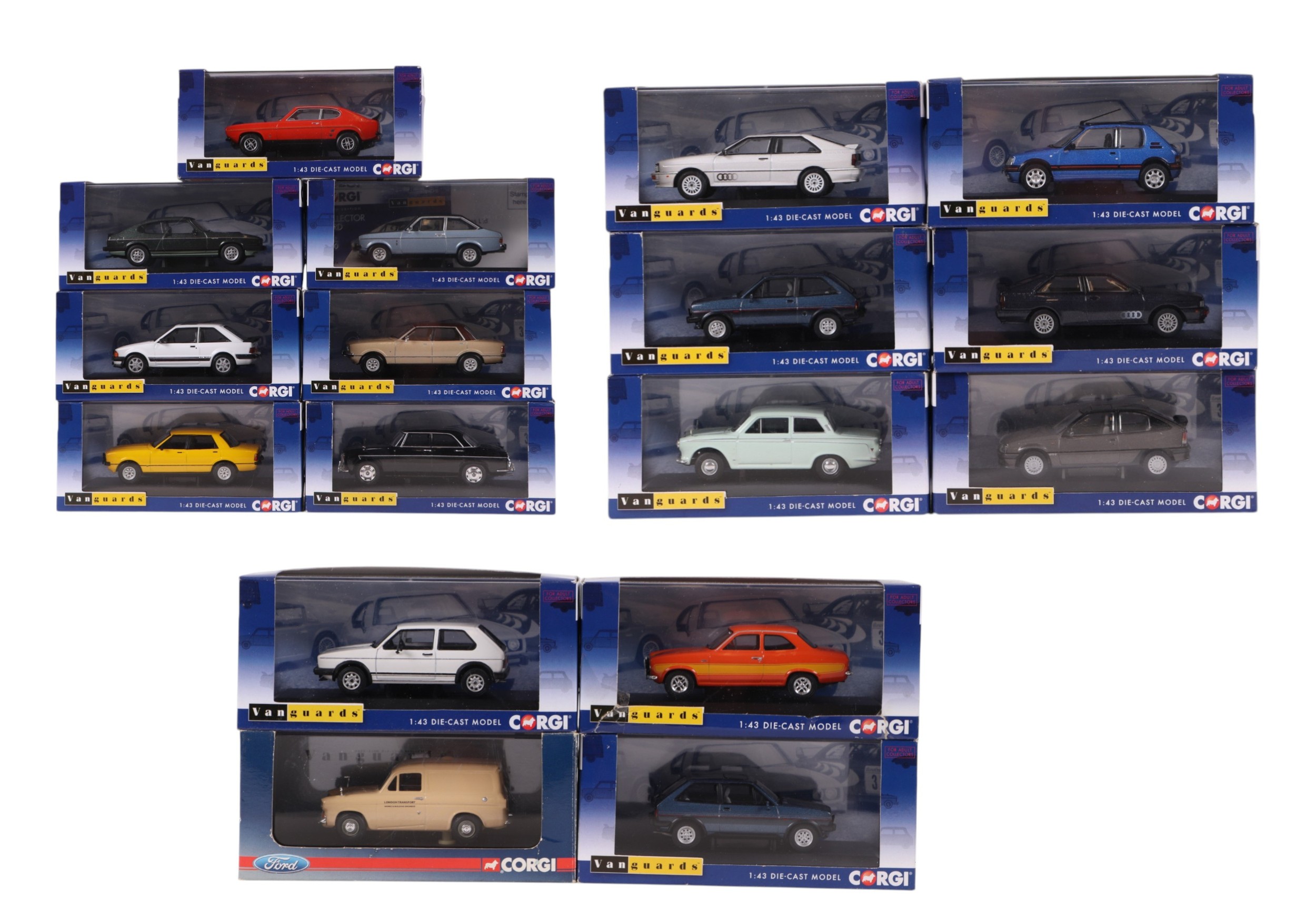 A collection of Vanguards Corgi 1:43 scale diecast model cars, including Ford Capri MK3 2.8 Injection, VA10812, Ford Escort Mk3, RS 1600i, VA1009, Audi Quattro MK2, VA12900 and others, all boxed (17).