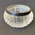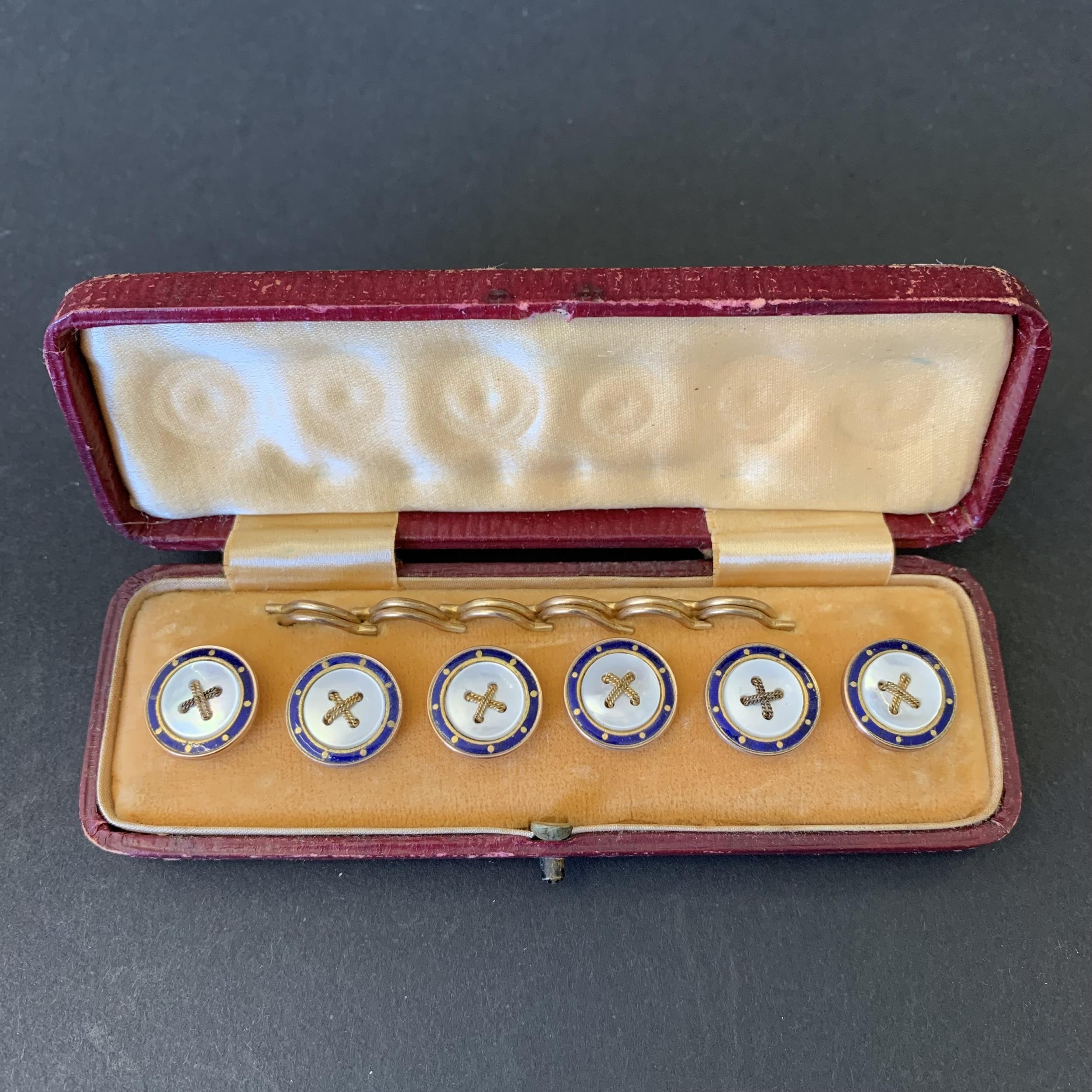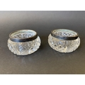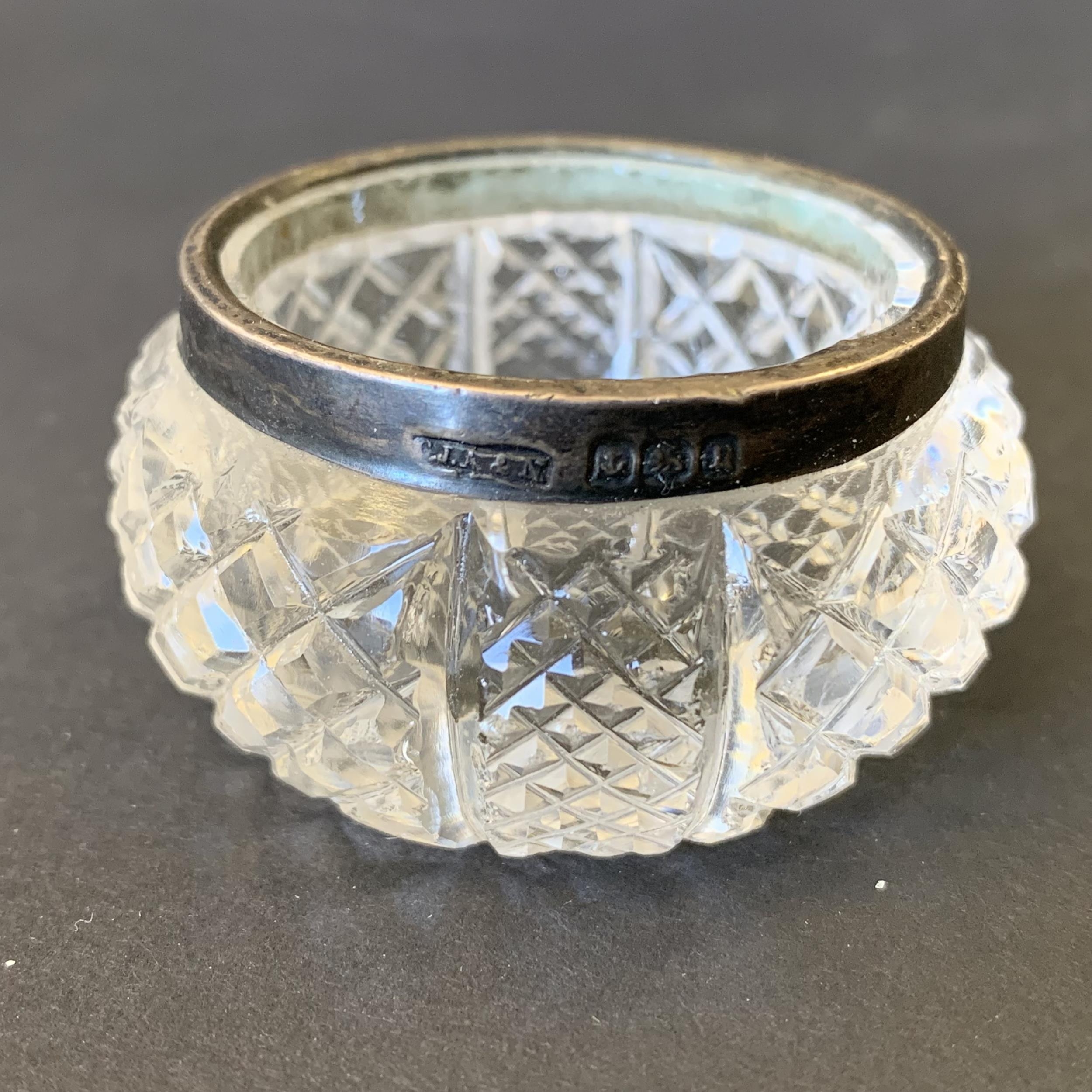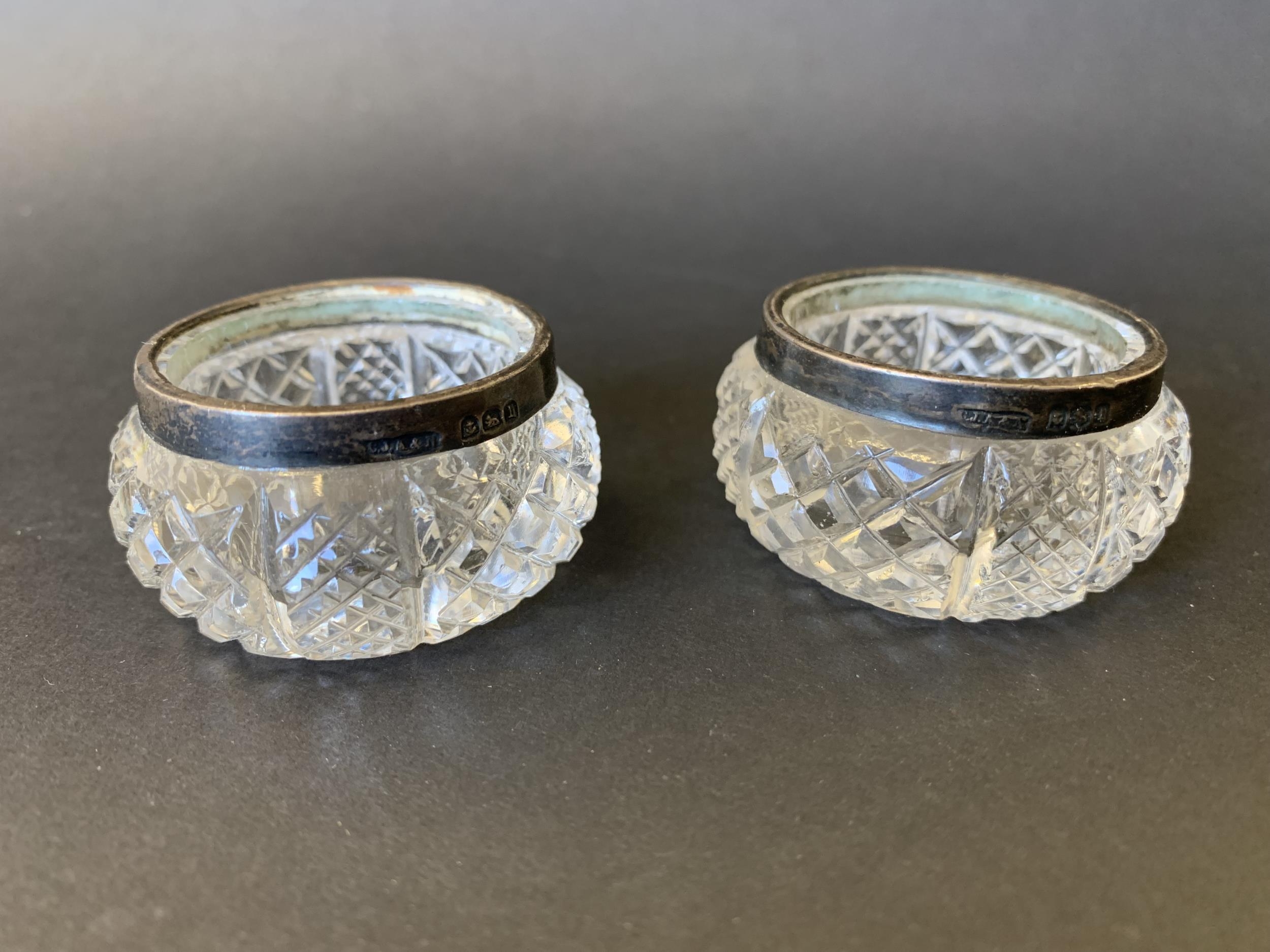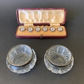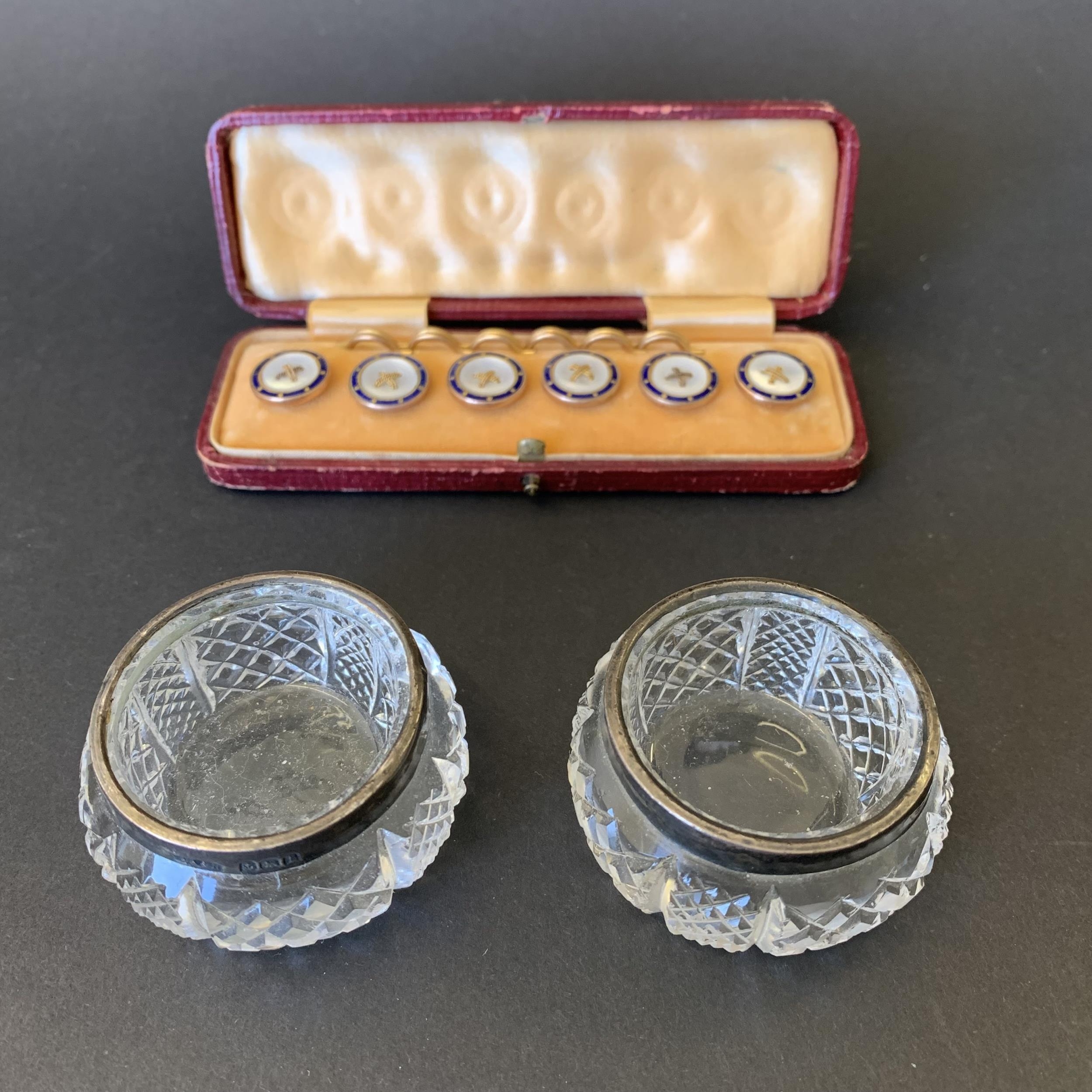 A pair of hallmarked silver rim and cut glass salts plus a boxed set of vintage enamelled waistcoat buttons
