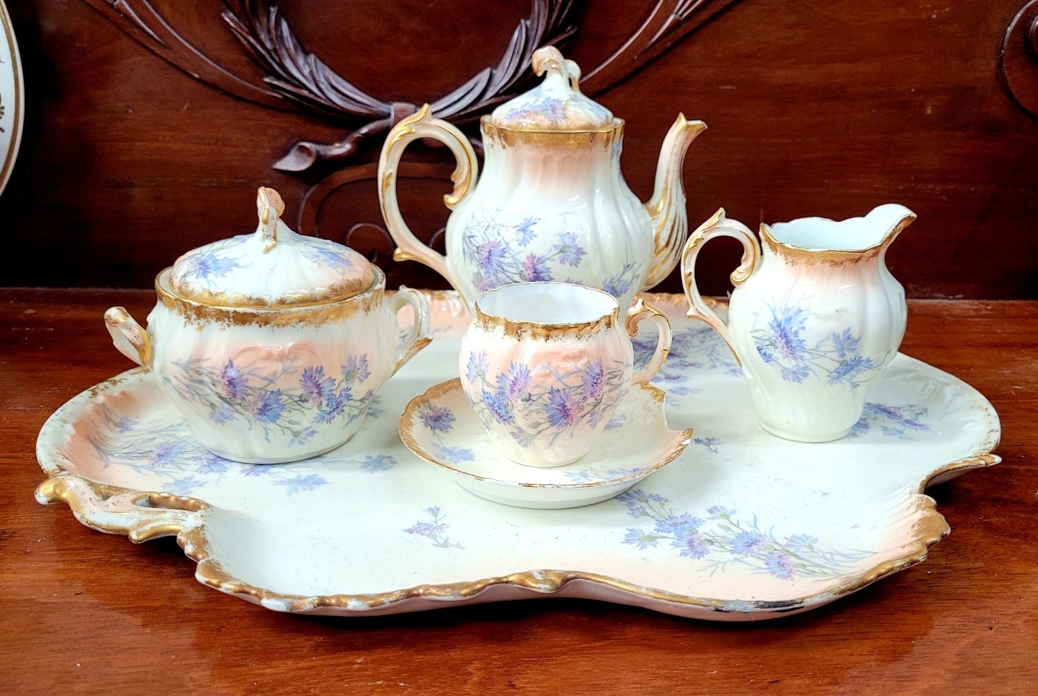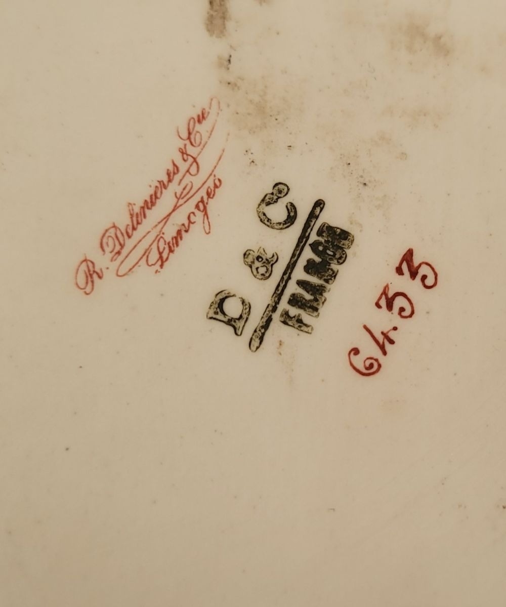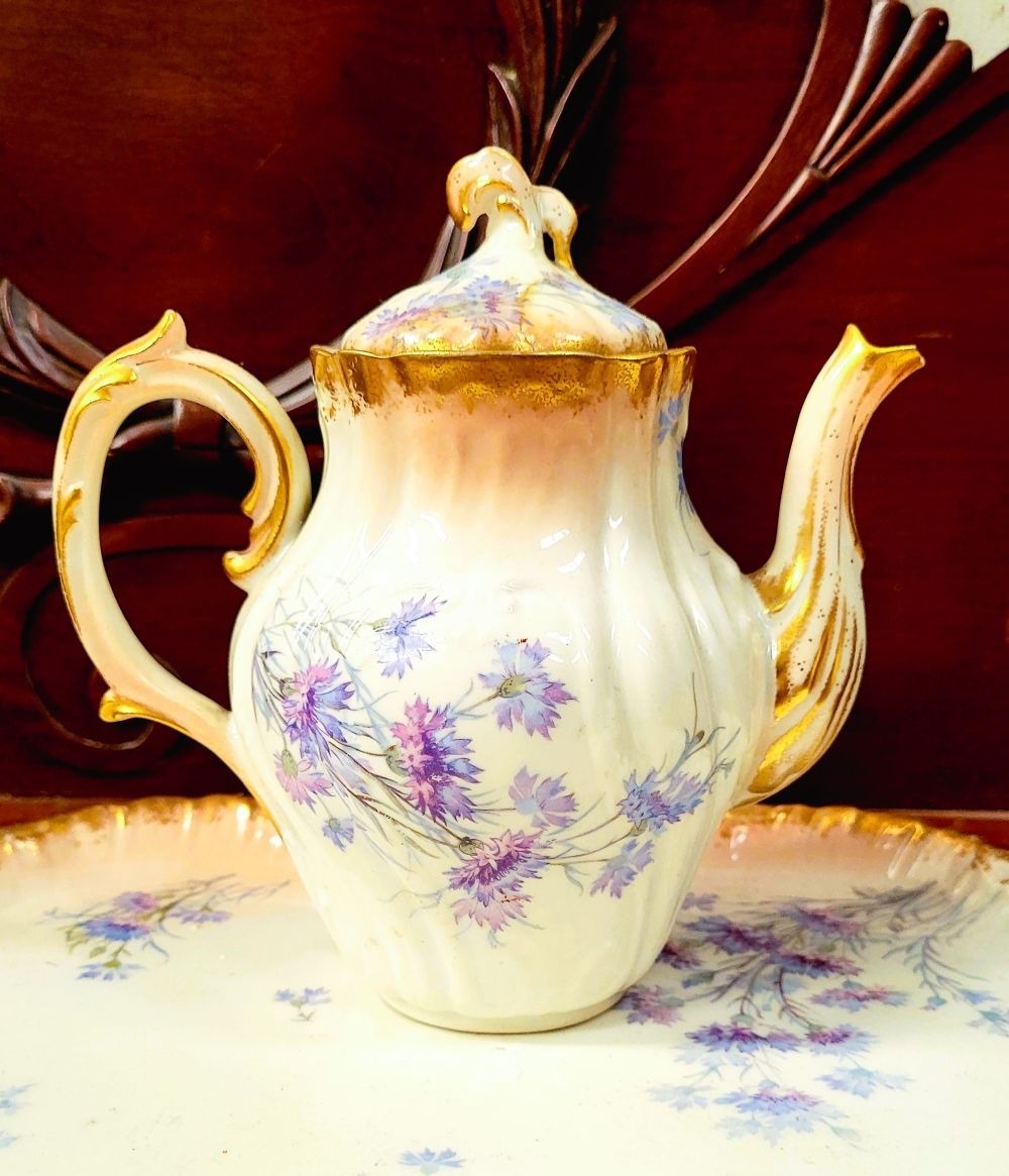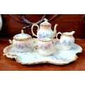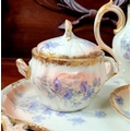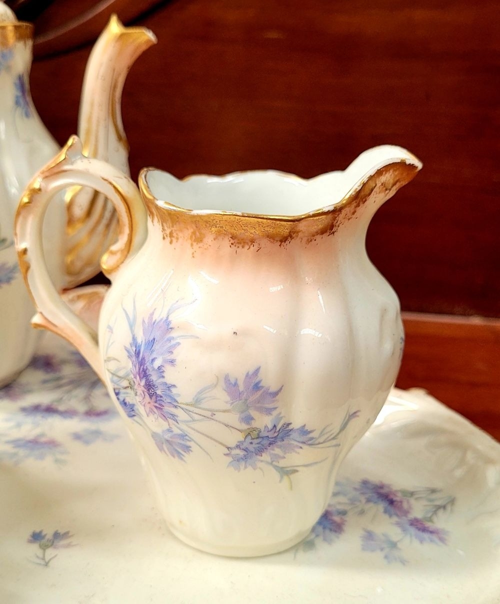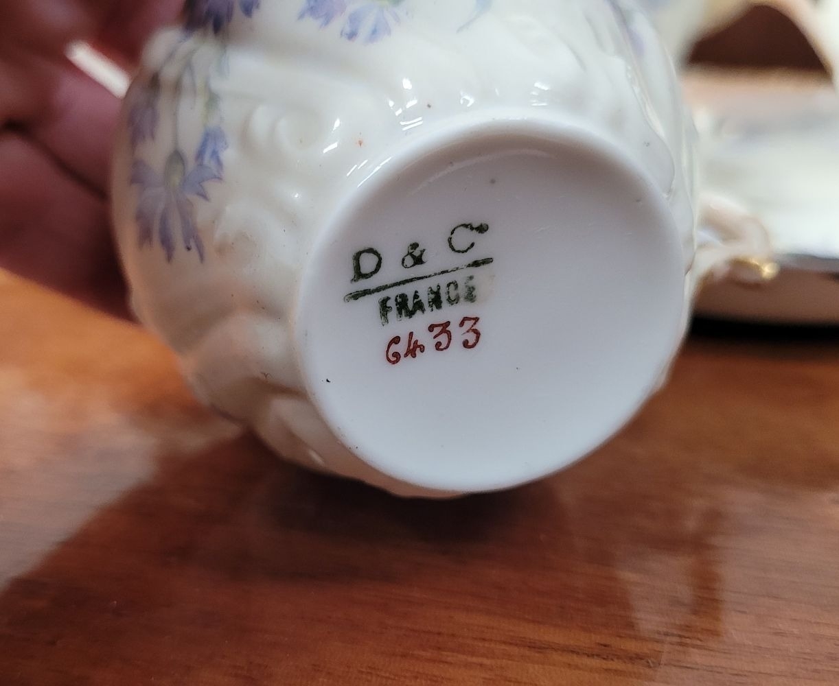 A DELICATE VINTAGE FRENCH MADE R. DELIMIERES & CIE, LIMOGES – D&C TEA SET, which includes a large tray, tea/coffee pot, a jug, a sugar bowl & a tea cup & saucer. Most in very good condition. There is an old fix to the lid of the pot, along with a little loss to the edge of the saucer. Maker’s mark/details to the underside of each piece. Tray size: 41.5 x 33.5cm (W x D), tea/coffee pot size: 17cm tall.