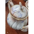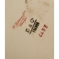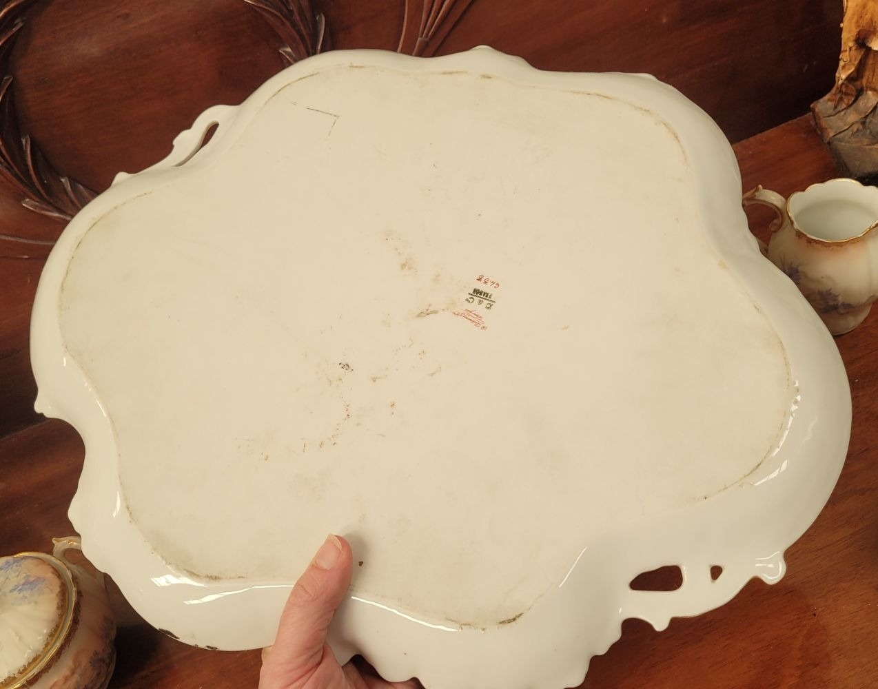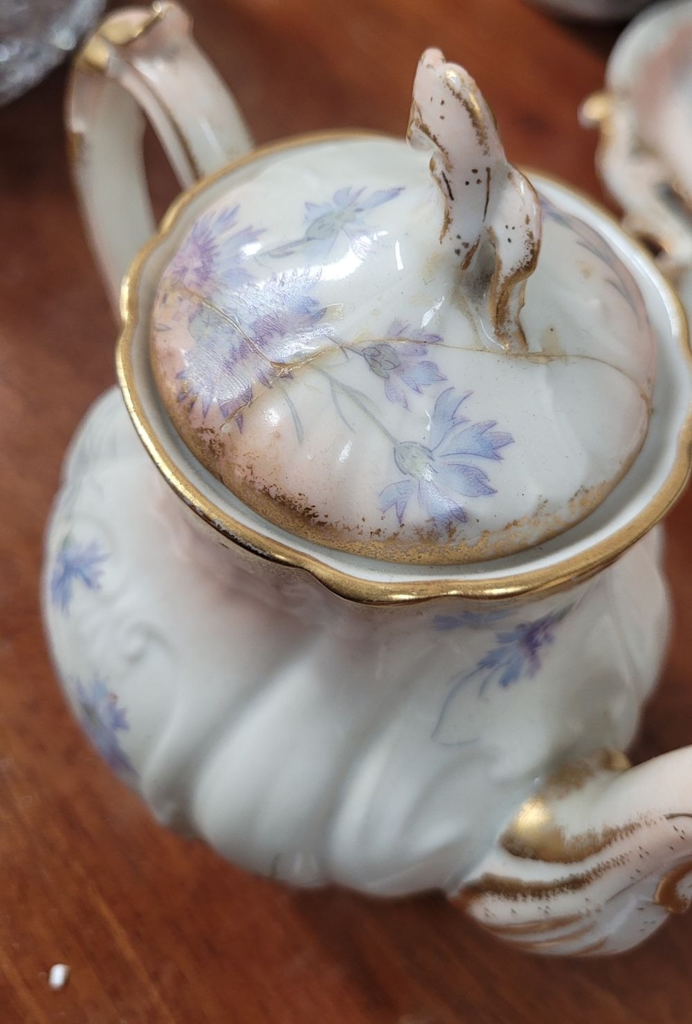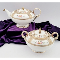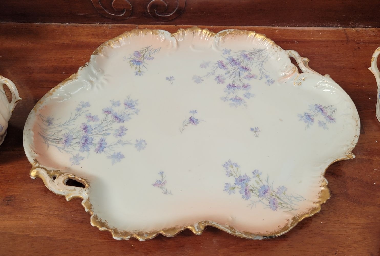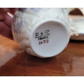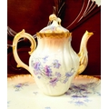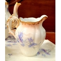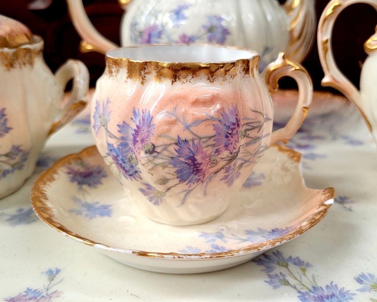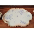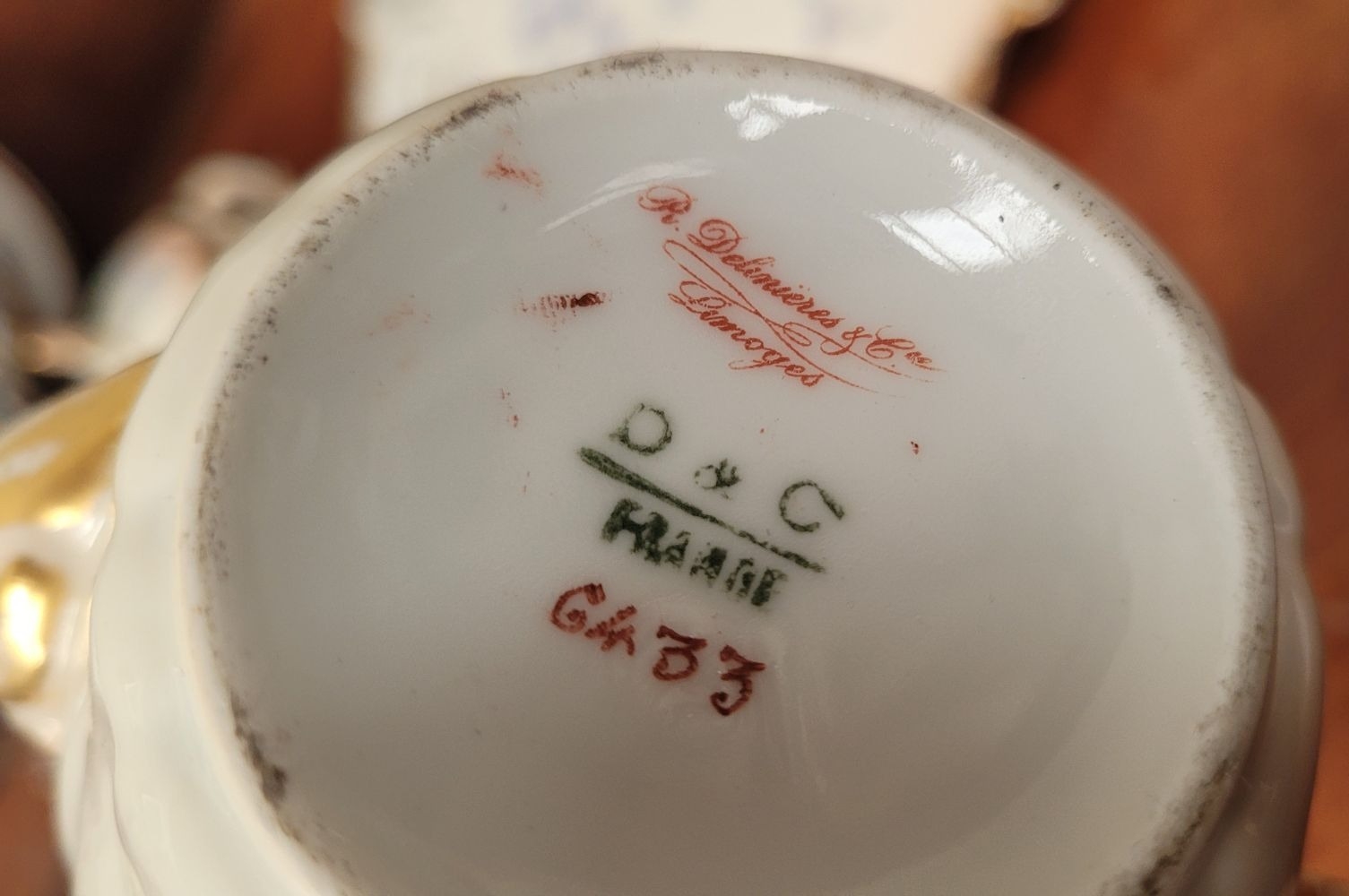 A DELICATE VINTAGE FRENCH MADE R. DELIMIERES & CIE, LIMOGES – D&C TEA SET, which includes a large tray, tea/coffee pot, a jug, a sugar bowl & a tea cup & saucer. Most in very good condition. There is an old fix to the lid of the pot, along with a little loss to the edge of the saucer. Maker’s mark/details to the underside of each piece. Tray size: 41.5 x 33.5cm (W x D), tea/coffee pot size: 17cm tall.