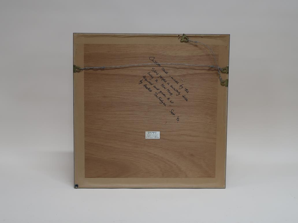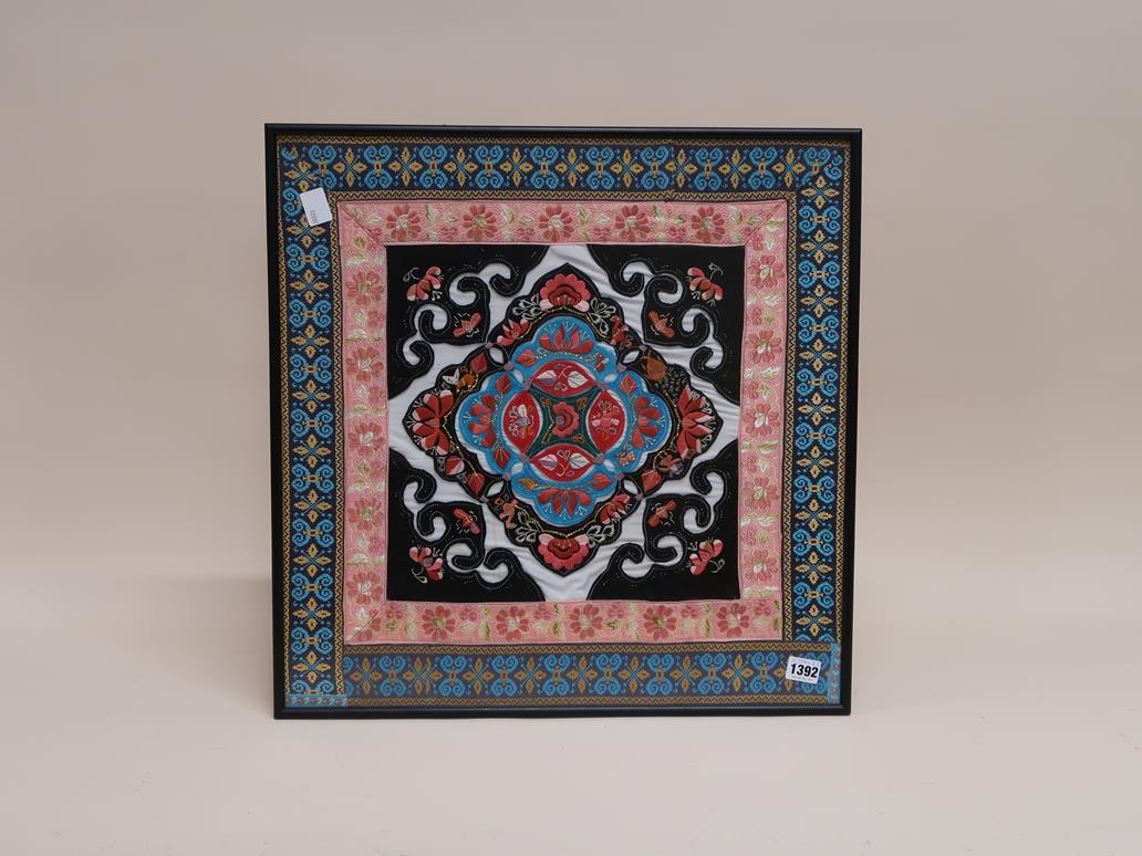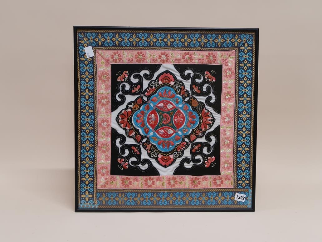 FRAMED CUSHION COVER BY THE SANI PEOPLE WHO LIVE IN THE KUNMING REGION OF CHINA, F/G, 53CM X 63CM