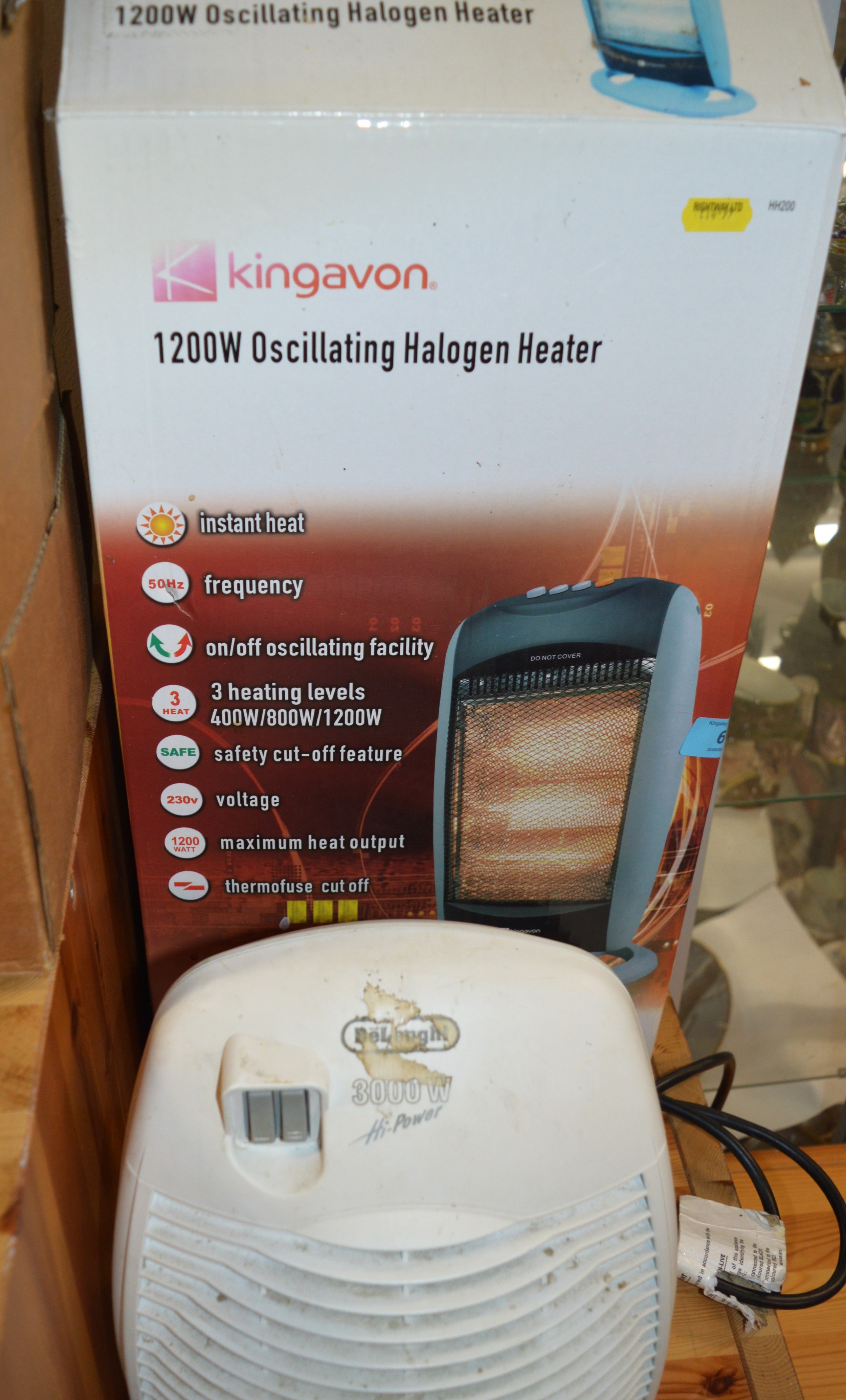 Boxed Kingavon 1200W Oscillating Halogen Heater, Plus One Other De Longhi Fan Heater