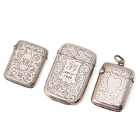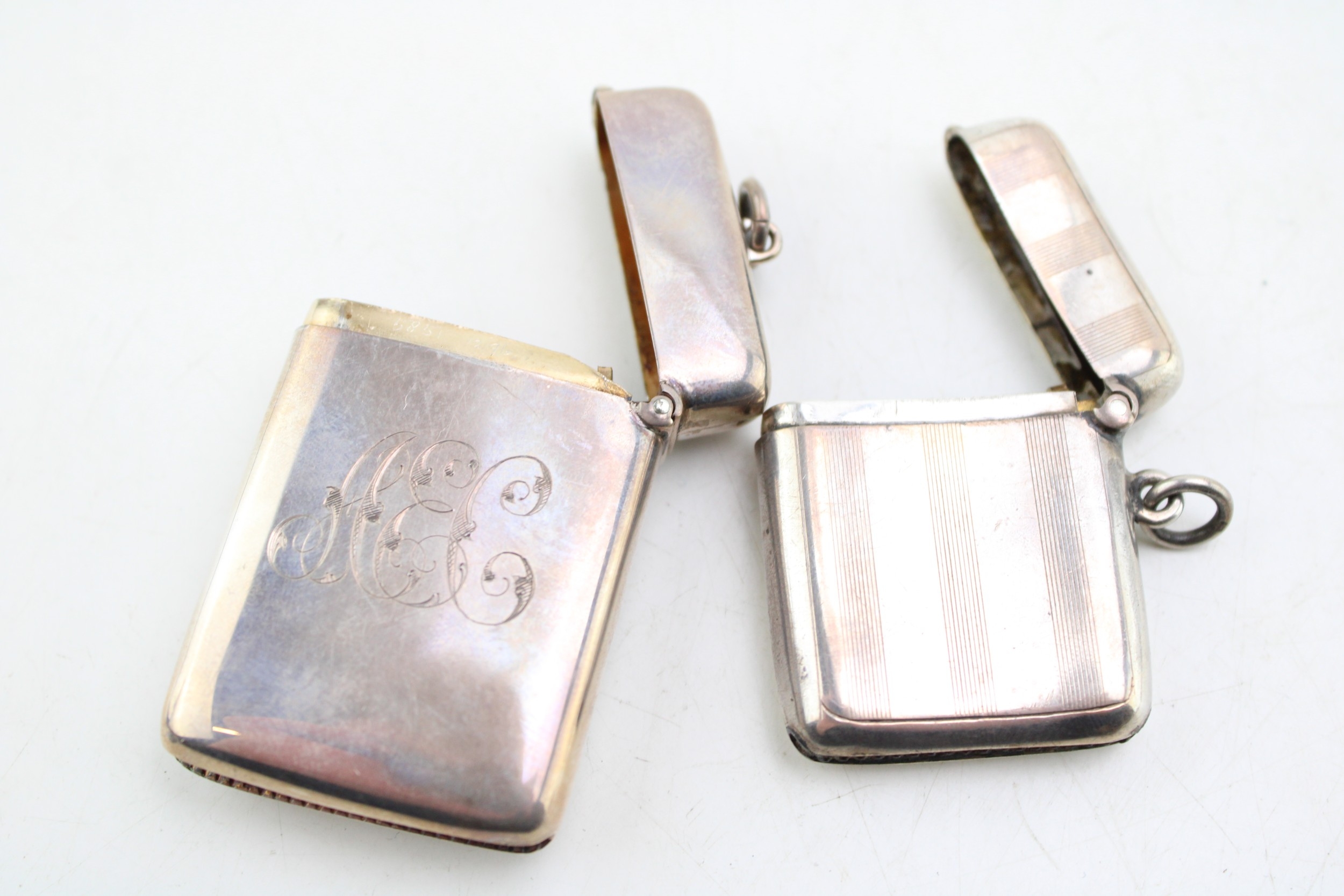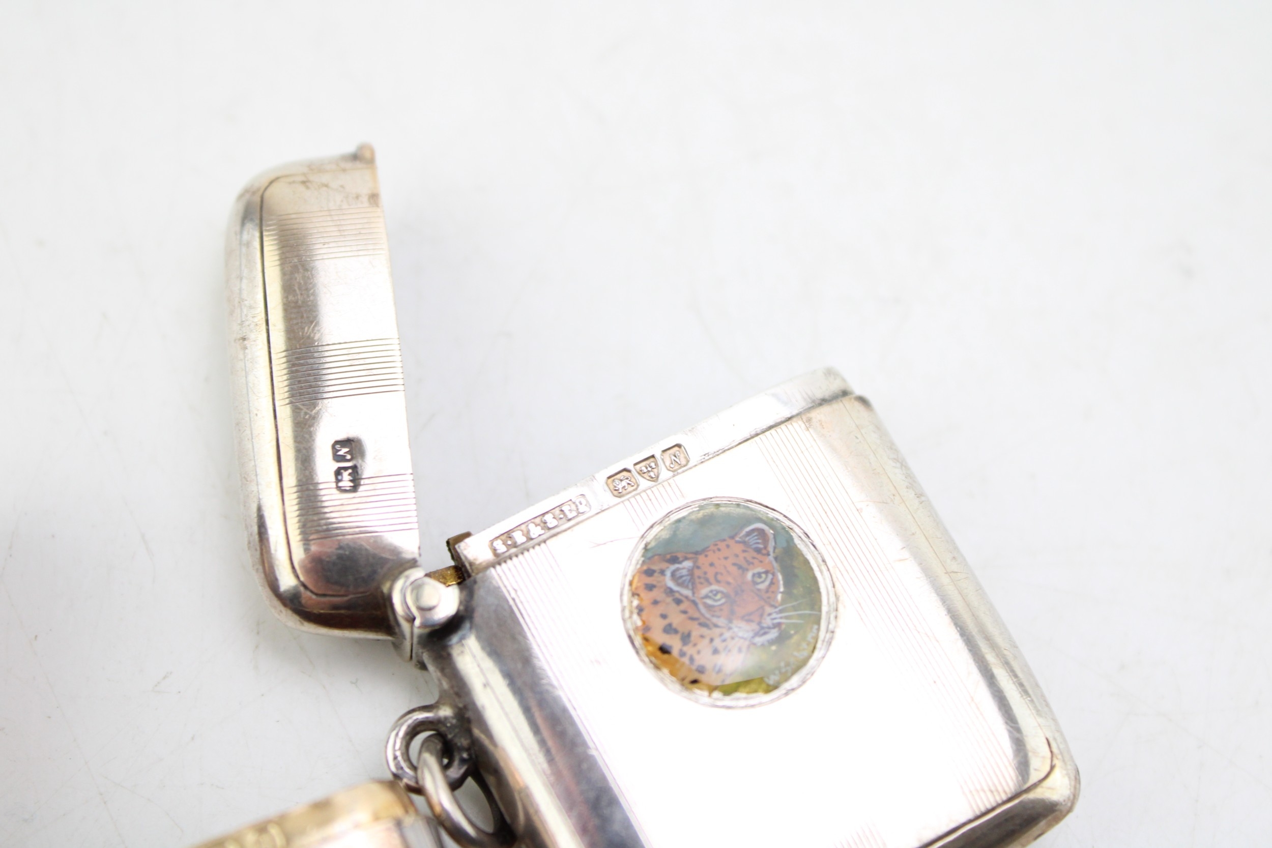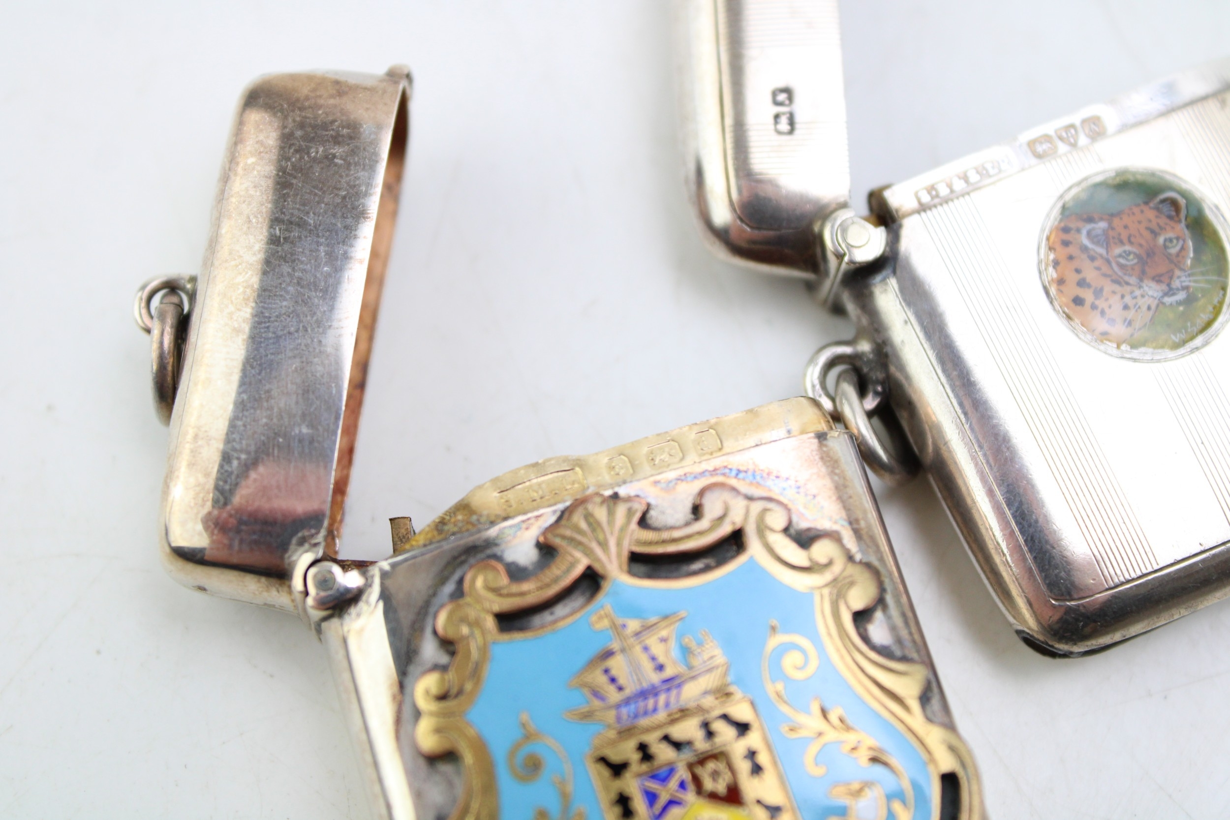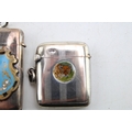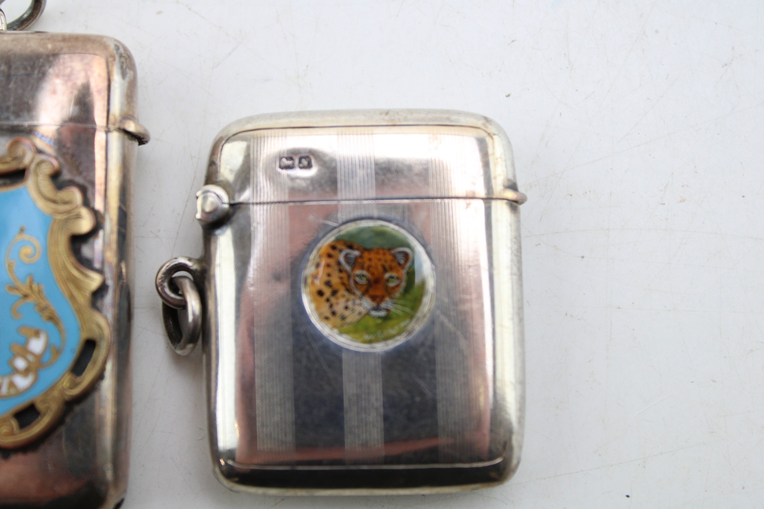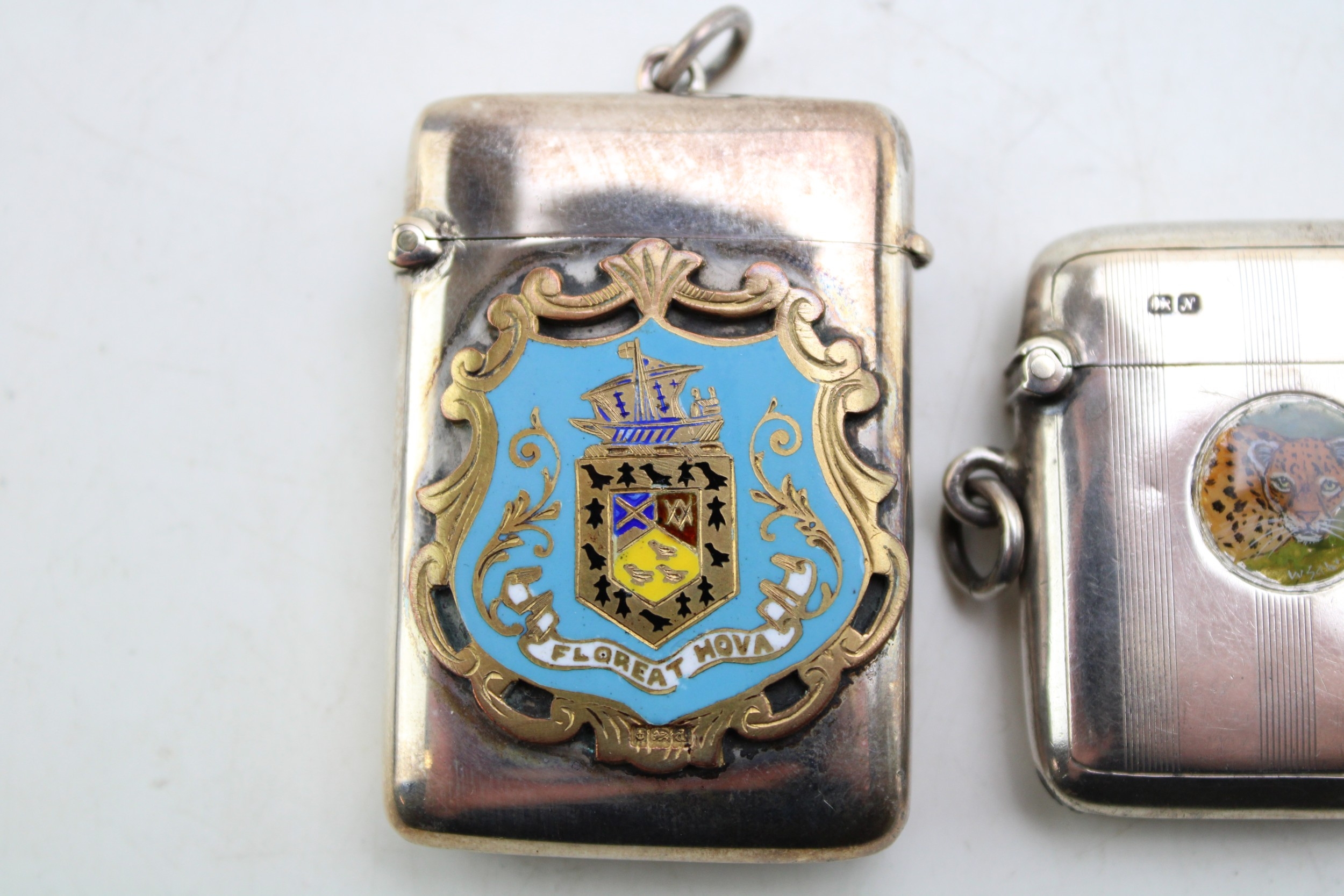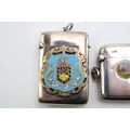 An Edwardian silver vesta case with applied silver gilt and enamel coat of arms for Hove, being the Hove Ship Arms, Samuel M Levi, both Birmingham 1903, and a later silver vesta case with enamel leopard to the front reserve, S Blankensee & Son Ltd, Chester 1913, enamel signed indistinctly, combined weight 60.0g, 1.94toz.