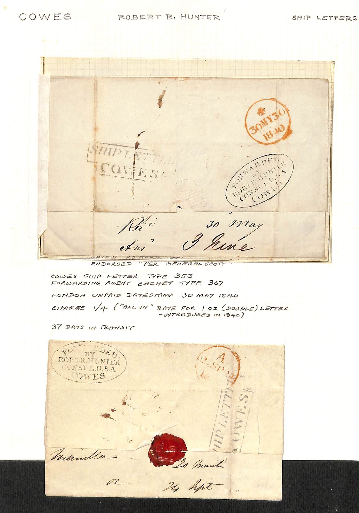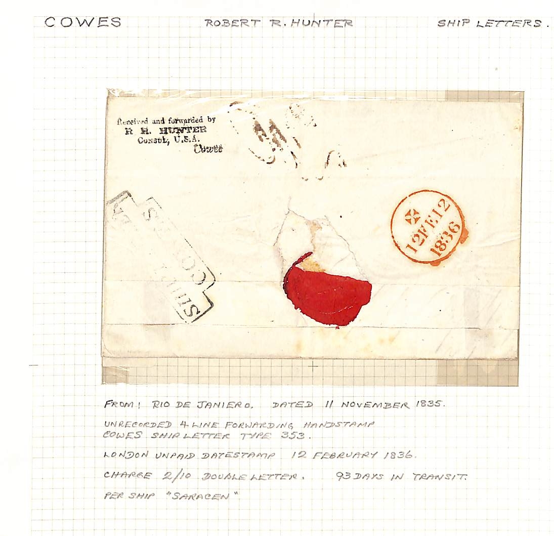 Cowes - Forwarding Agents. 1836-40 Entires from Rio de Janeiro, Matanzas or Manila to London all with Cowes Ship Letter handstamps and unframed or oval framed (2) forwarding agents handstamps of Robert R. Hunter, U.S Consul at Cowes. (3).