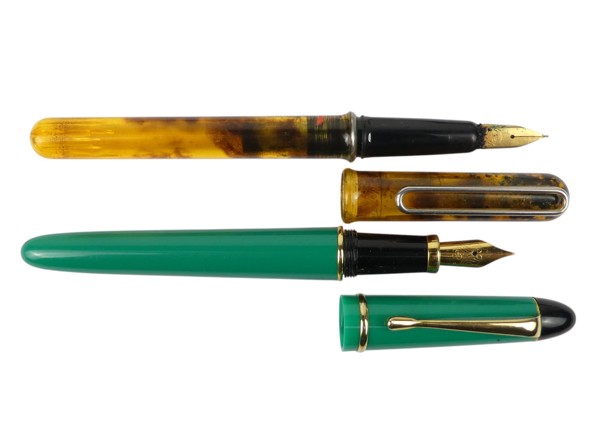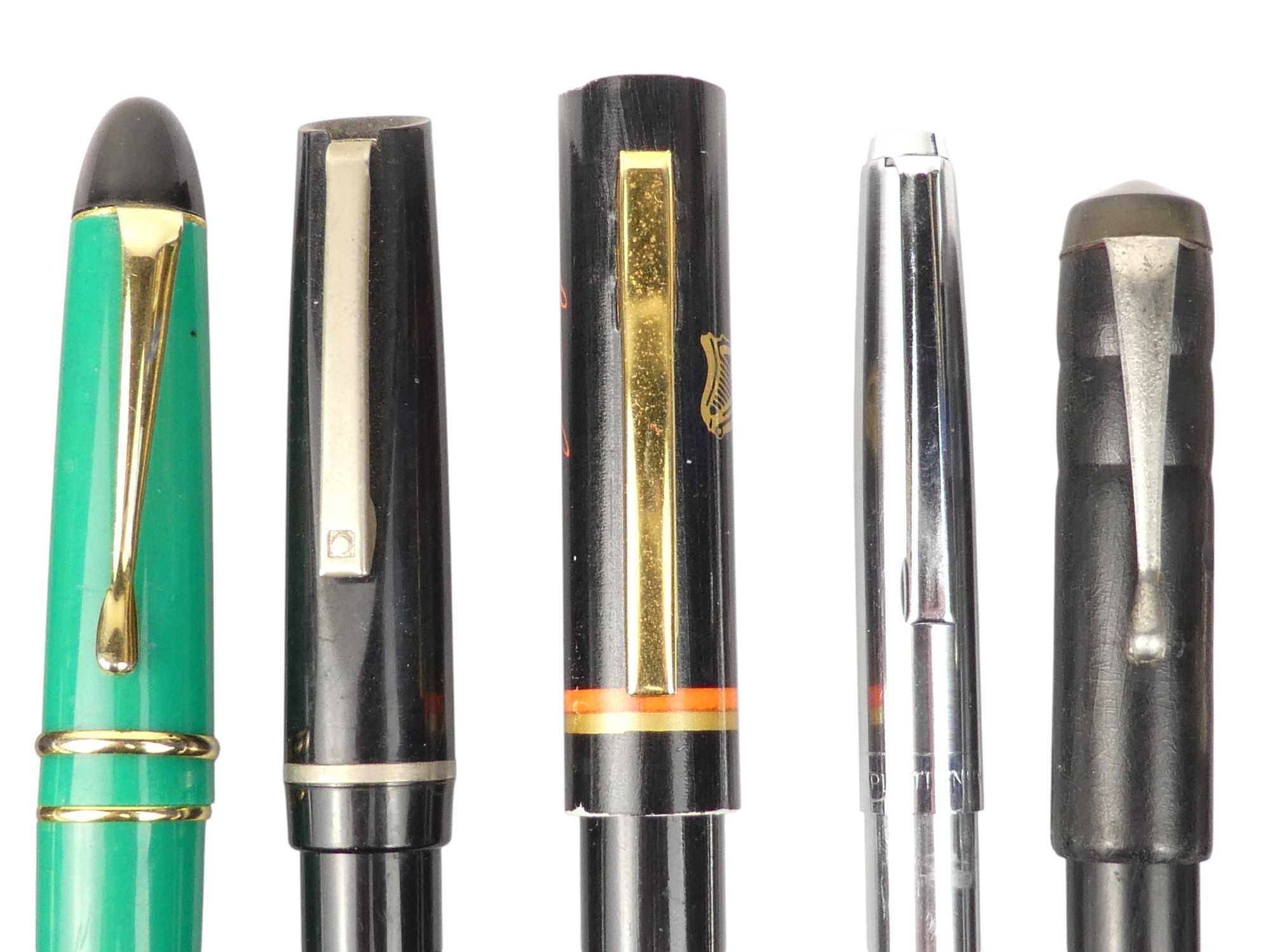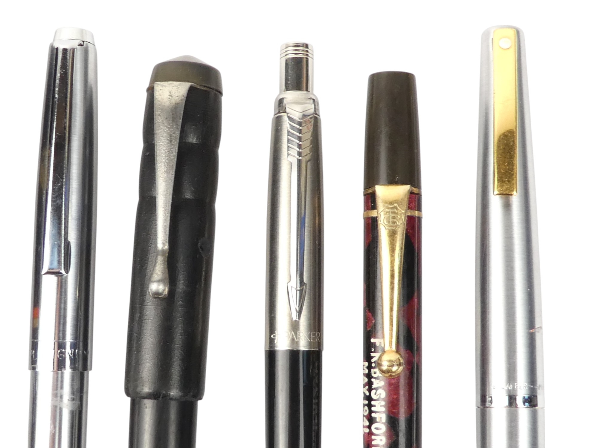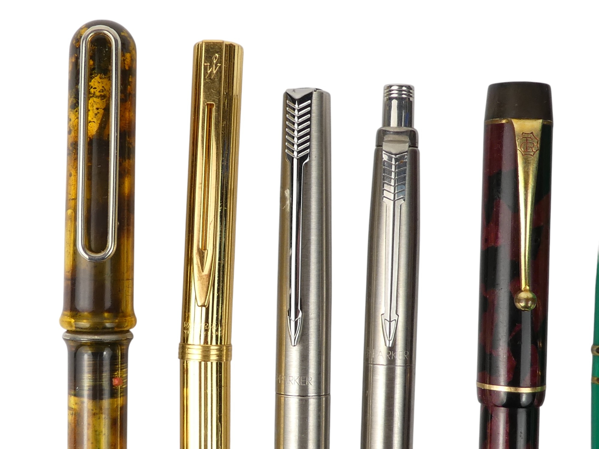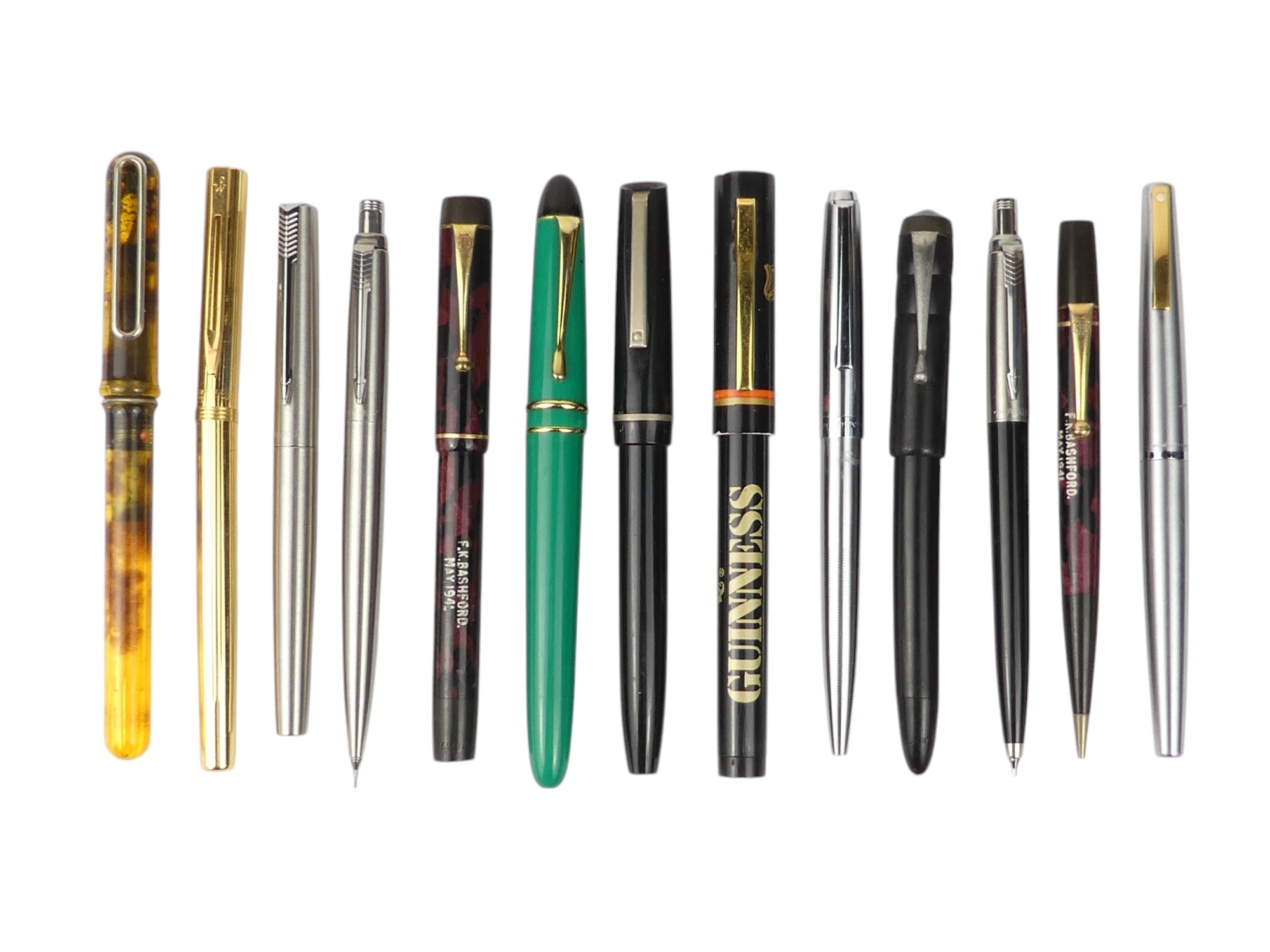 A collection of writing tools - including various Parker fountain pens.