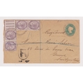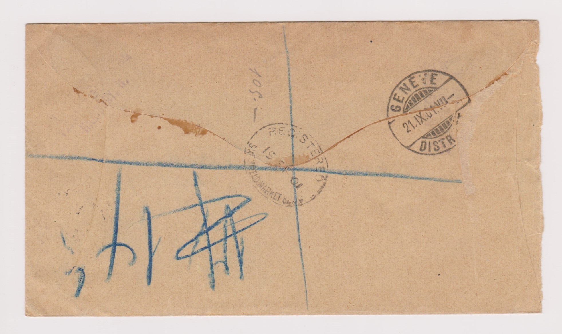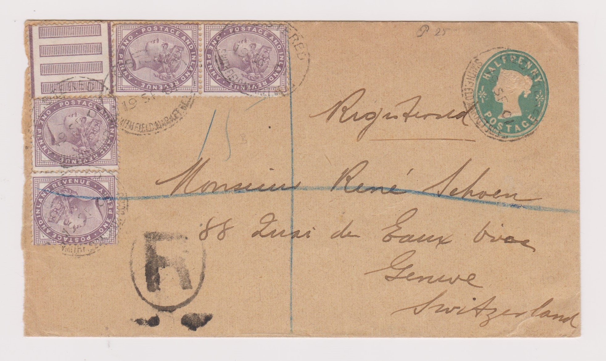 Great Britain 1901-Prepaid Michel U14 envelope posted registered to Geneva cancelled registered Smithfield Market on 1/2d postage and 4x SG172-1d stamps black ringed R cancelled received Geneva 21.9.01