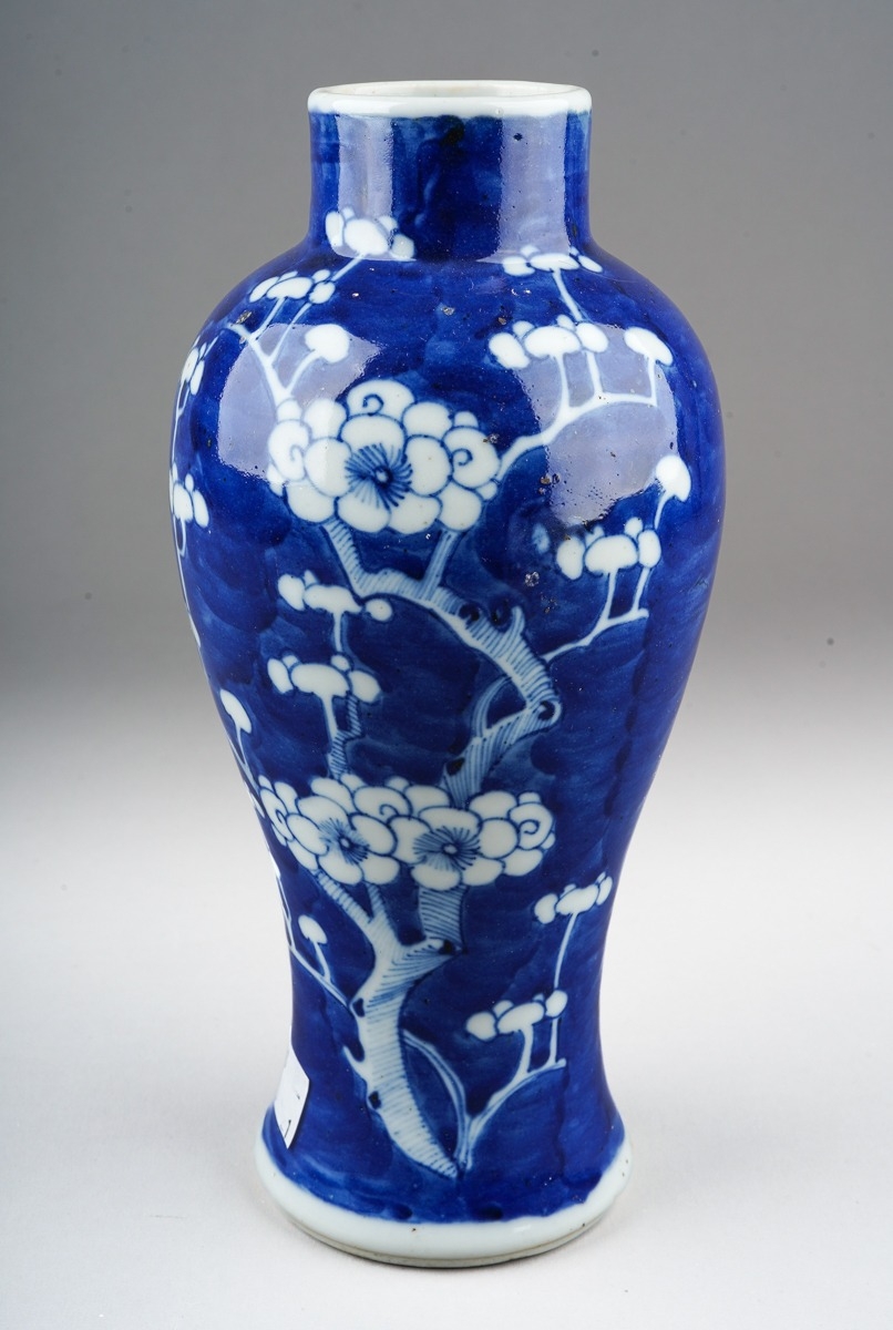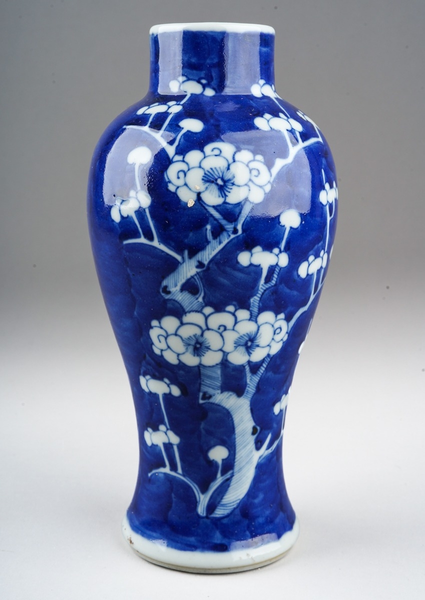 A 19th century Chinese porcelain baluster vase decorated with pruus blossom, four character mark to base, height 22cm