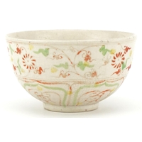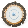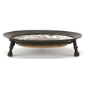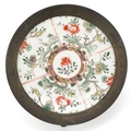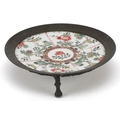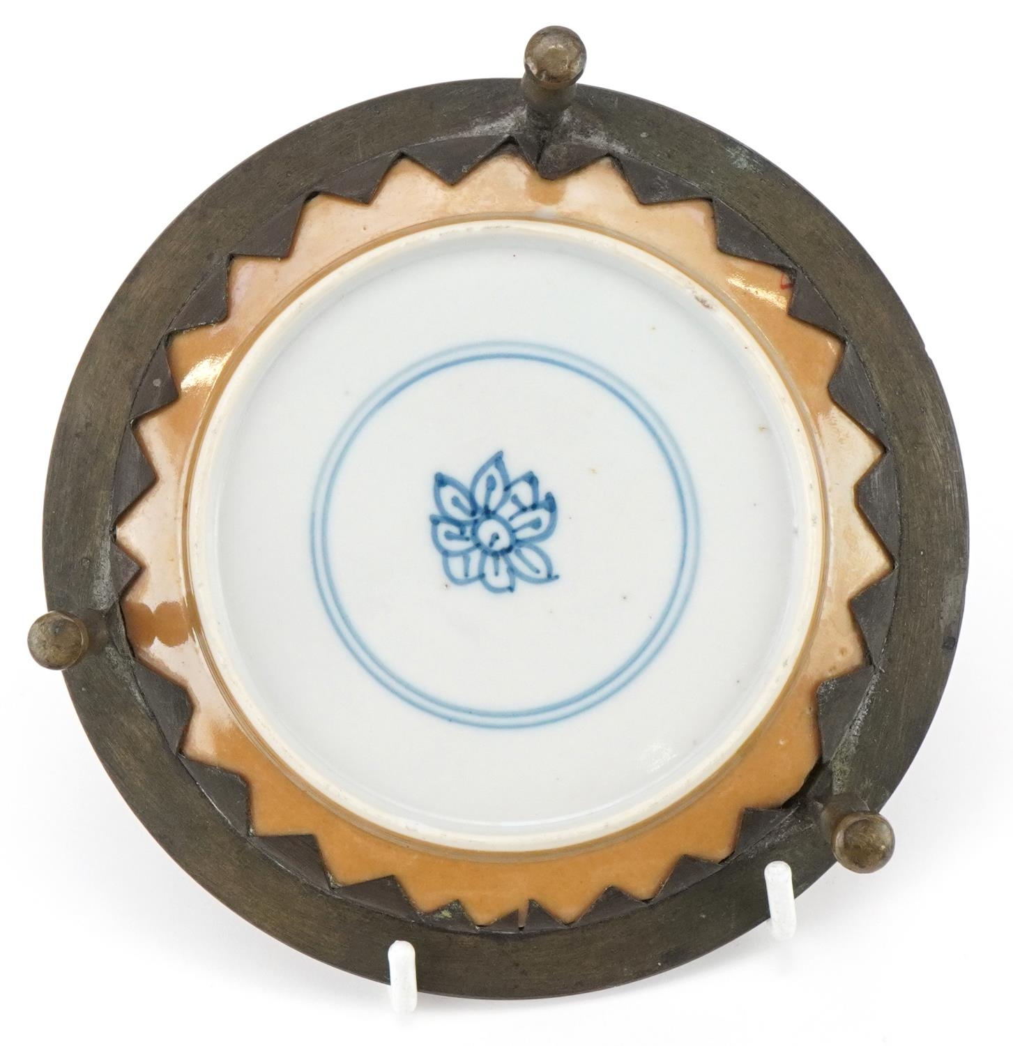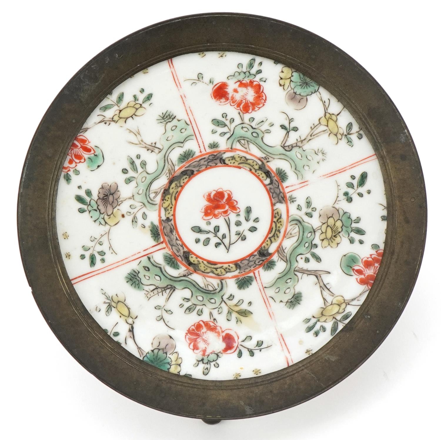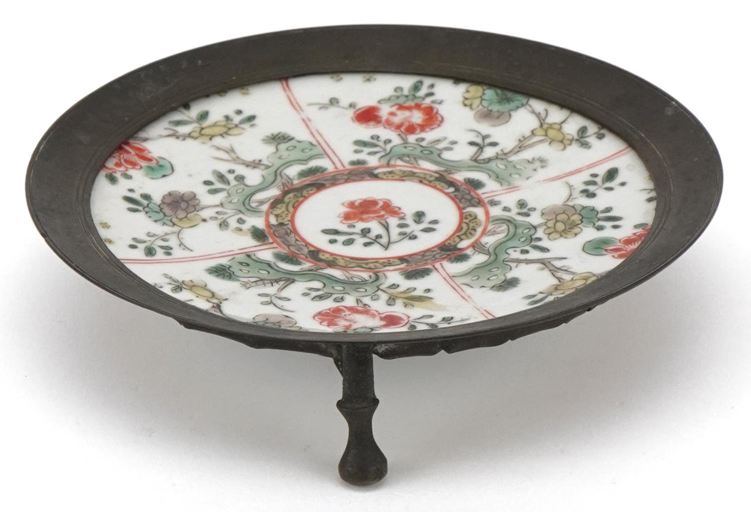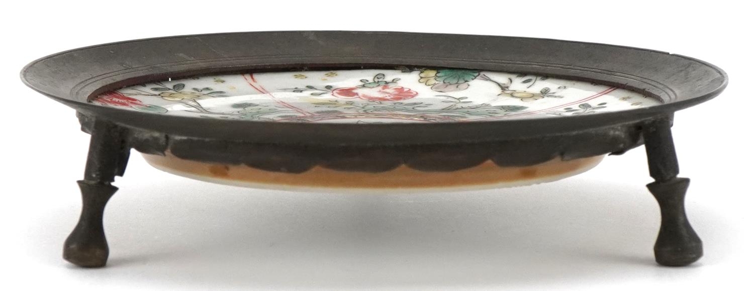 A Chinese porcelain dish hand painted with flowers, possibly Kangxi, mounted in a tripod stand, 12cm high.