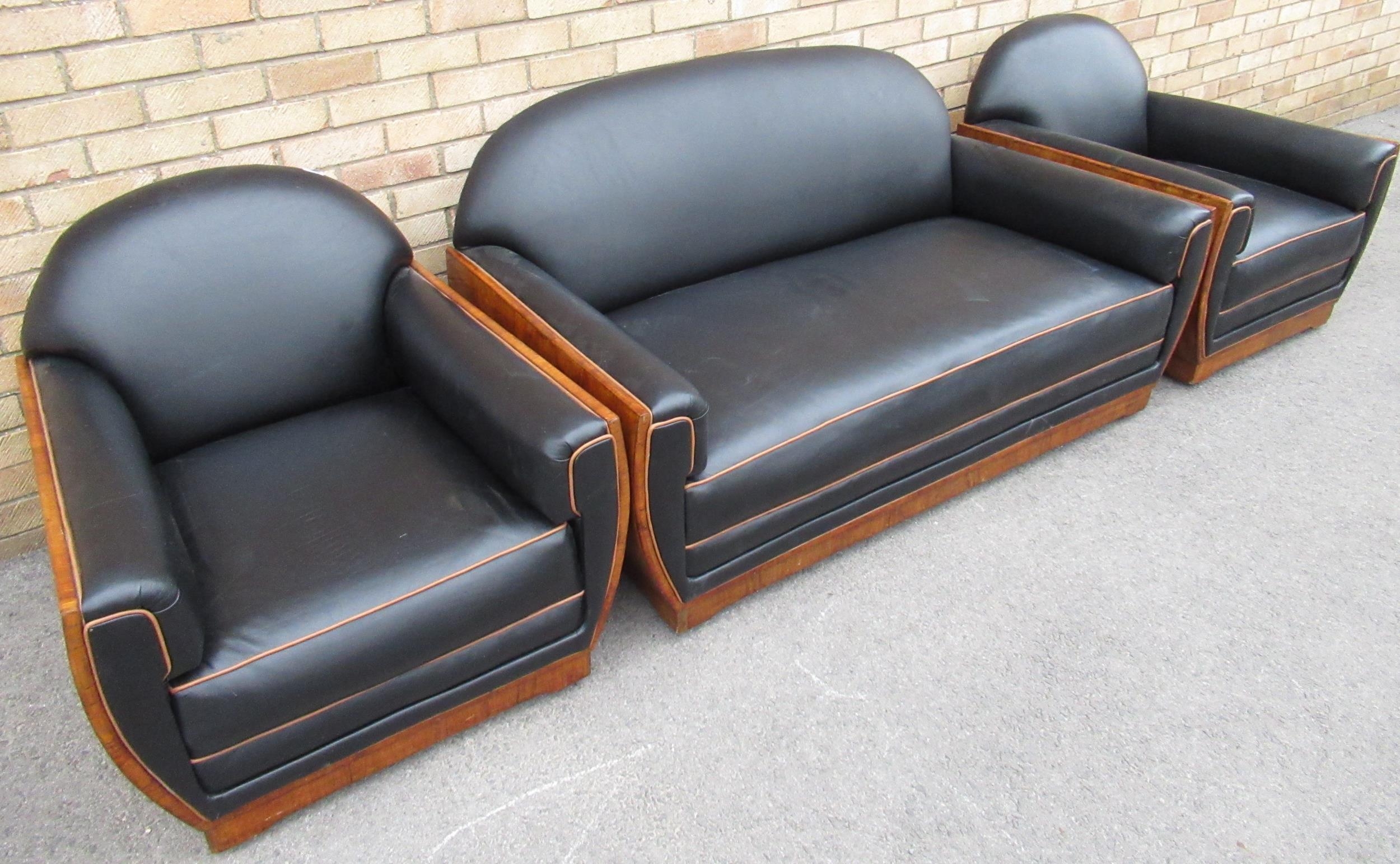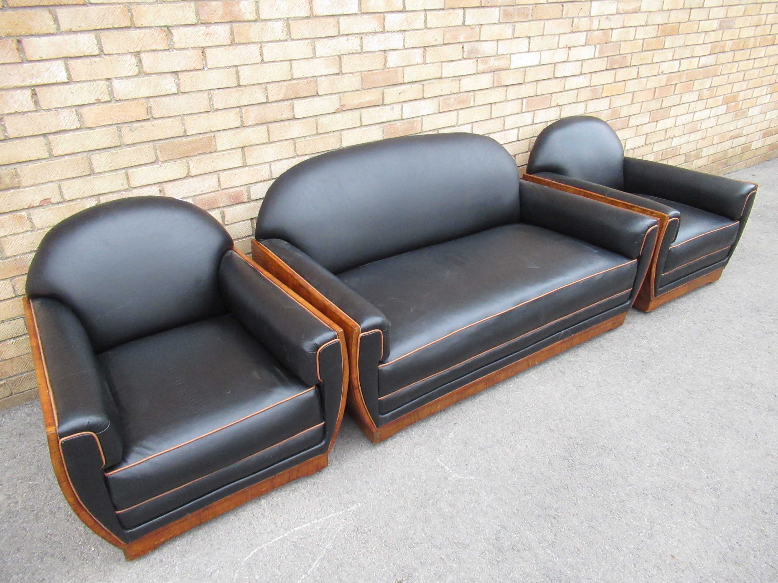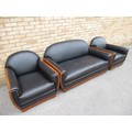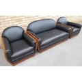 Art deco Italian walnut framed three piece suite comprising of a two seater sofa and a pair of matching armchairs upholstered in black leather with red piping