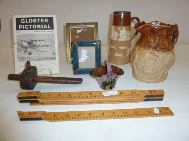Doulton Lambeth stoneware jug with silver mounted rim, a Doultonware jug, picture frames, wood working tool, rules etc