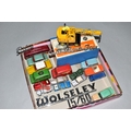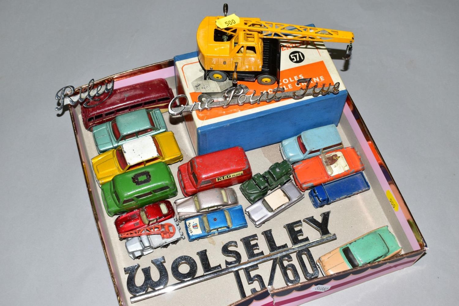 A QUANTITY OF BOXED AND UNBOXED PLAYWORN DIECAST VEHICLES, to include Dinky Supertoys Coles Mobile Crane, No 571, complete but in need of re-stringing and in very lightly playworn condition with only minor paint loss and wear, box in good condition but missing packing pieces and instructions, with unboxed Spot-On M G Midget MKII, No 281, Dinky Toys, Hillman Minx, No 175, light brown body, green roof and boot, beige hubs, Corgi Toys Bedford C A Van 'KLG Plugs' No 403M, Dinky, Corgi, Matchbox, with a Wolseley 15/60 and Riley One Point Five chrome car badges, all marked J Fray Ltd to backs
