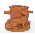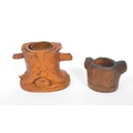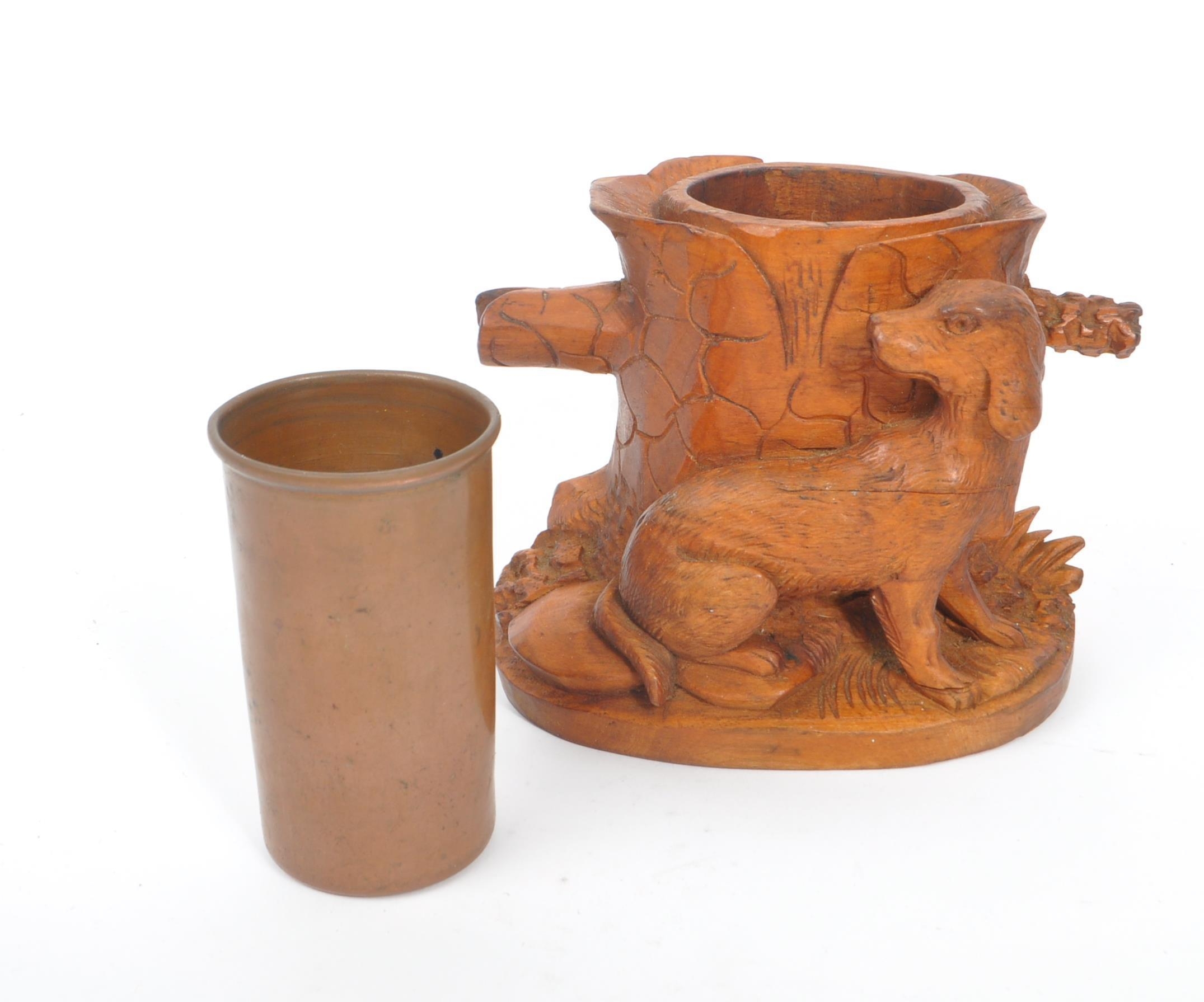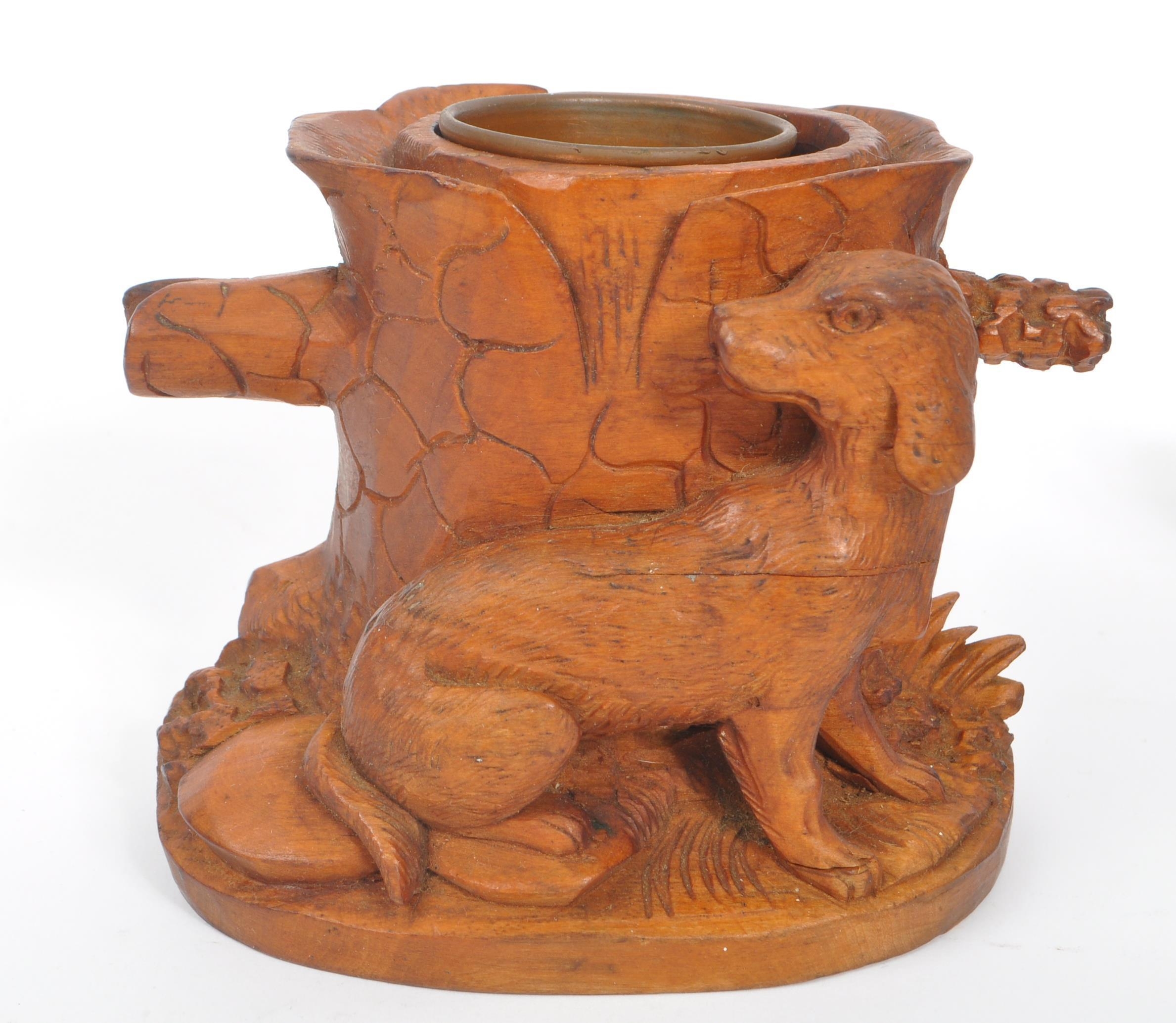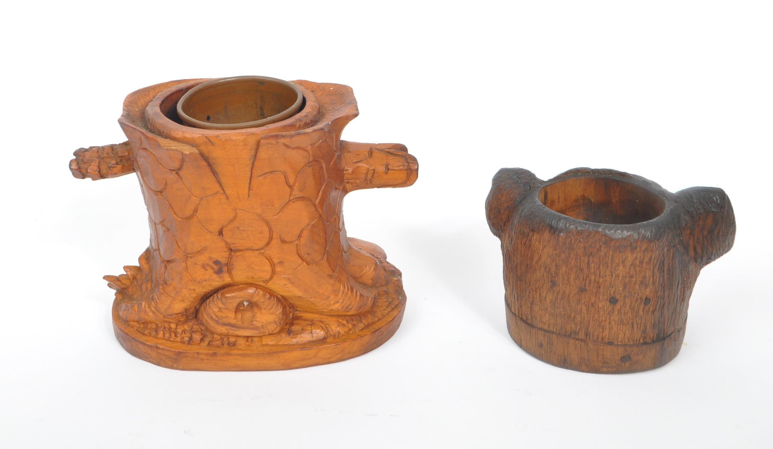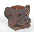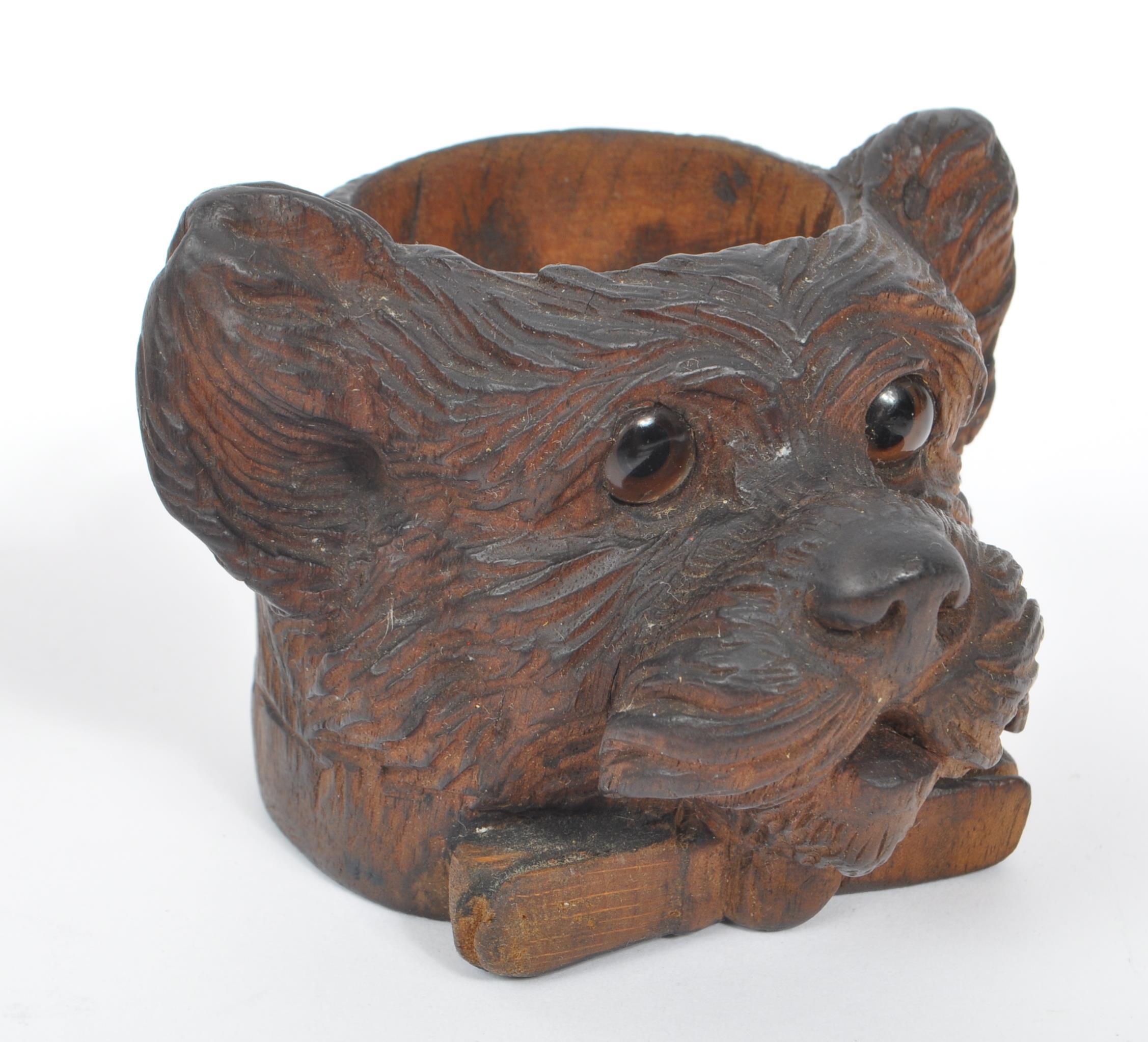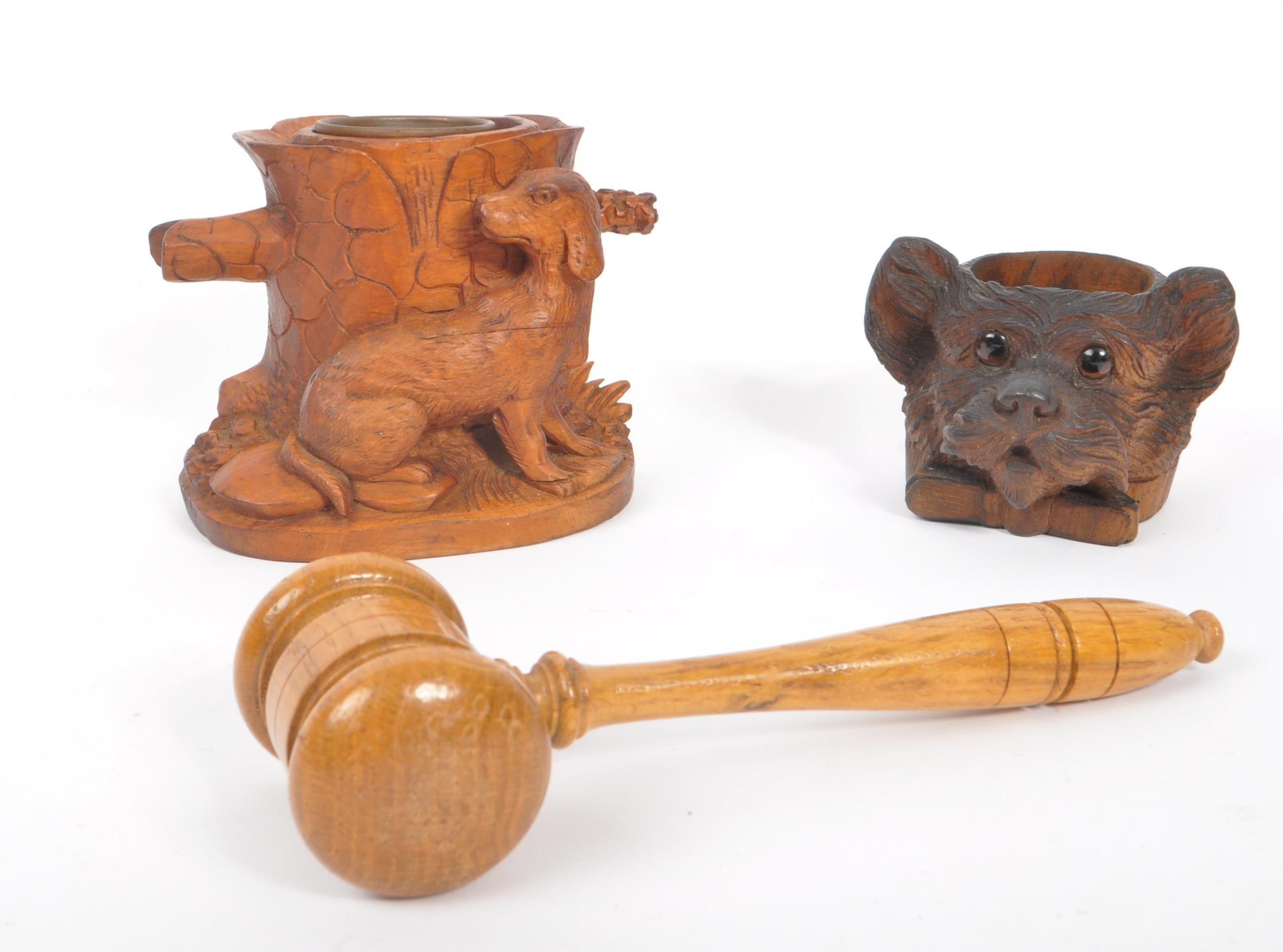 A collection of wooden items to include a black forest candle holder in the form of a dog's head with glass eyes.Together with a hand carved pot depicting a woodland scene with trunk of tree and dog, accompanied by a gavel. Largest measuring approximately 9cm x 12cm x 9cm.