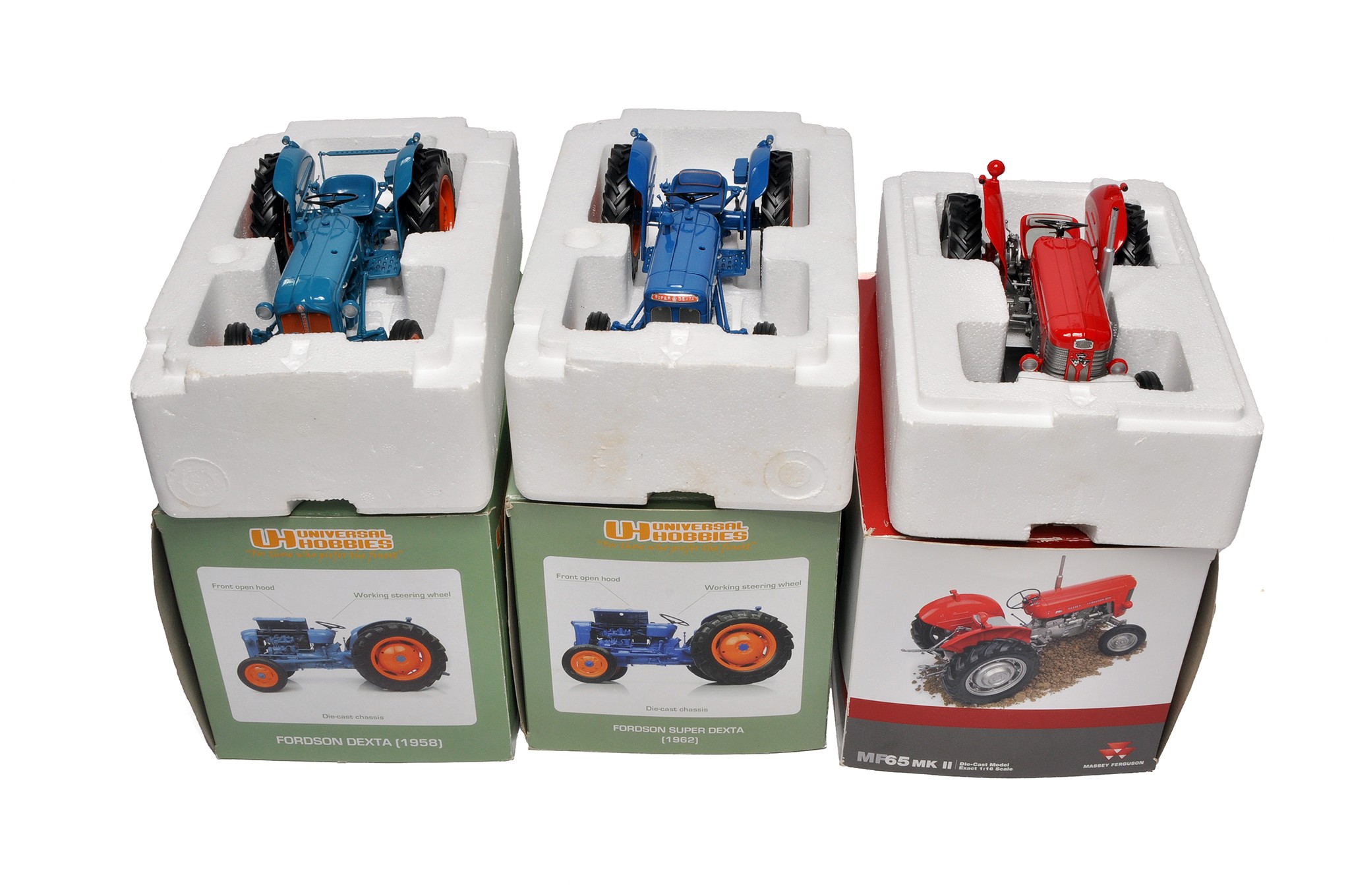 A group of 3 x Universal Hobbies 1/16 farm model issues comprising Fordson Dexta and Super Dexta (both with faults e.g. missing exhausts also foot plate loose in box on one) plus Massey Ferguson 65 MKII Tractor (Fault free).