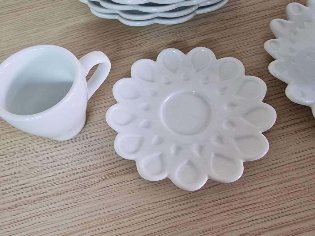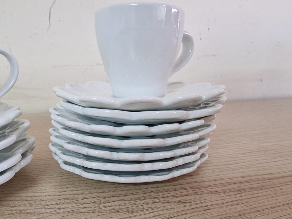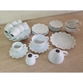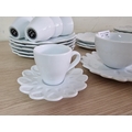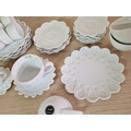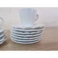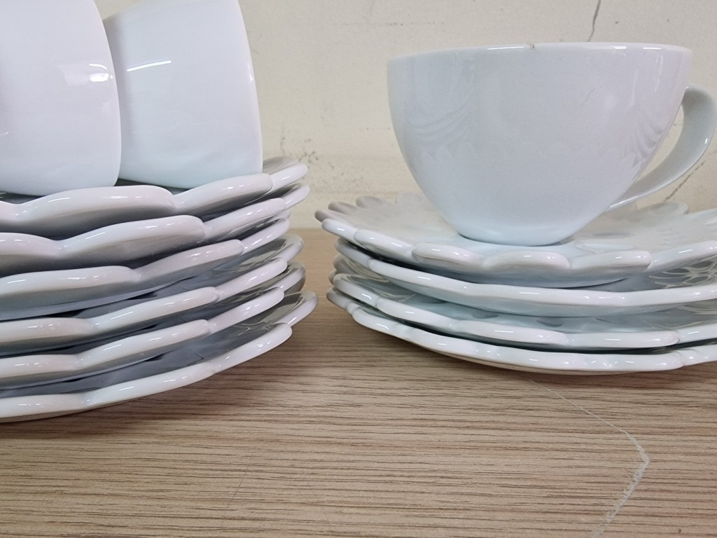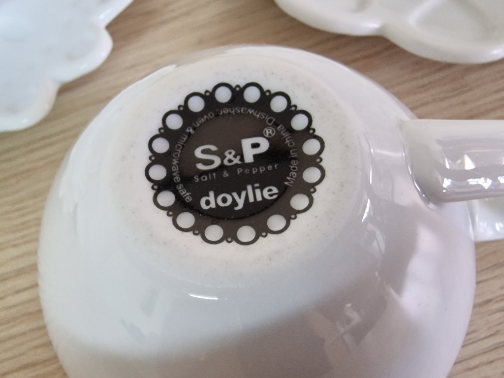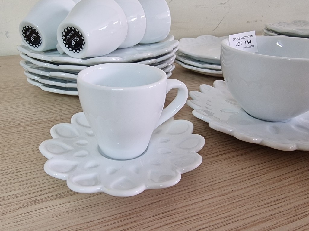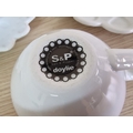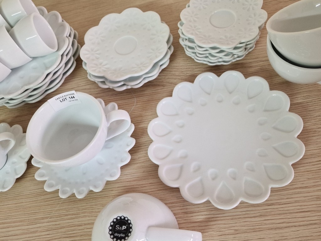 S&P (Salt & Pepper) 'Doylie' Tea Set; Modern White Shaped Tea Cups, Coffee Cups and Side Plates, (see multiple catalogue images)