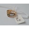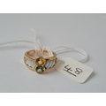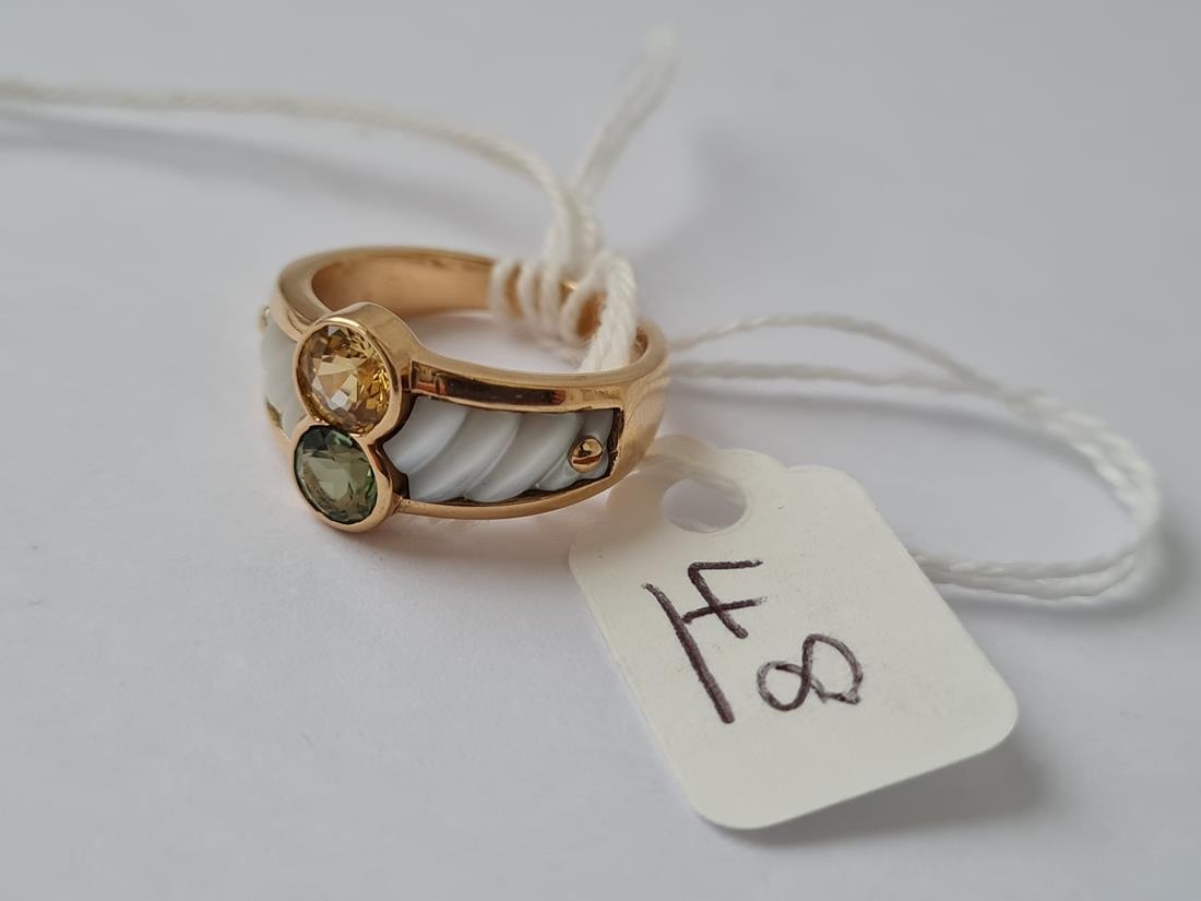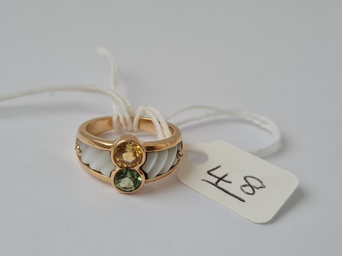 A TOURMALINE & YELLOW SAPPHIRE & CARVED MOP SET RING IN 18CT GOLD - size K - 6.7gms