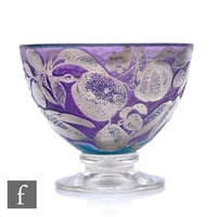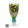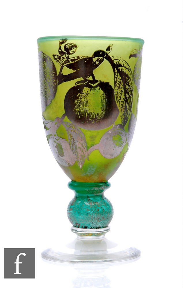 Jonathon Harris - Ironbridge - A contemporary studio Trial silver cameo glass goblet, of elongated ovoid form on knopped stem and circular foot, silvered autumnal fruits and leaves over matt green ground and clear glass, the knop with silver leaf inclusions, engraved signature and titled 'Legends in Glass Trial', dated 2000, height 19cm.
