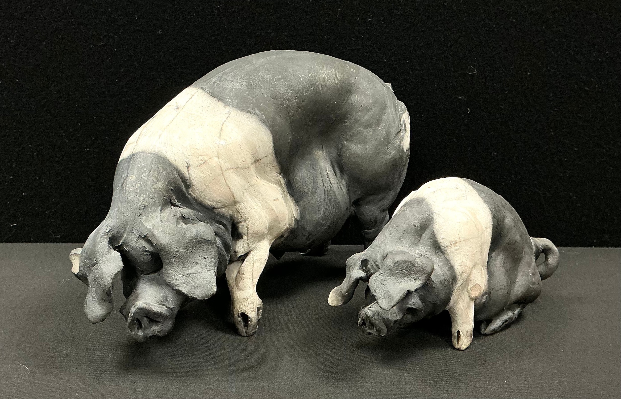 Christine Cummings (1969-2023) a raku sculpture of a saddleback pig, incised CC mark, dated Sept 20, approx 12cm high, 22cm long, another smaller sitting, signed CC, dated Sept 20, 7cm high, 13cm long (2)