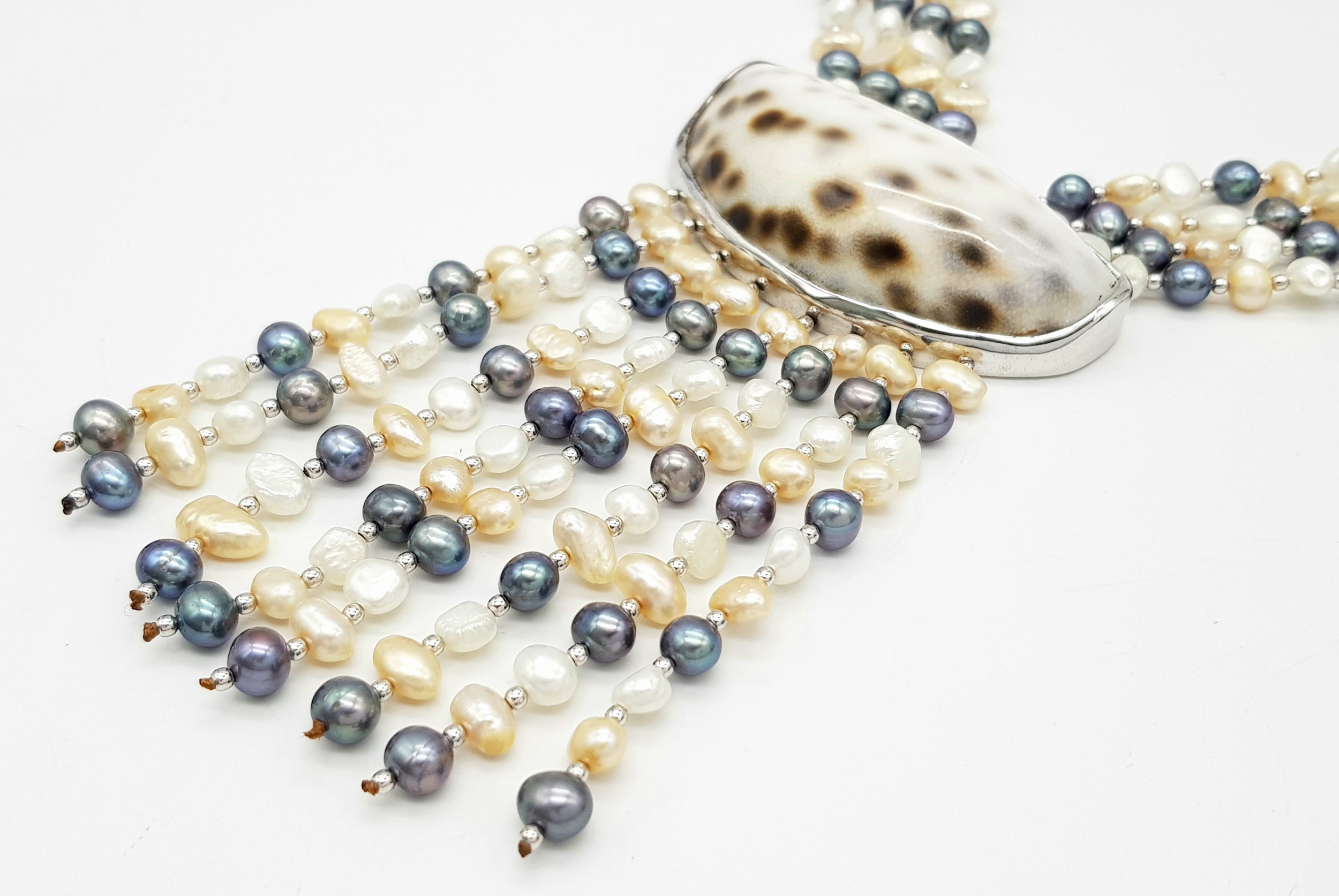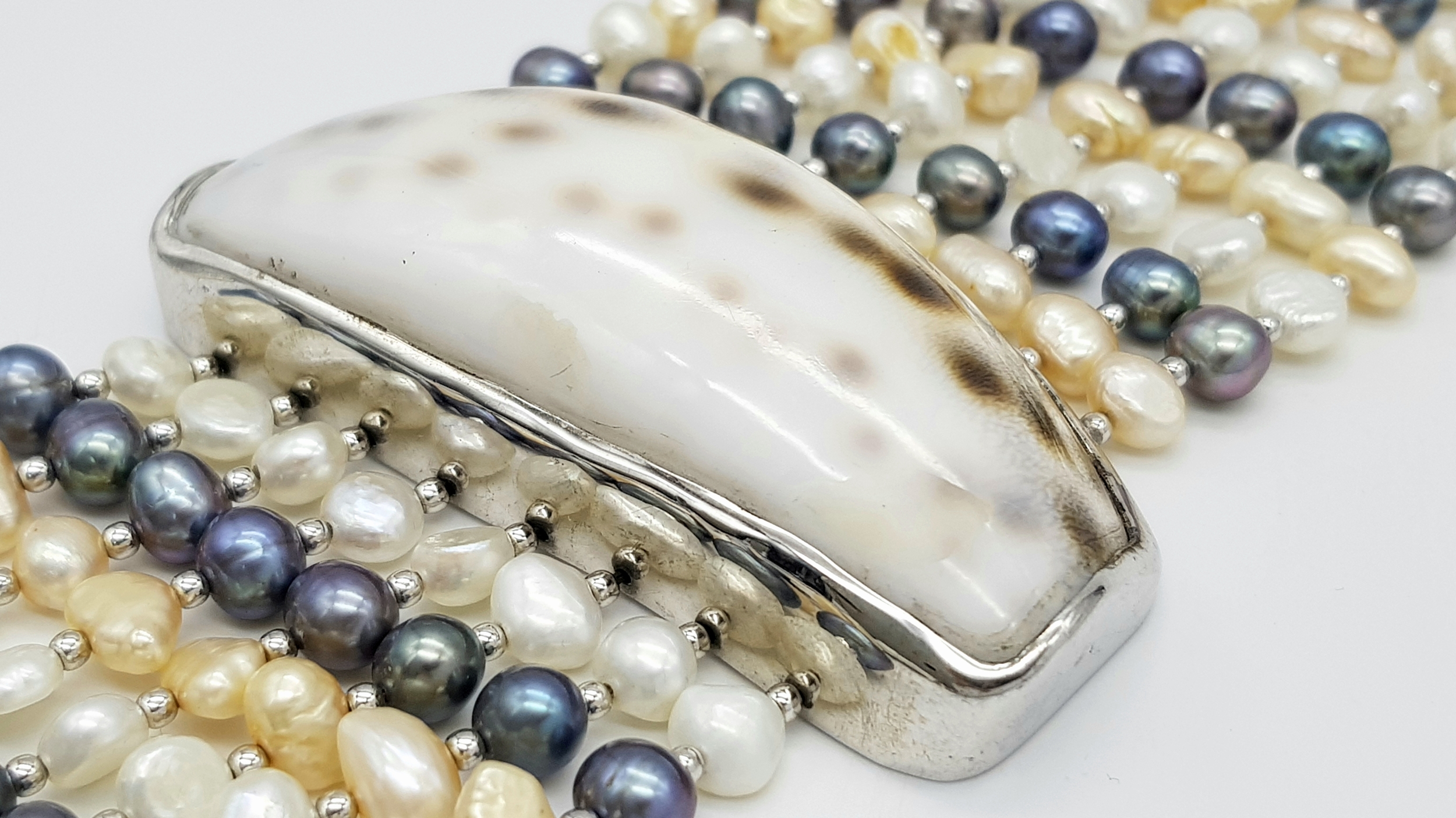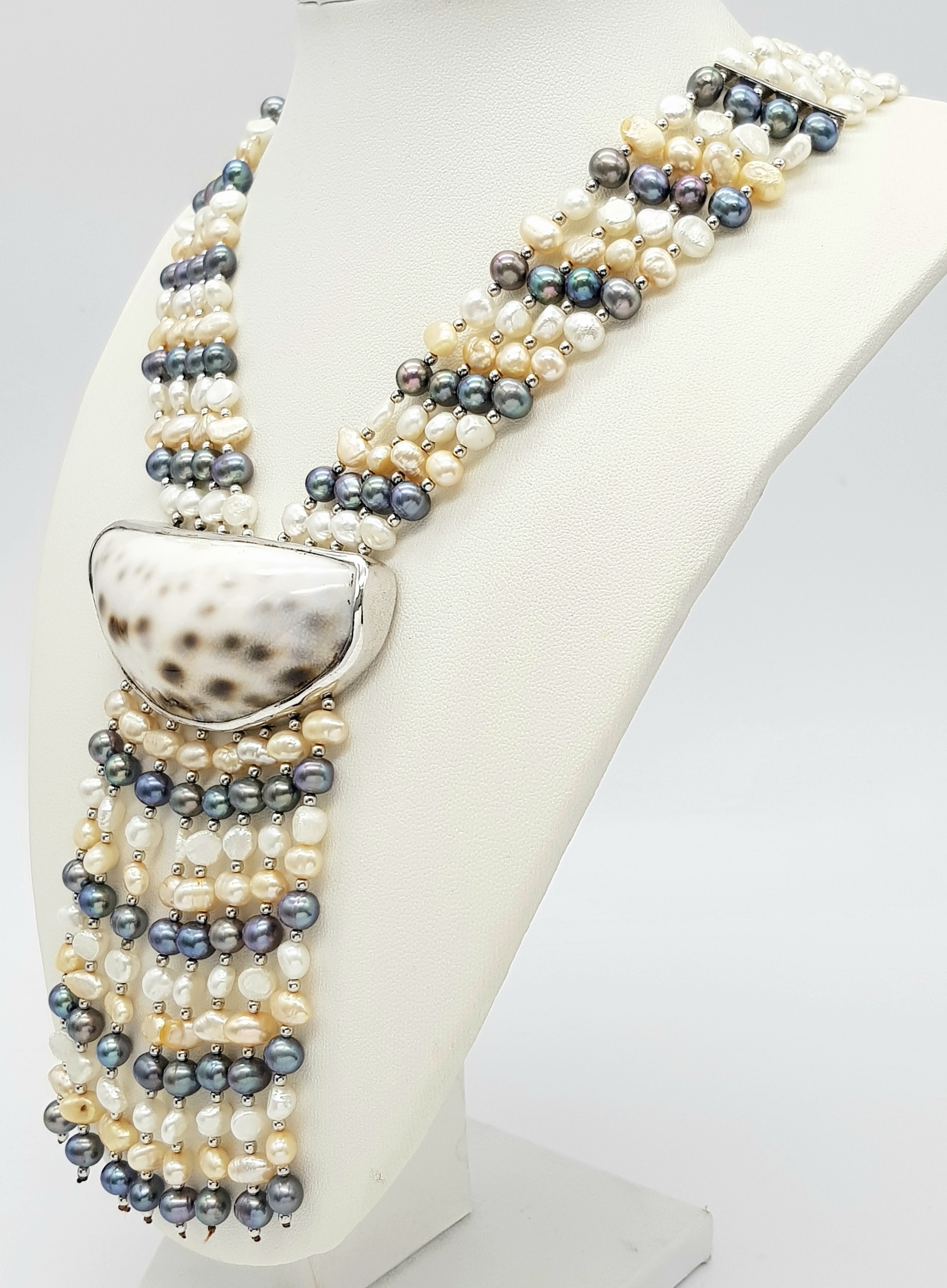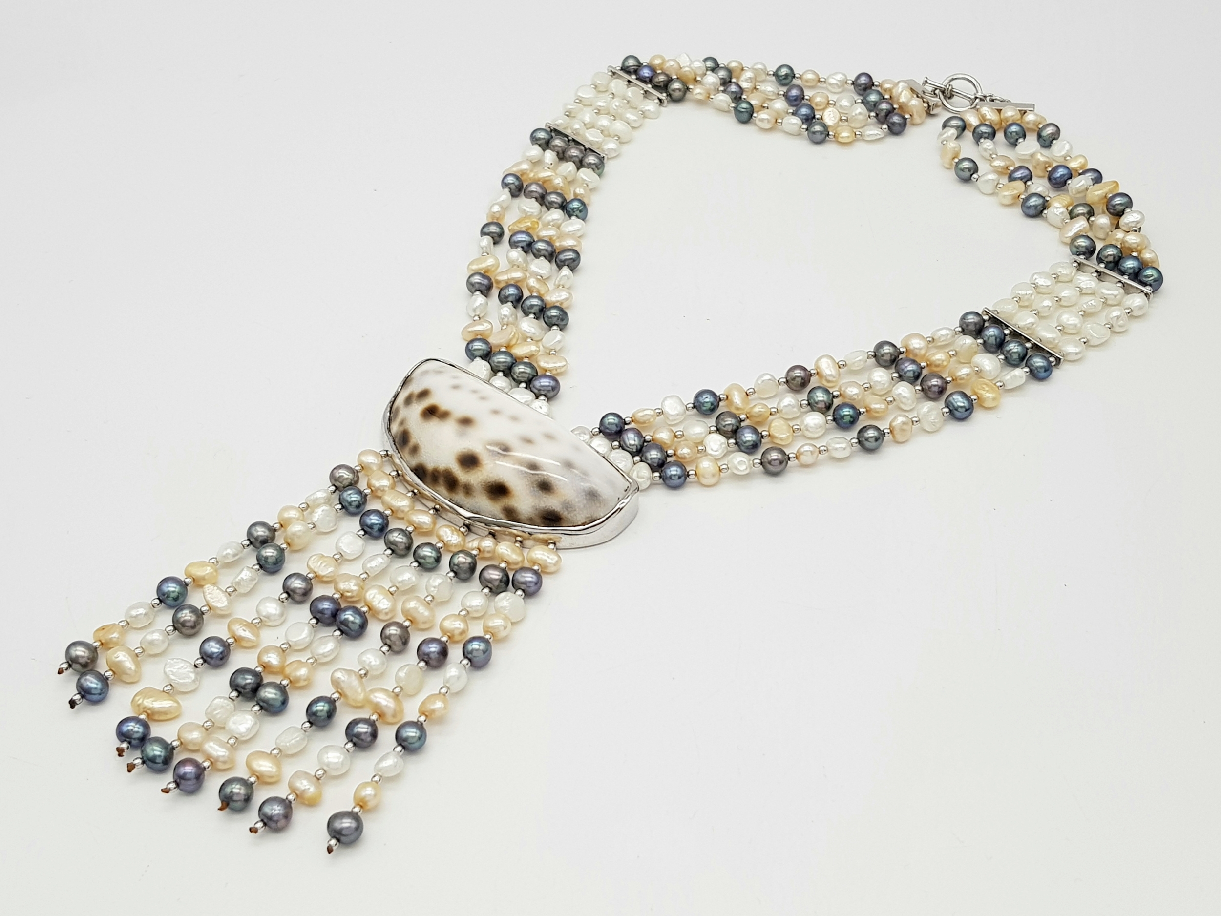 A gorgeous 925 silver Natural Shell and Pearls multi-strand T-bar necklace. Total weight 132.5G. Total length 44cm.