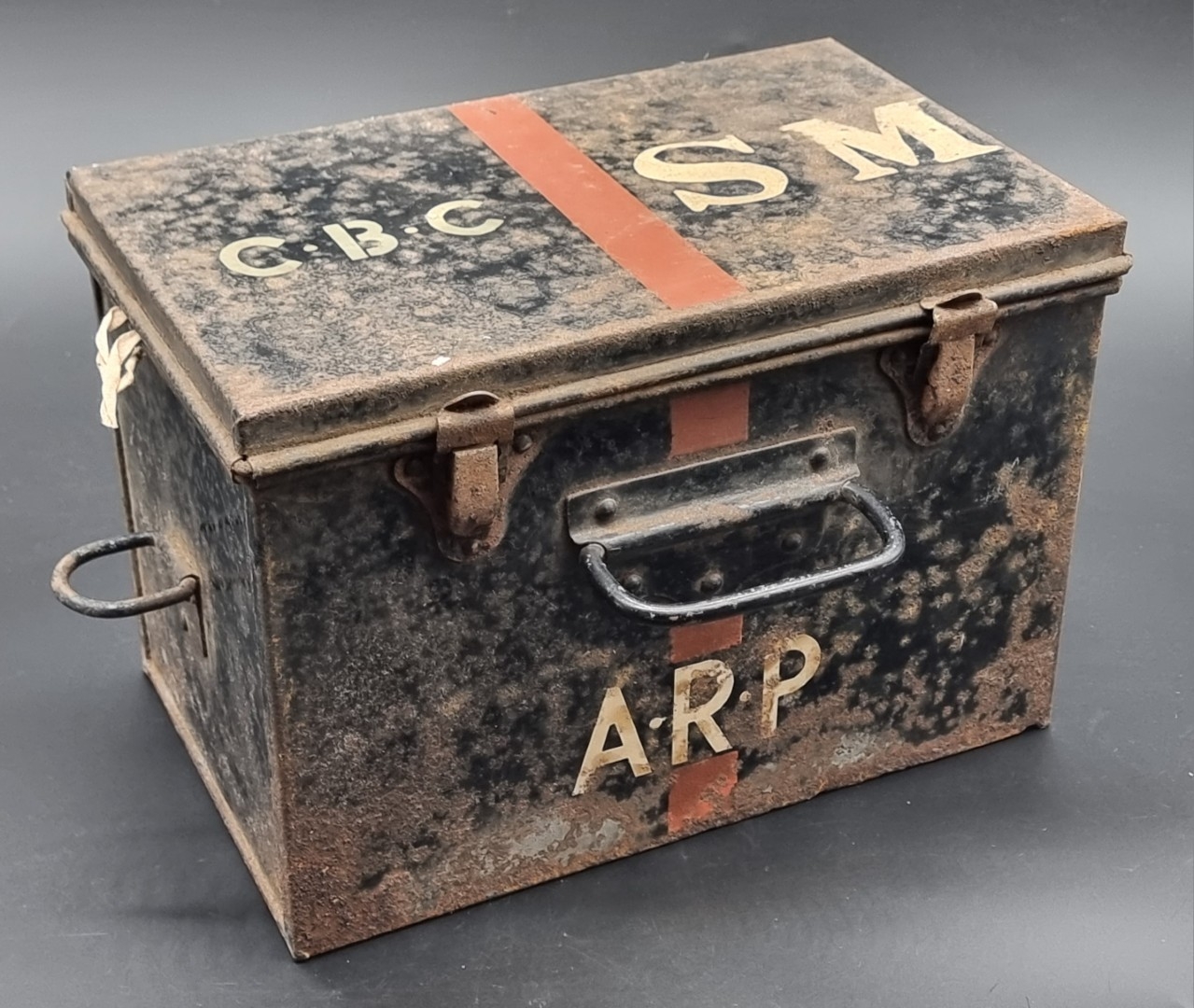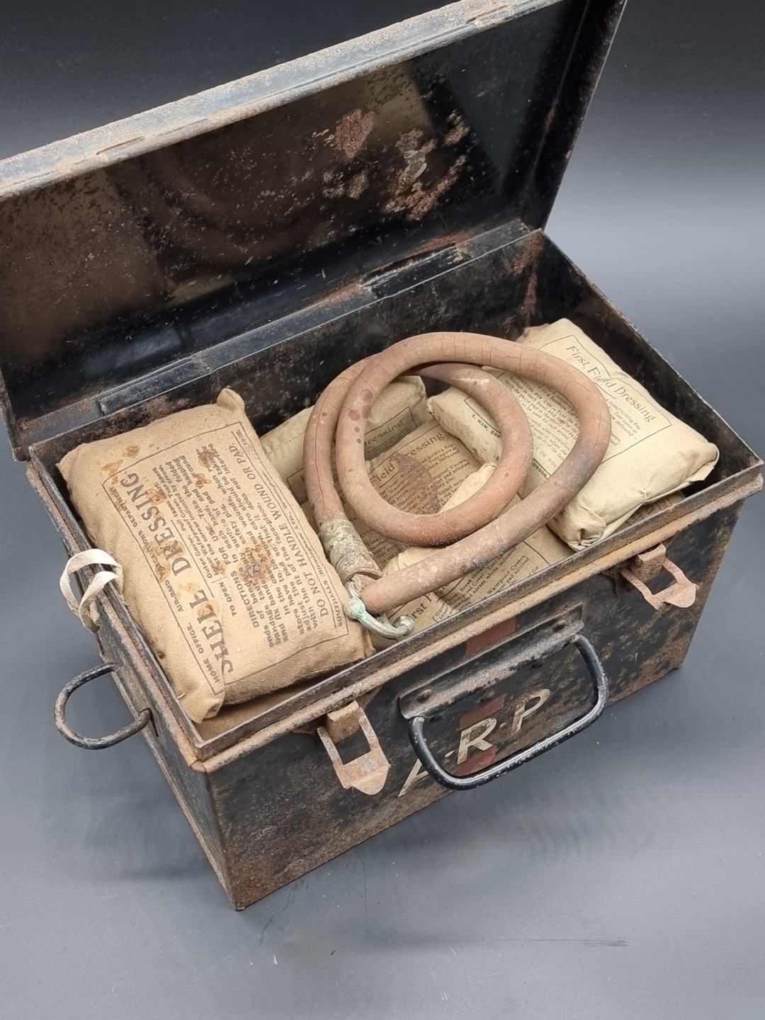 A WWII ARP medical chest, makers mark HBS and dated 1939, with contents.