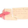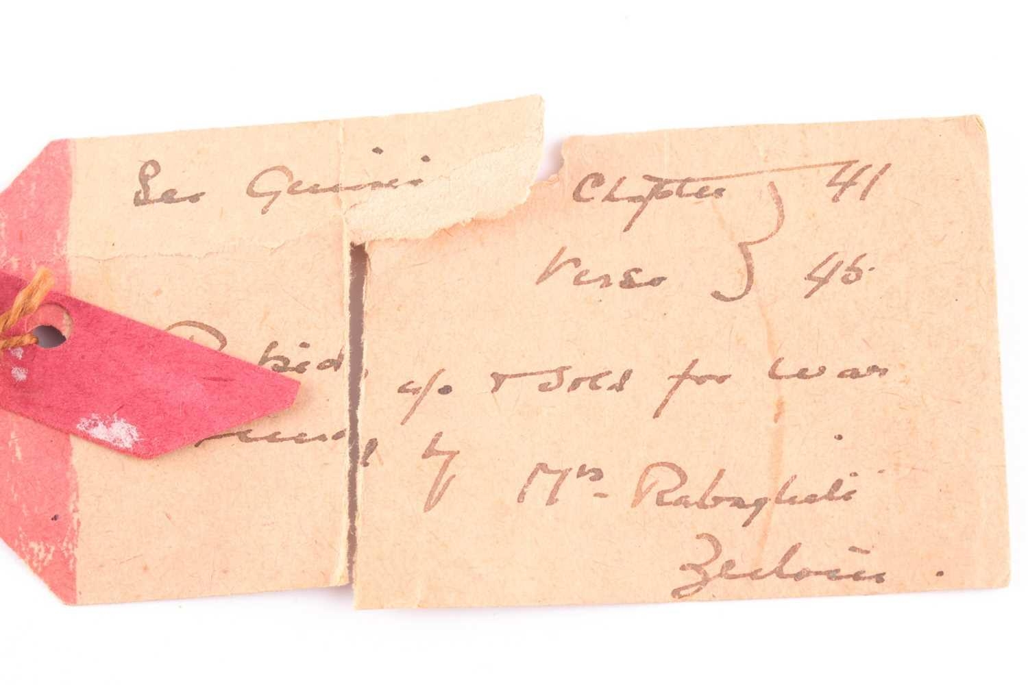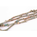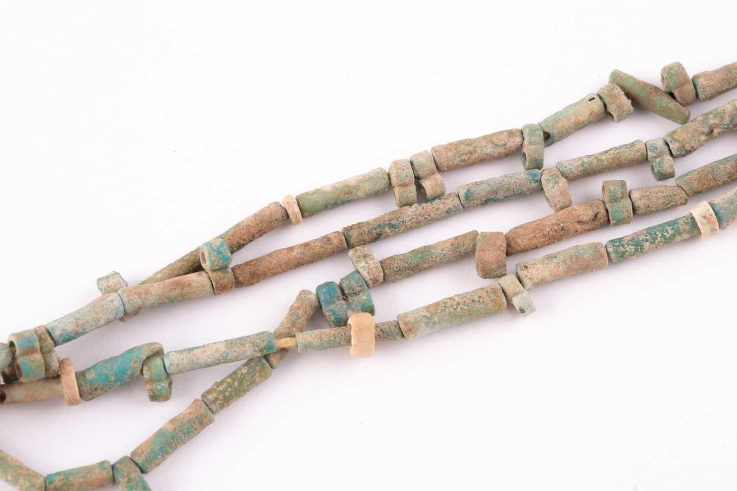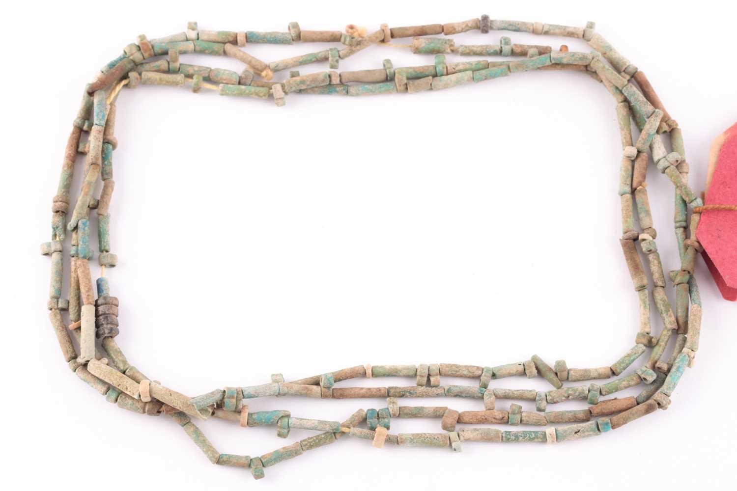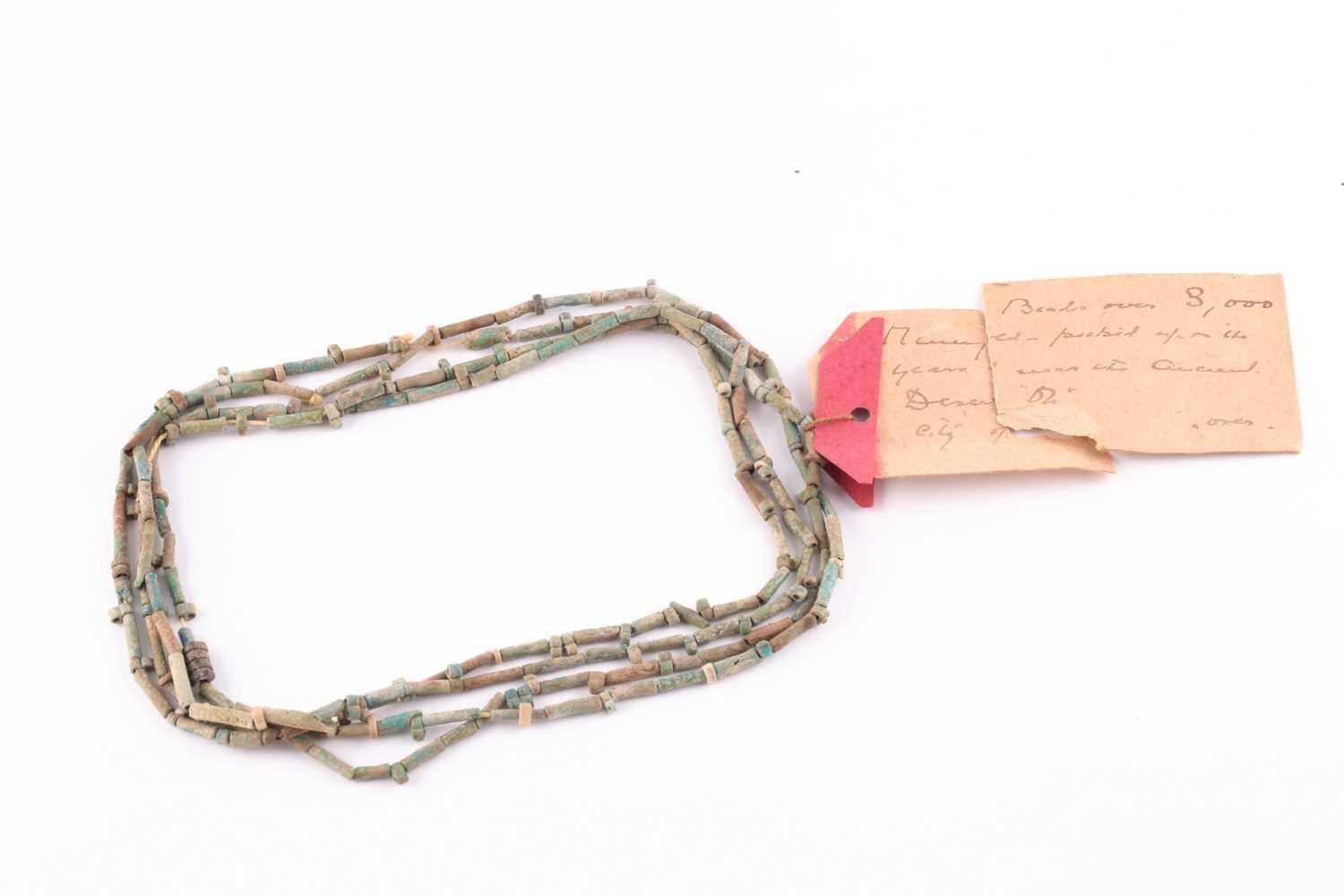 An Egyptian style mummy bead necklace, possibly restrung, comprising vari-shape turquoise-coloured faience and clay beads, double strand, together with attached note (a/f), likely from the mid 20th century, suggesting the beads may be over 3000 years old.