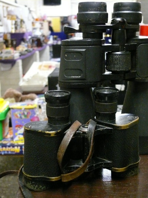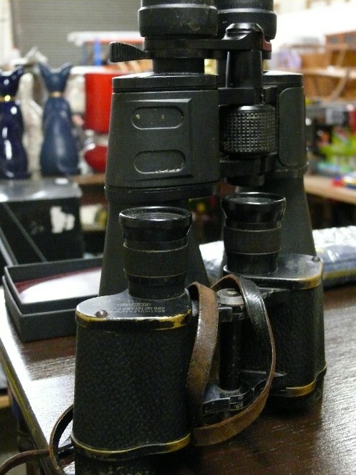 A PAIR OF LARGE 10-30X60 ZOOM BRESSER BINOCULARS WITH A PAIR OF KERCHAD BINOCULARS