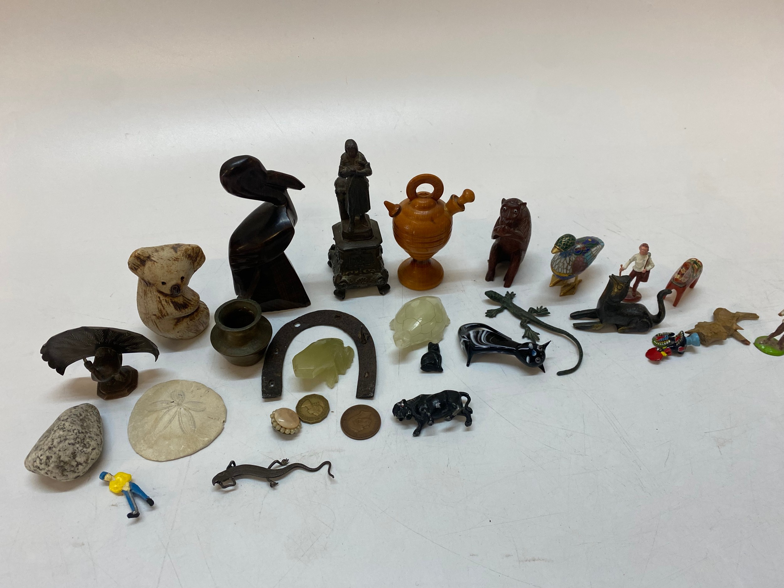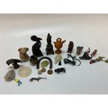 A small Cloisonne model of a duck, a carved wood model of a pelican, a carved wood model of a monkey, glass model of a cat, green onyx tortoise and frog, iron statue, brass peacock, bronzed lizard etc..
