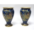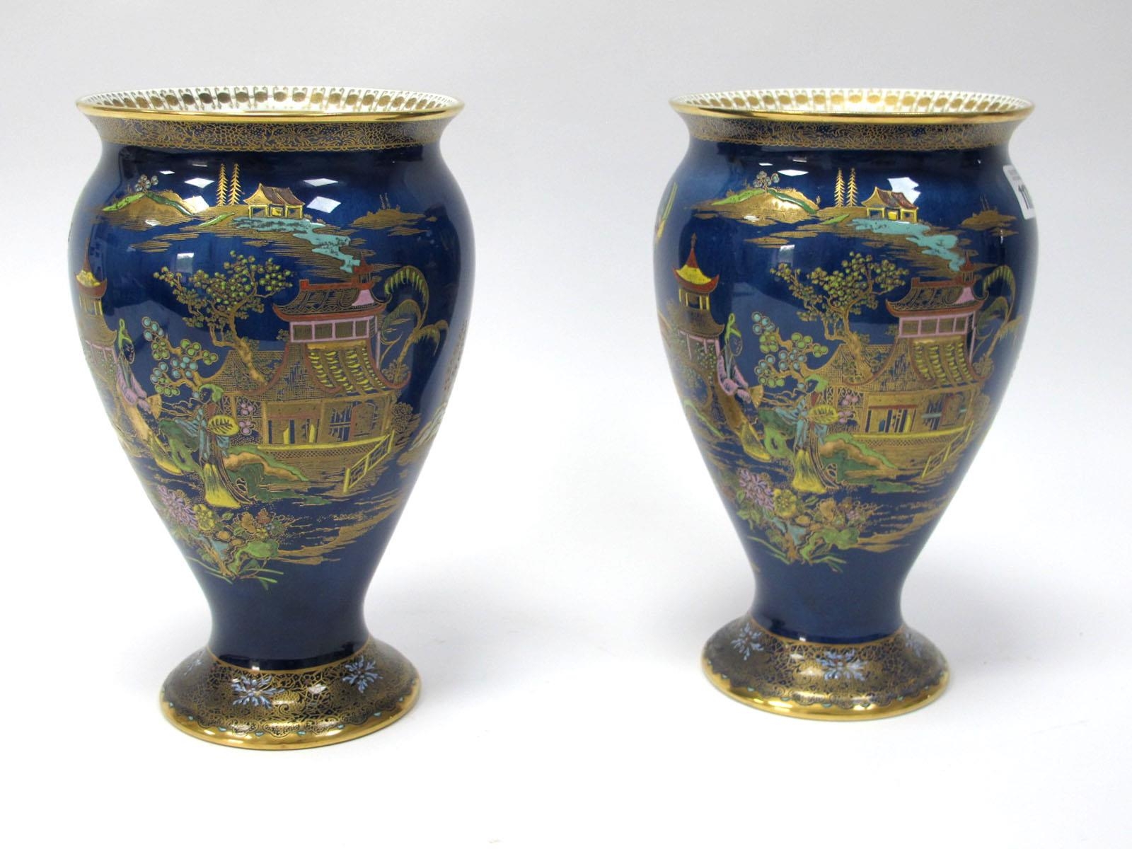 A Pair of Carlton Ware Baluster Vases, decorated with the New Mikado pattern on a blue ground with gilt highlights, 24.5cm high. (2)