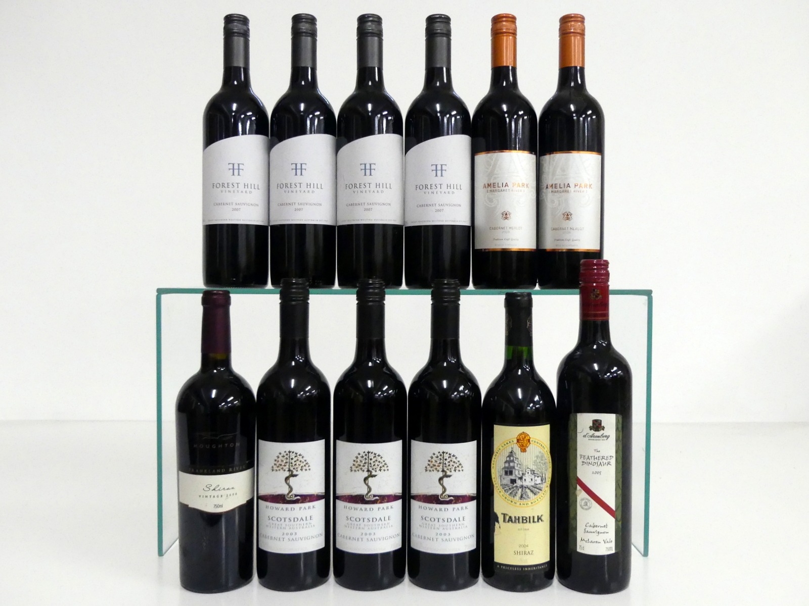 1 bt Frankland River Shiraz 2000 Houghton hf, bs 3 bts Howard Park Scotsdale Cabernet Sauvignon 2003 hf 1 bt Tahbilk Shiraz 2004 Central Victoria i.n, bs 1 bt d'Arenberg The Feathered Dinosaur, Cabernet Sauvignon 2005 McLaren Vale hf 4 bts Forest Hill Vineyard Cabernet Sauvignon 2007 South Western Australia hf 2 bts Amelia Park Cabernet Merlot 2009 Margaret River hf Above 12 bottles