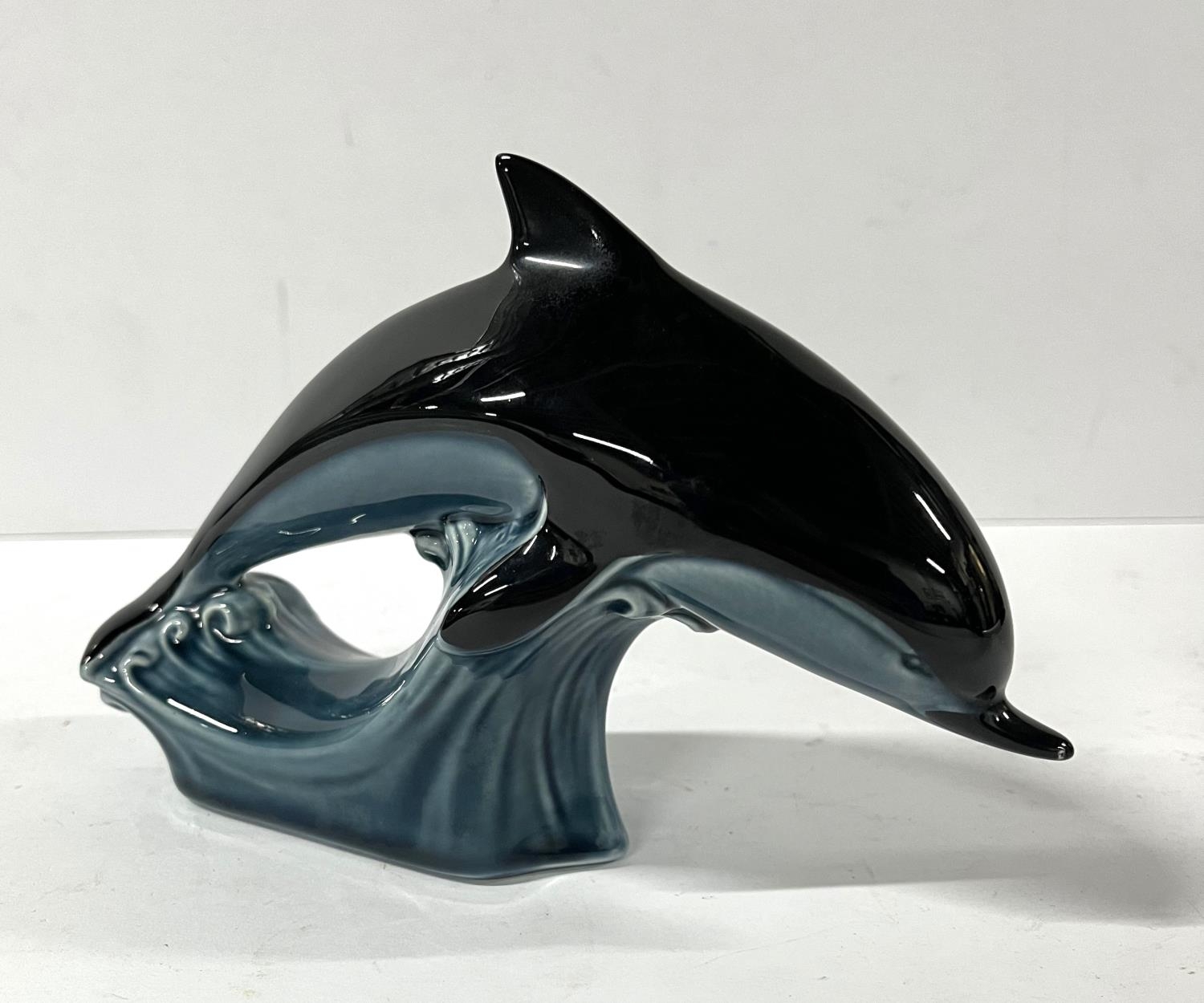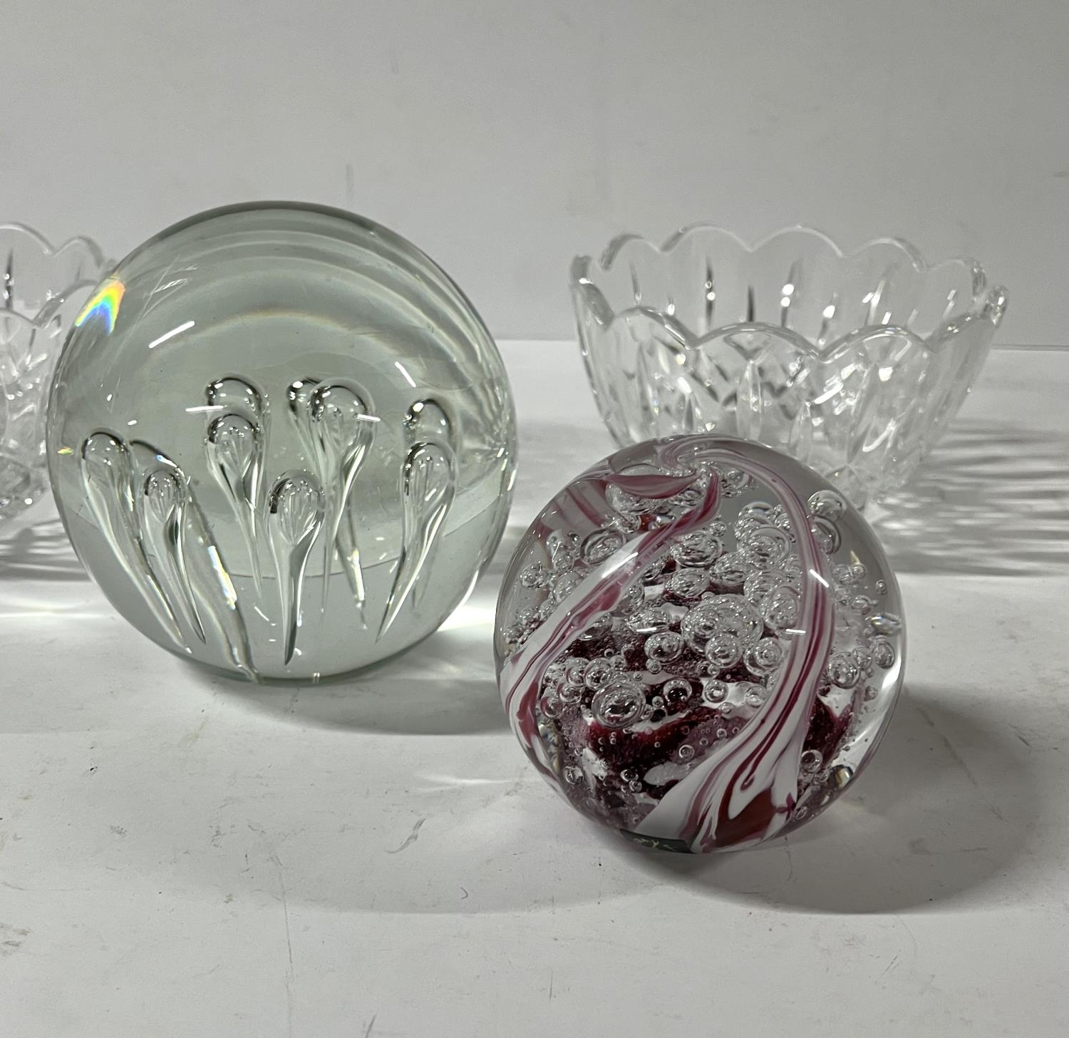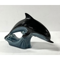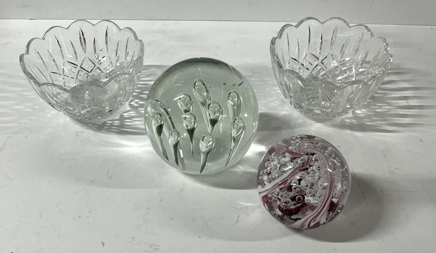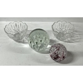 Langham glass paper weight with another and 2 glass dishes along with Poole pottery dolphin