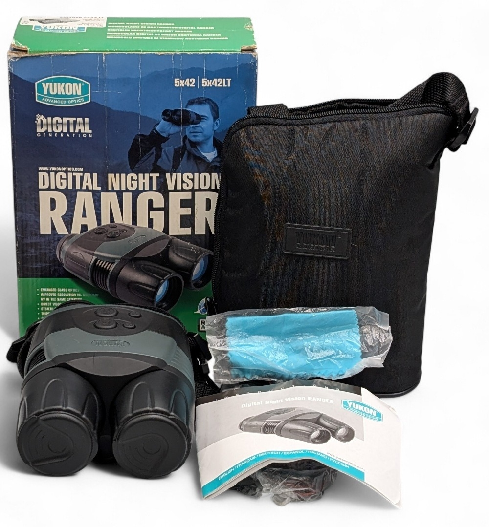 Yukon Advanced Optics Night Vision Rangers, 5x 42LT battery operated glass optics with instructions, carry case, neck strap, output cable, 12v car cable lens cloth - boxed, in good used condition
