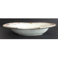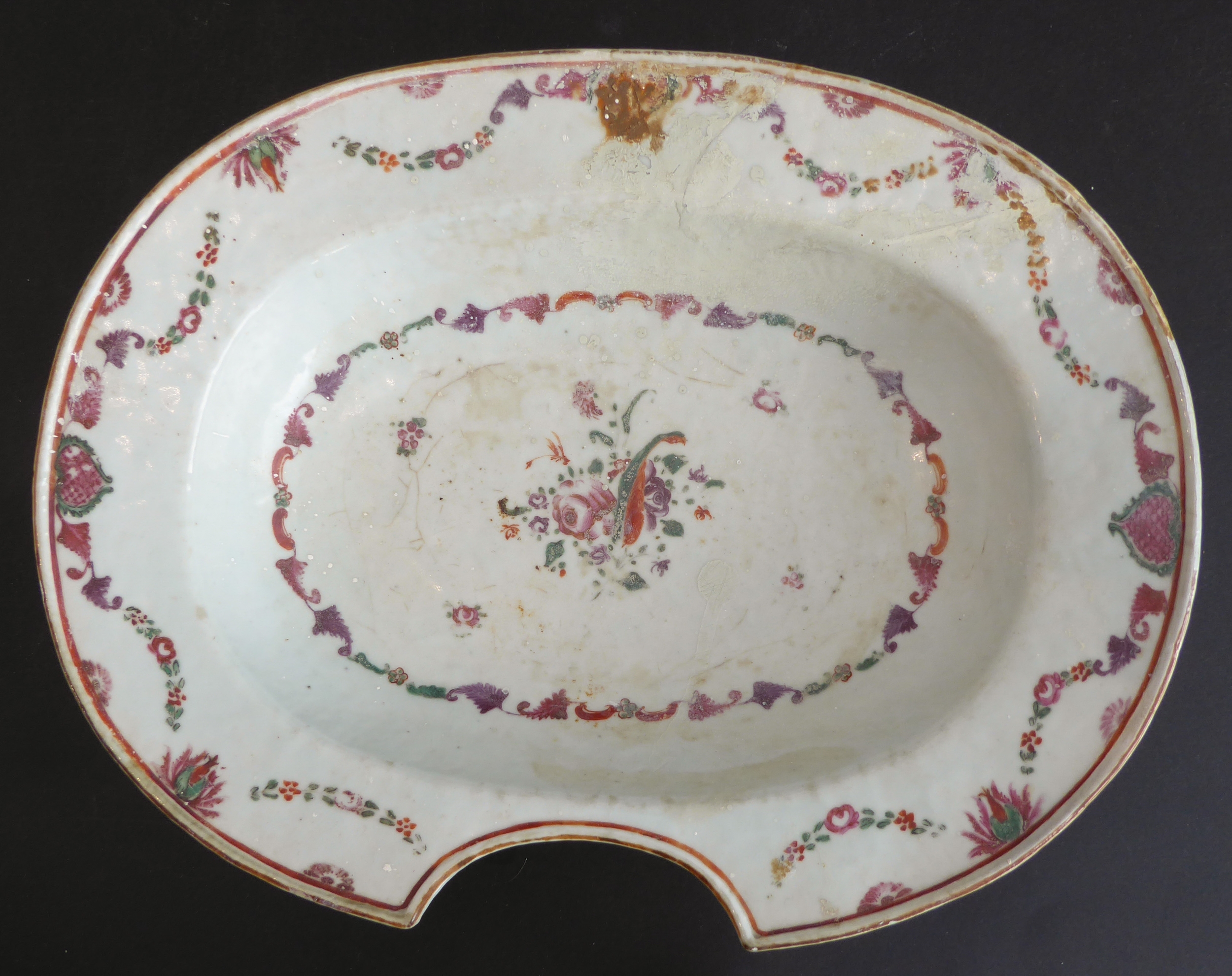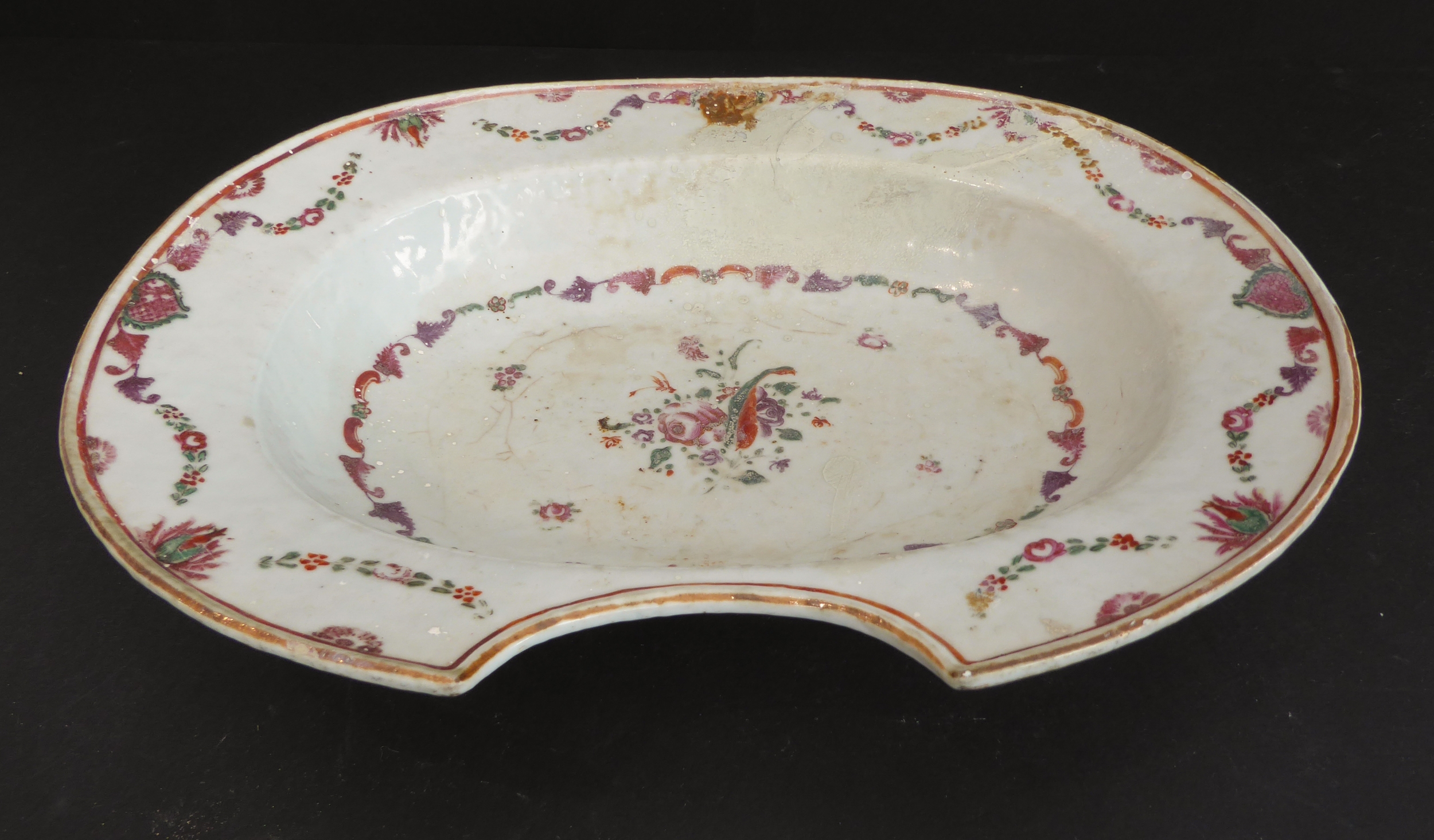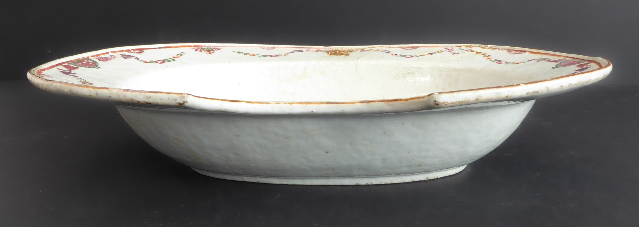 An 18th century Chinese porcelain barber's bowl of oval form (old damage and restorations): decorated with swags and floral sprays (32cm wide x 6.25cm high)