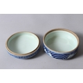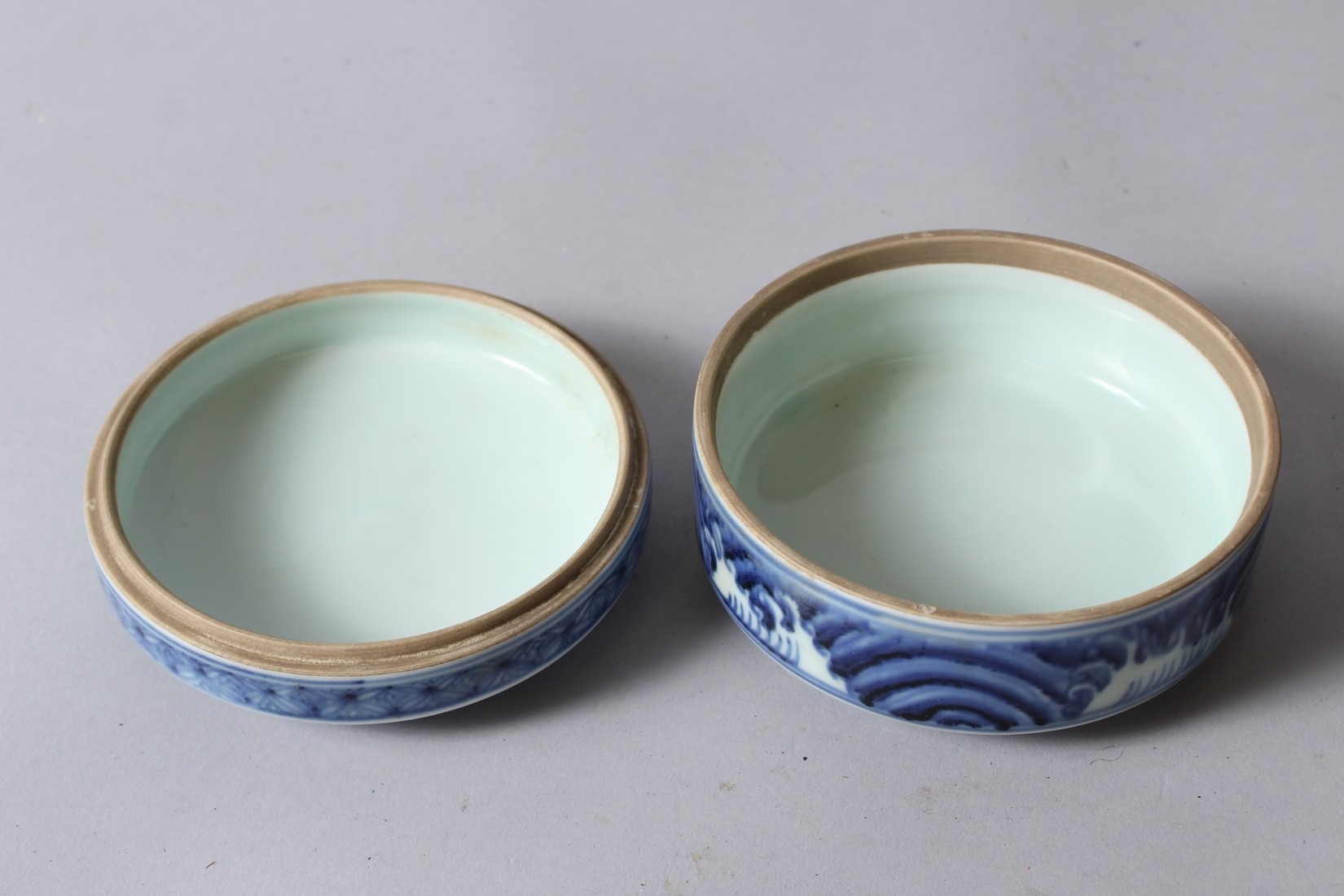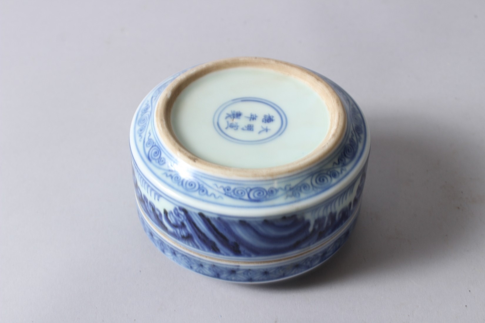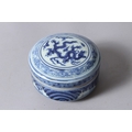A CHINESE BLUE AND WHITE PORCELAIN CIRCULAR BOX AND COVER, painted with dragons, six character mark to base.