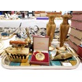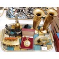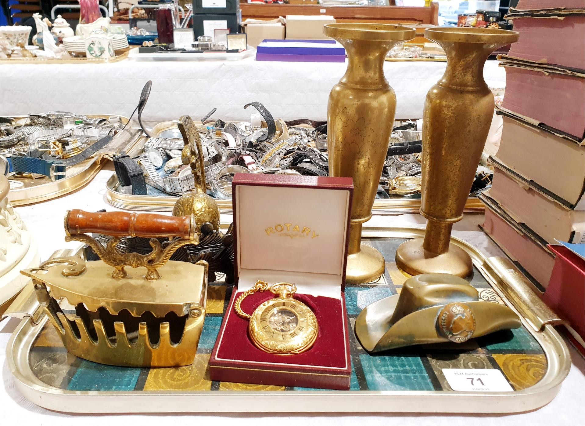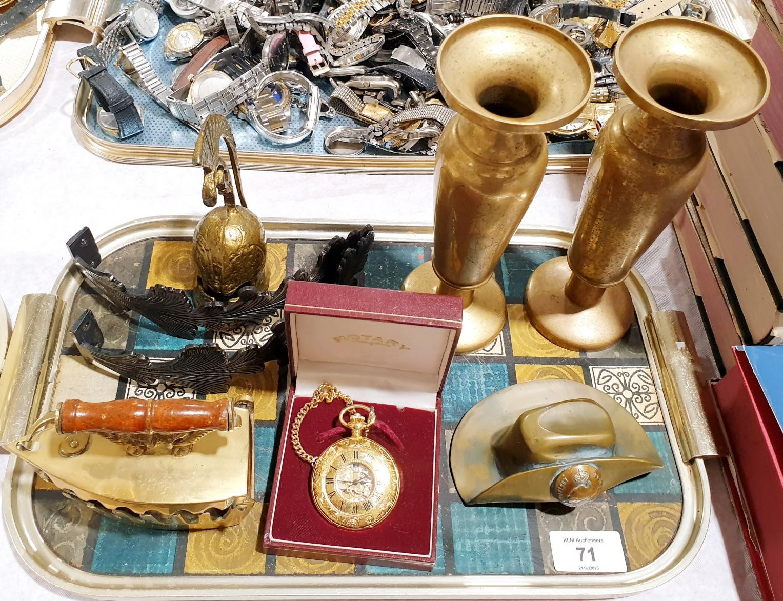 A brass paper weight in the form of a hat with an Australian Military Forces button, length 11.5cm together with other metal ware and a pocket watch. UK shipping £14.