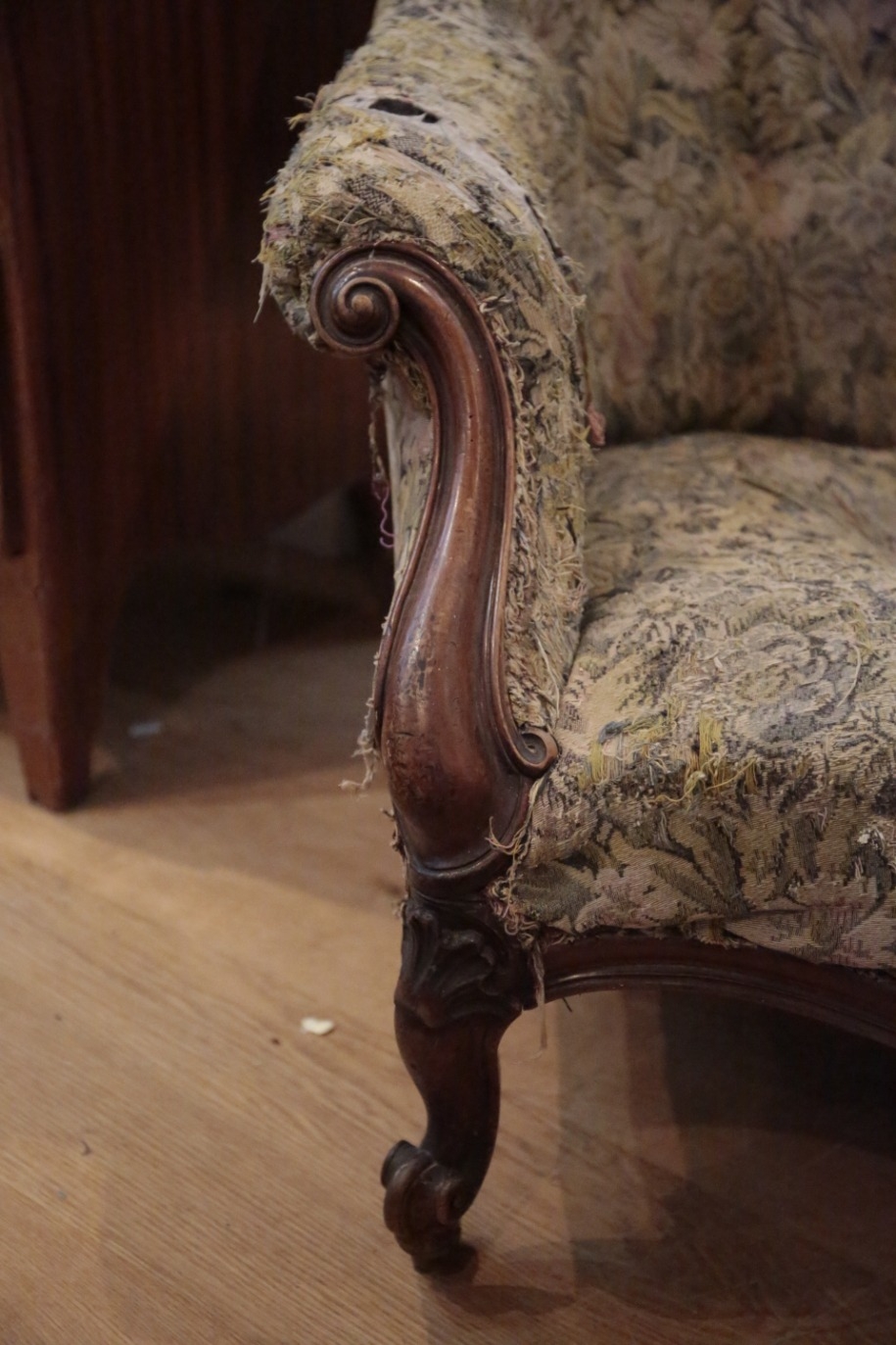 upholstered in leaf tapestry, the back buttoned, with scrolled arms, on cabriole less and castors, 90cm high x 77cm wide x 87cm deep