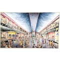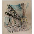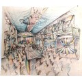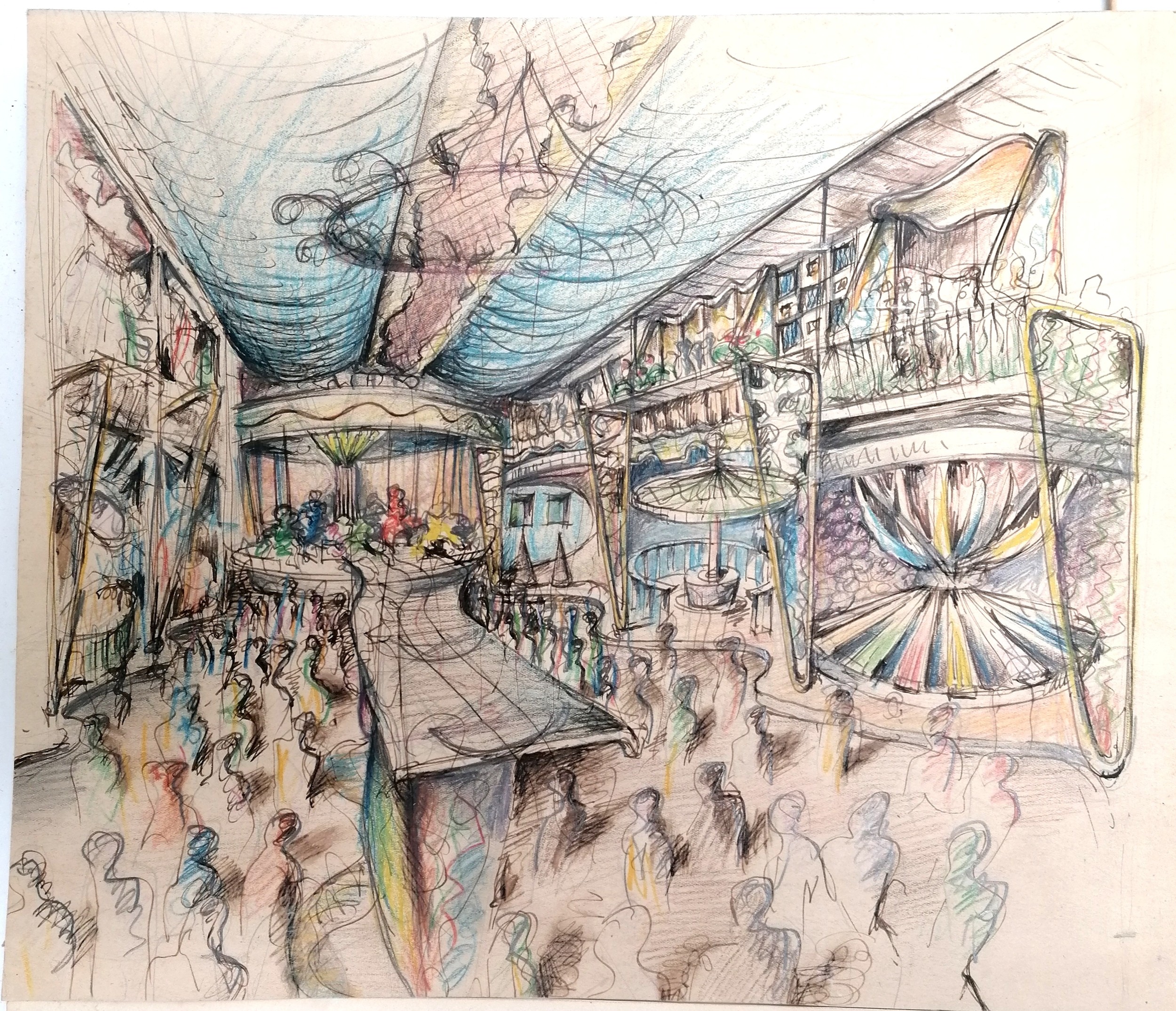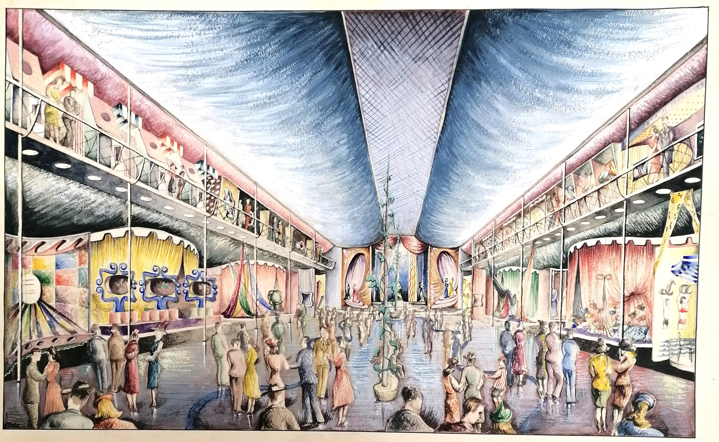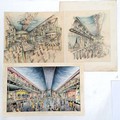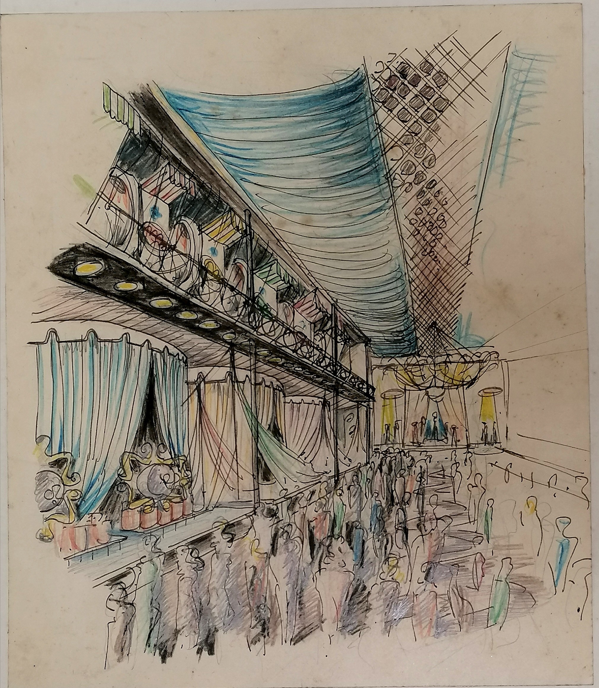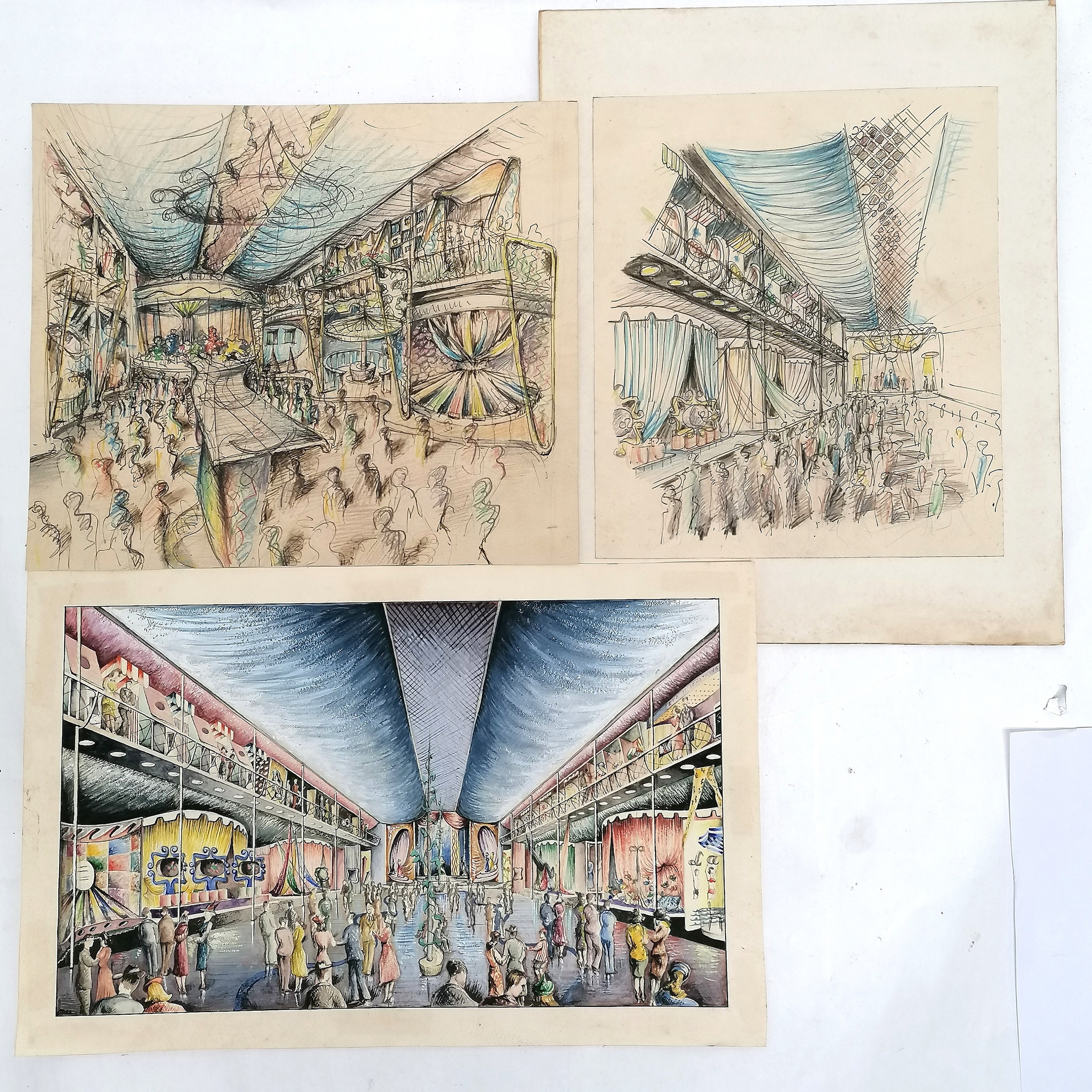 3 x mid century mixed media studies of exhibition / festival scenes - longest 43cm x 28cm