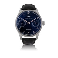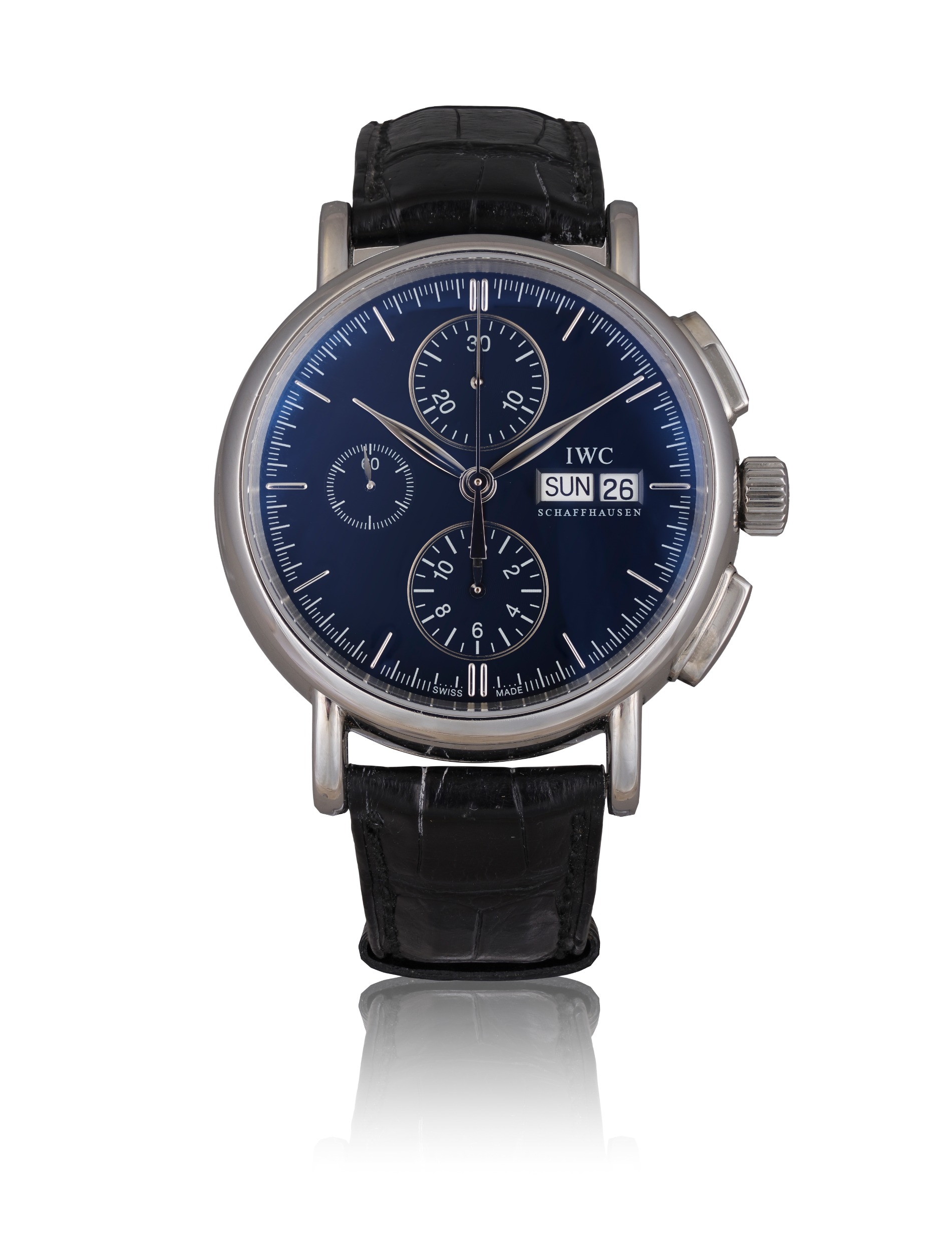 IWC PORTOFINO CHRONOGRAPH, REF. 3783, STAINLESS STEEL A fine and elegant stainless steel automatic chronograph wristwatch with day and date display. Year: Circa 2000s Dial: Black dial with three subsidiary dials, applied baton hour markers and feuille hands, day and date aperture at 3 o'clock, signed IWC Schaffhausen. Calibre: Automatic movement, signed IWC, 25 jewels, N°3058001 Case: Stainless steel case with snap-on case back, N°3331629 Gross Weight: 98.34 g Bracelet/Strap: IWC black leather strap with IWC folding clasp. Signature: Dial, case and movement.