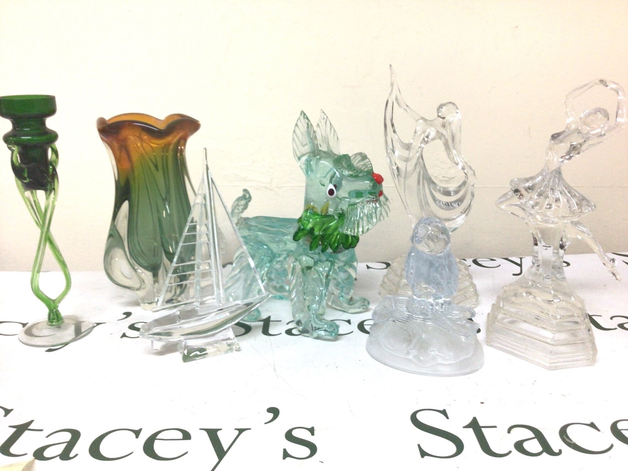 A Murano glass ornament in the form of a dog glass figures dancing ladies a Murano glass vase and a sailing boat and other glass ornaments.