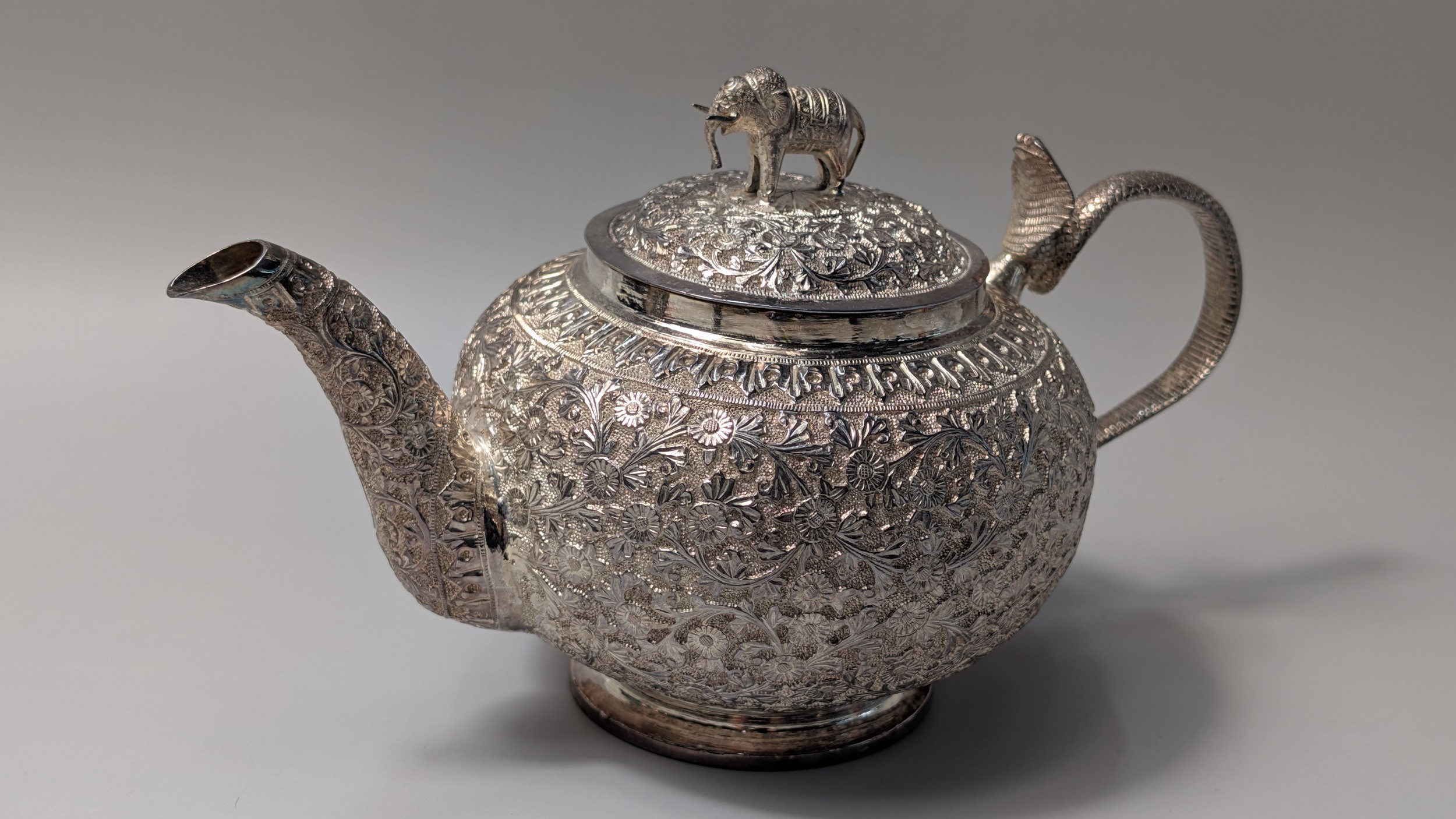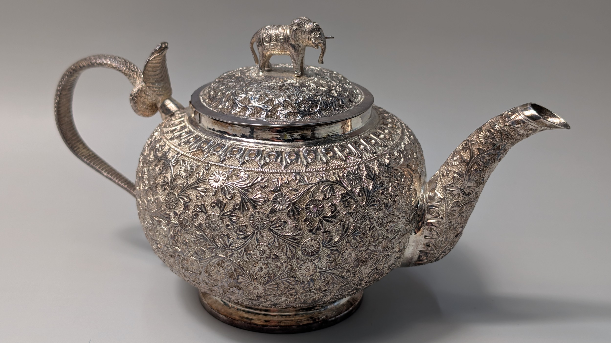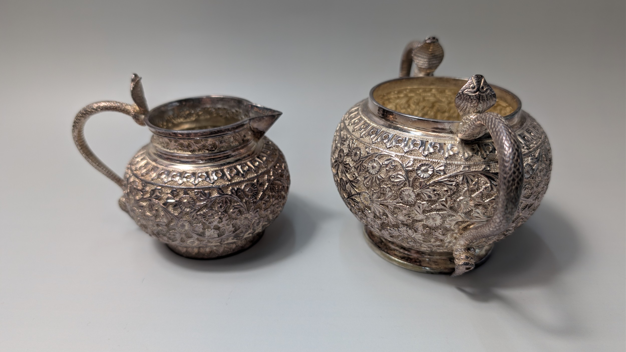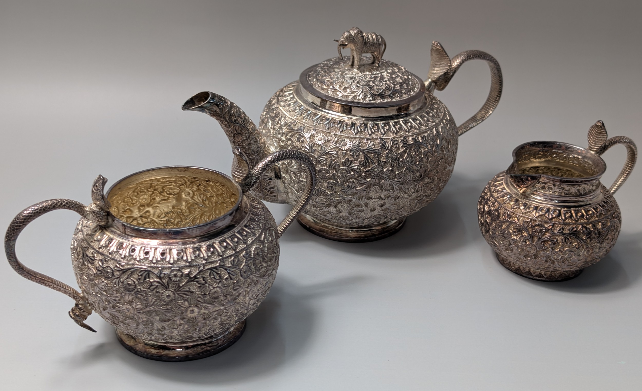 Indian white metal three-piece tea set, the globular bodies with foliate decoration, cobra handles and the teapot with an elephant finial, teapot height 12cm, gross weight 900 grams