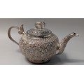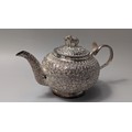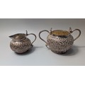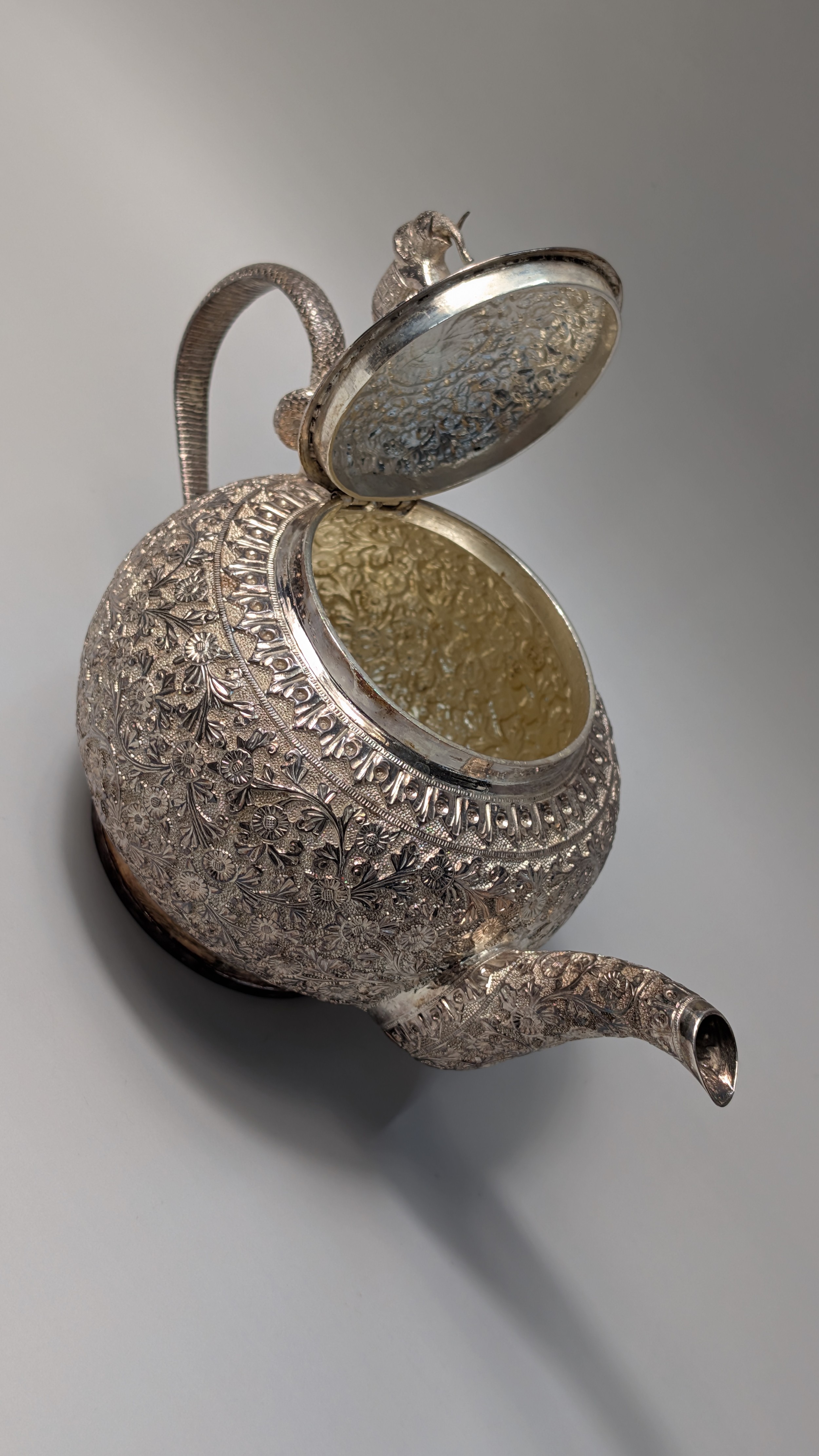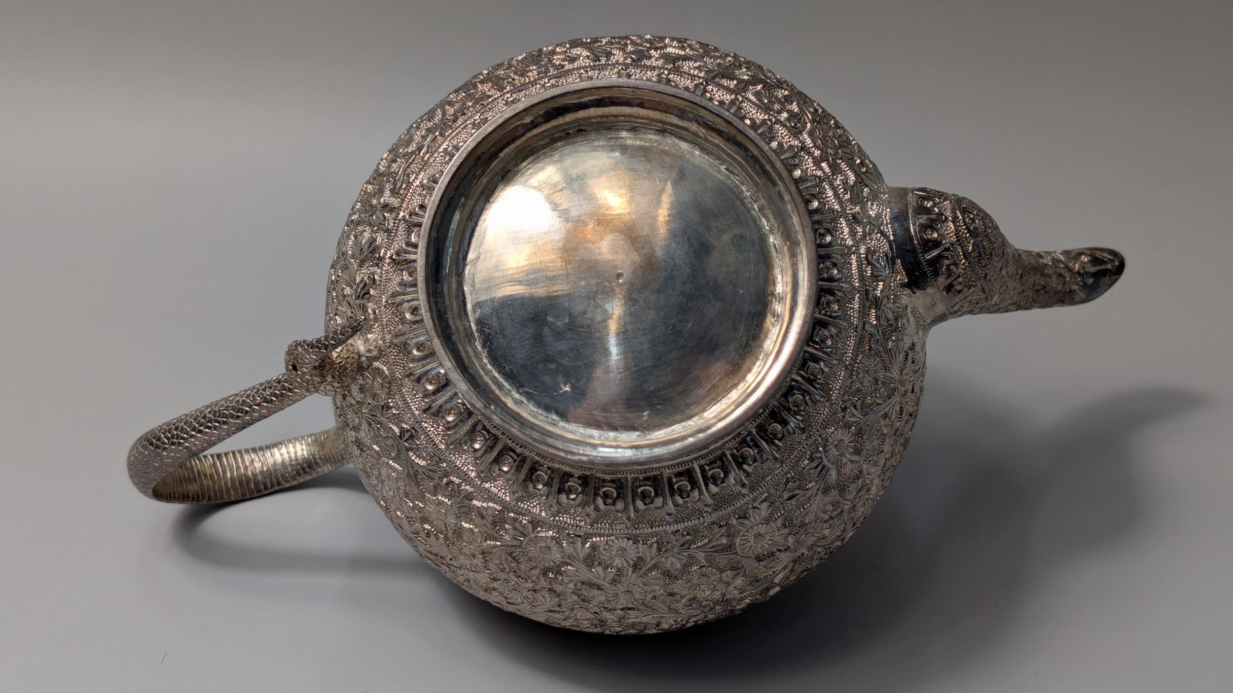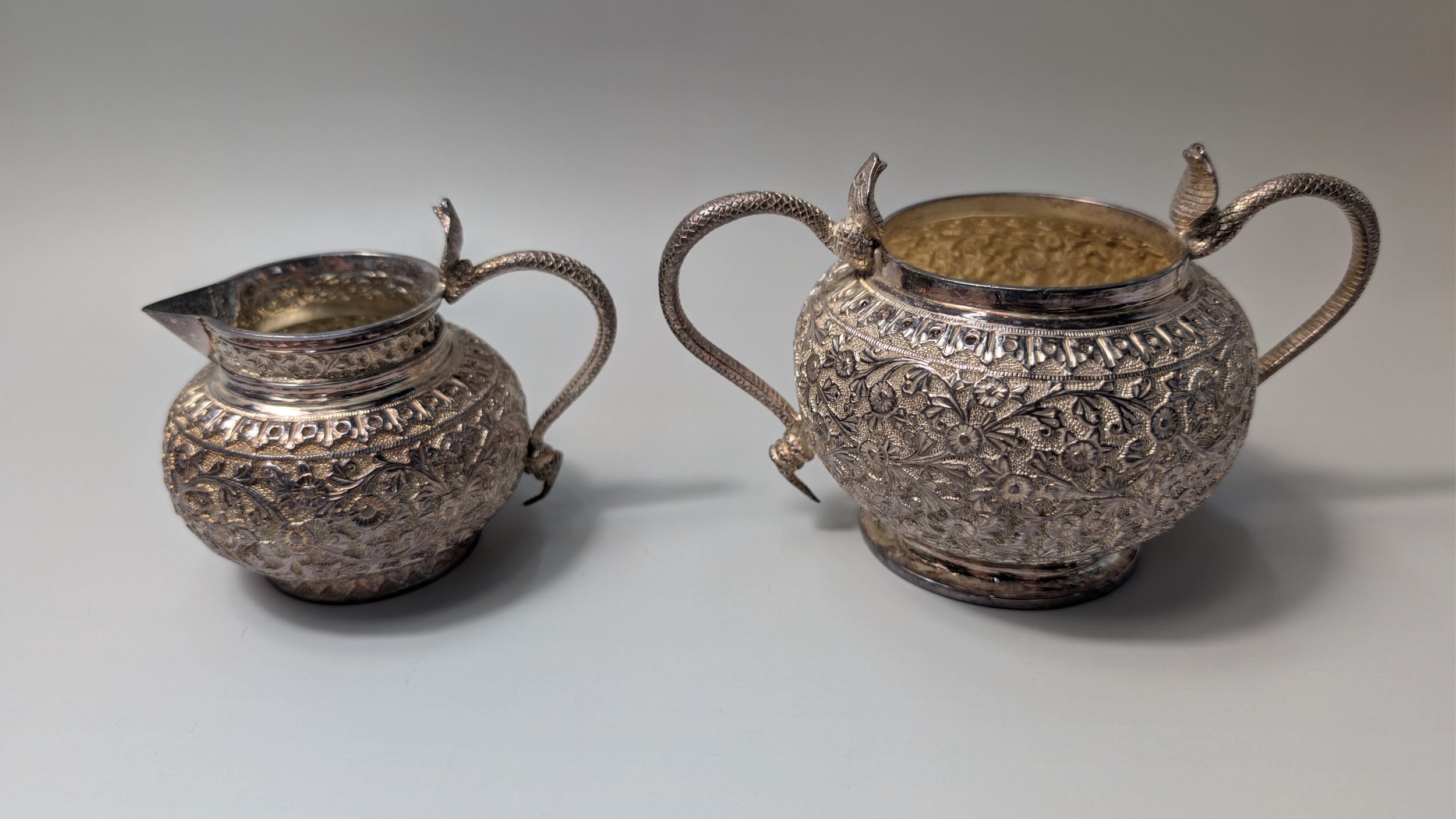 Indian white metal three-piece tea set, the globular bodies with foliate decoration, cobra handles and the teapot with an elephant finial, teapot height 12cm, gross weight 900 grams