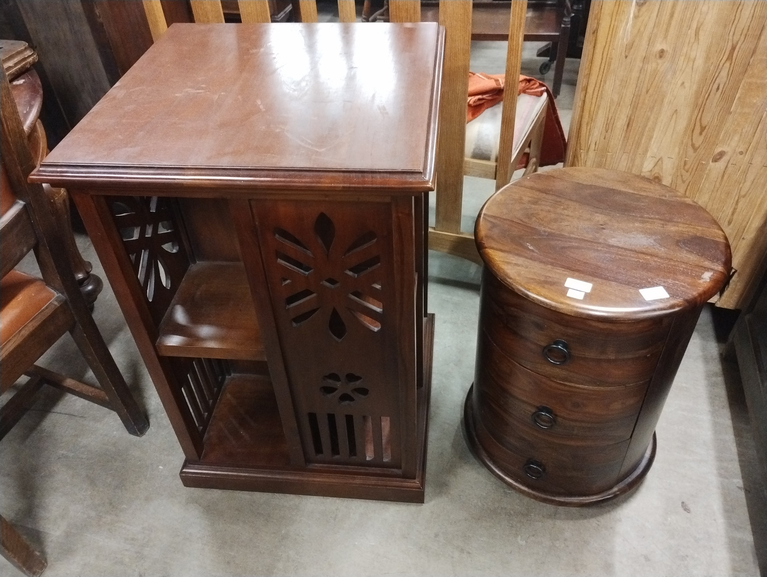 A French style hardwood revolving bookcase and a cylindrical chest